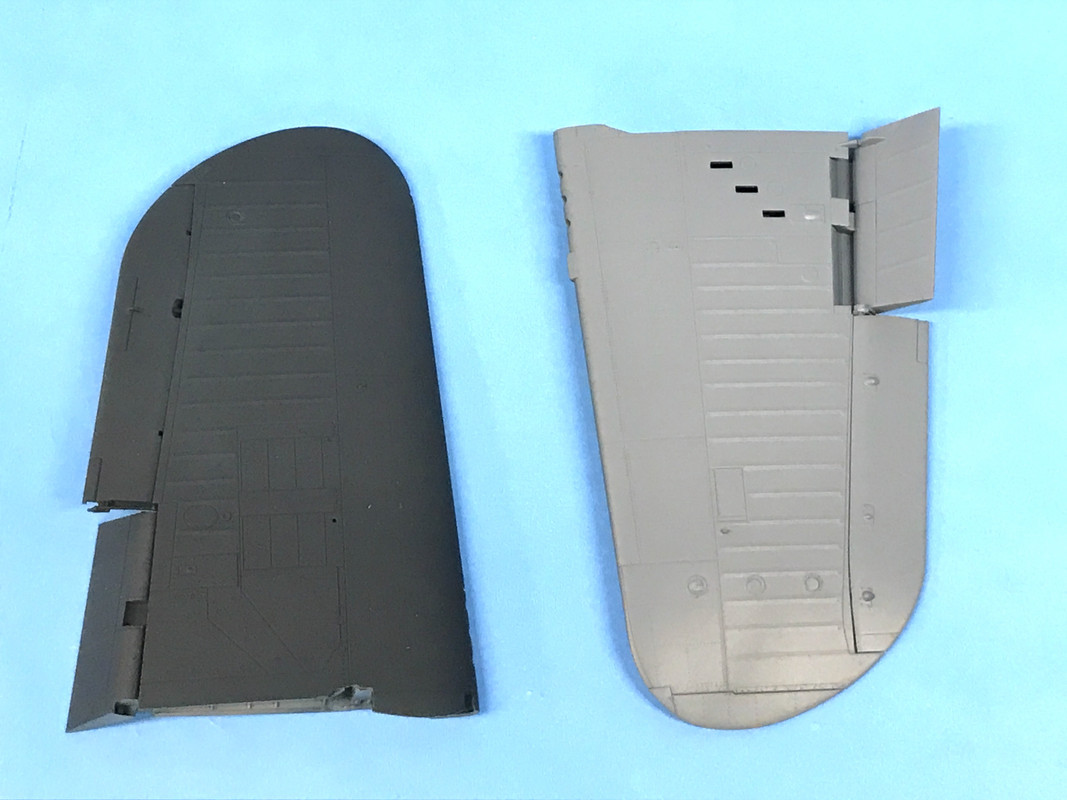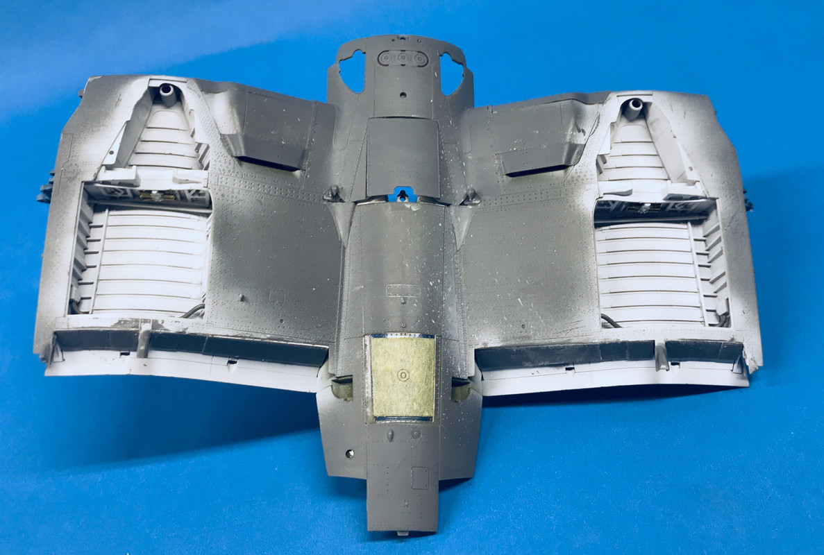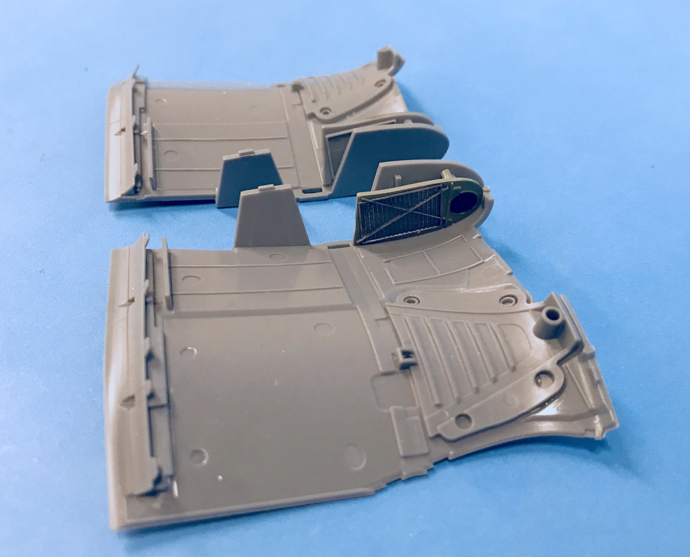On the bottom of the upper wing skin there are three parts on each side: the intercooler face at the wing root, the ceiling of the forward wheel well and the reverse curved fairing that contains the flaps. You have to constantly pay attention to whether you’re building a “flaps up” or “Flaps down” version since there are different fairing parts in the flap area. I’m building “flaps down”.