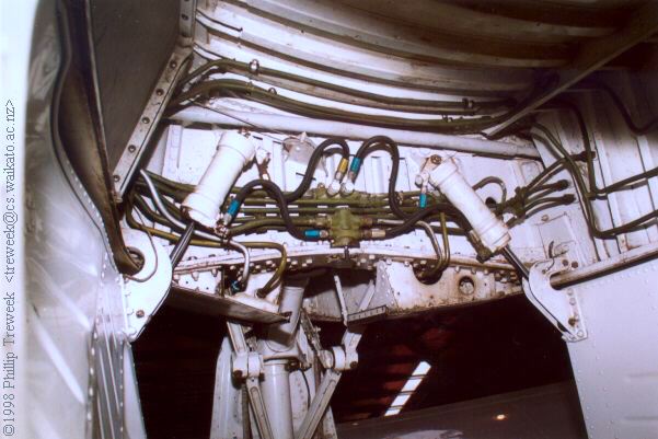 Here’s all the hardware set into the fixed wing portion of the wing fold. There’s also a valve body that goes into the folded wing area and piping associated with it. It’s basically a swivel that permits the hydraulic lines to pivot around the wing-fold hinge line to get the fluids to the ailerons which are also hydraulically assisted.
