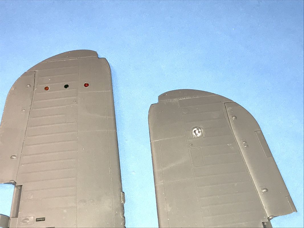The last thing I did was to paint the clear lenses for all the running and landing lights. Letting them dry overnight will ensure they don’t get finger-printed. The kit includes a mask for the landing light lens. I’m going to glue the small ones in with Bondic with the color on the inside and then use MicroScale liquid mask before painting the outboard wings. They get painted and decaled off the model or else you’ll never be able to decal the folded side of the wing. This complicates finishing up the piping at the wing joint, but I’ll manage.