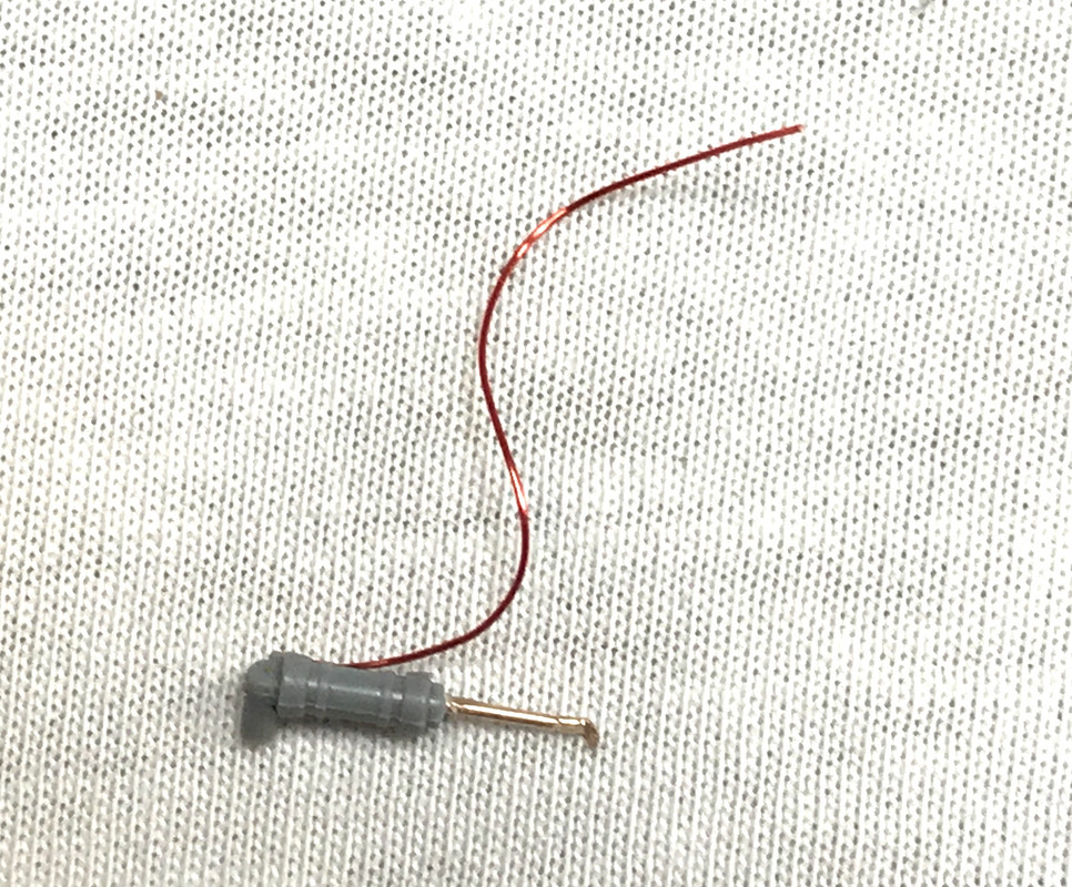 After cutting off the plastic strut, I had to drill the remaining lug with an 0.022" carbide bit held in my fingers. I used and even finer drill to start the hole in the lug’s center.