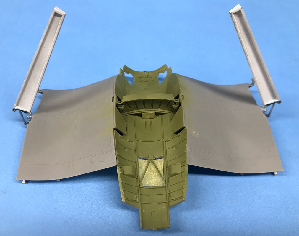 Here are the complete wings minus the outboard flaps (tomorrow). I really like how Tamiya makes you think that there’s really working hinges in there and yet they’re securely glued into the wing sockets.