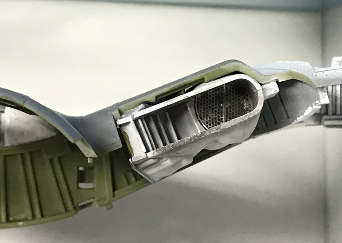 The leading edge fairings for the cooler inlets went on nicely and the innards look pretty good. If you were able to peer through the louvers, which you can’t really do very well, you would be able to see the intercooler facing. But I know it’s there.