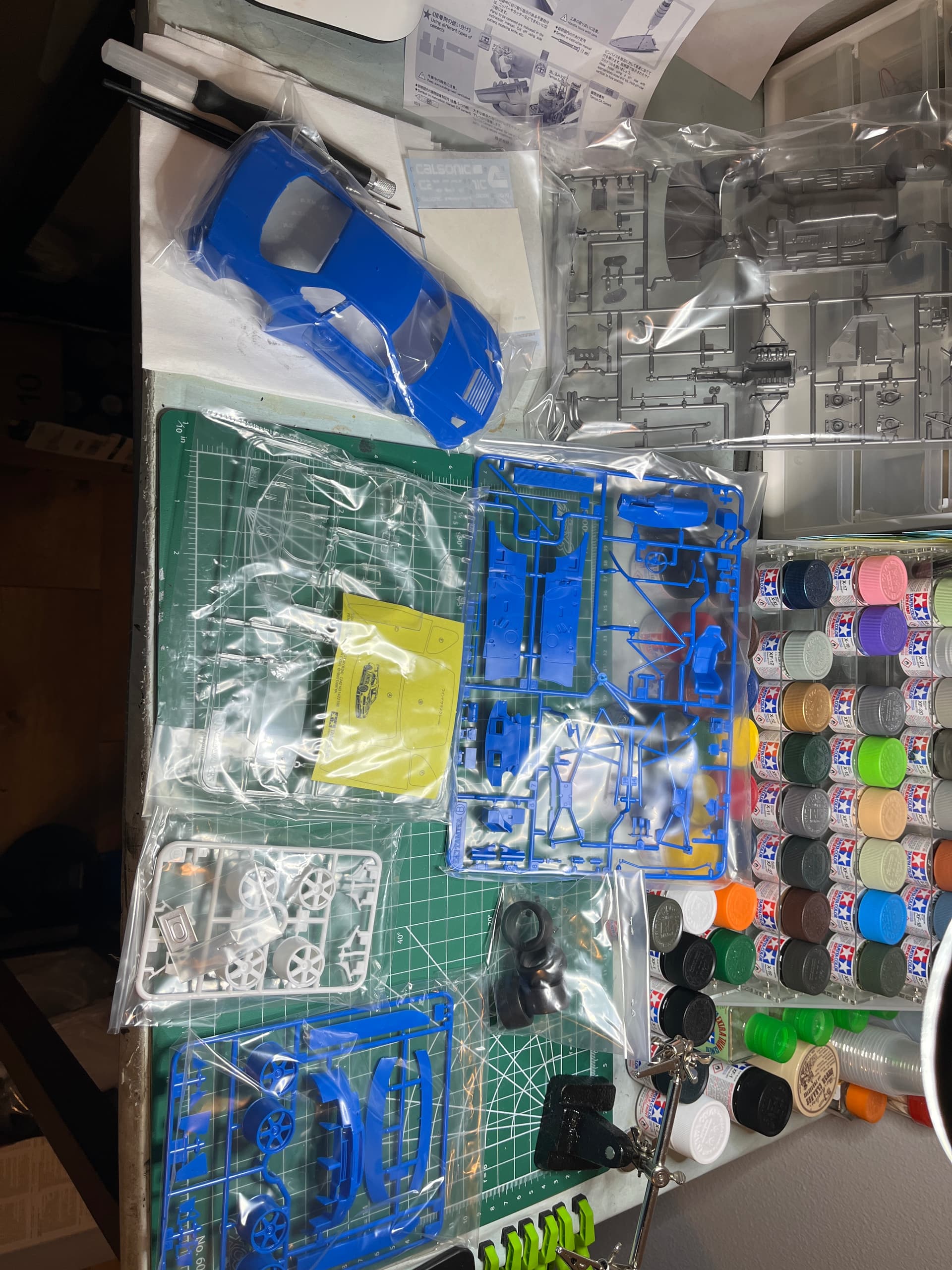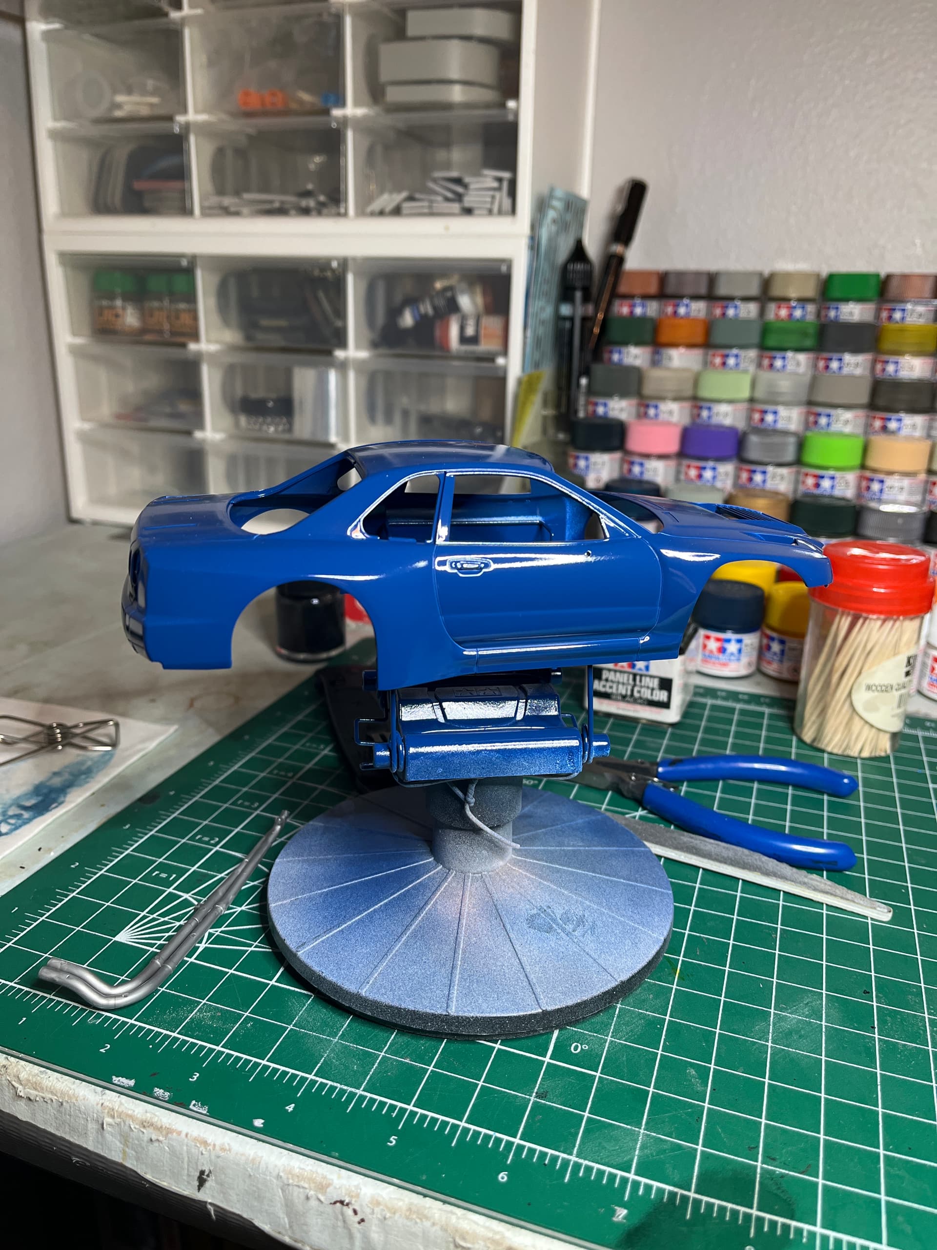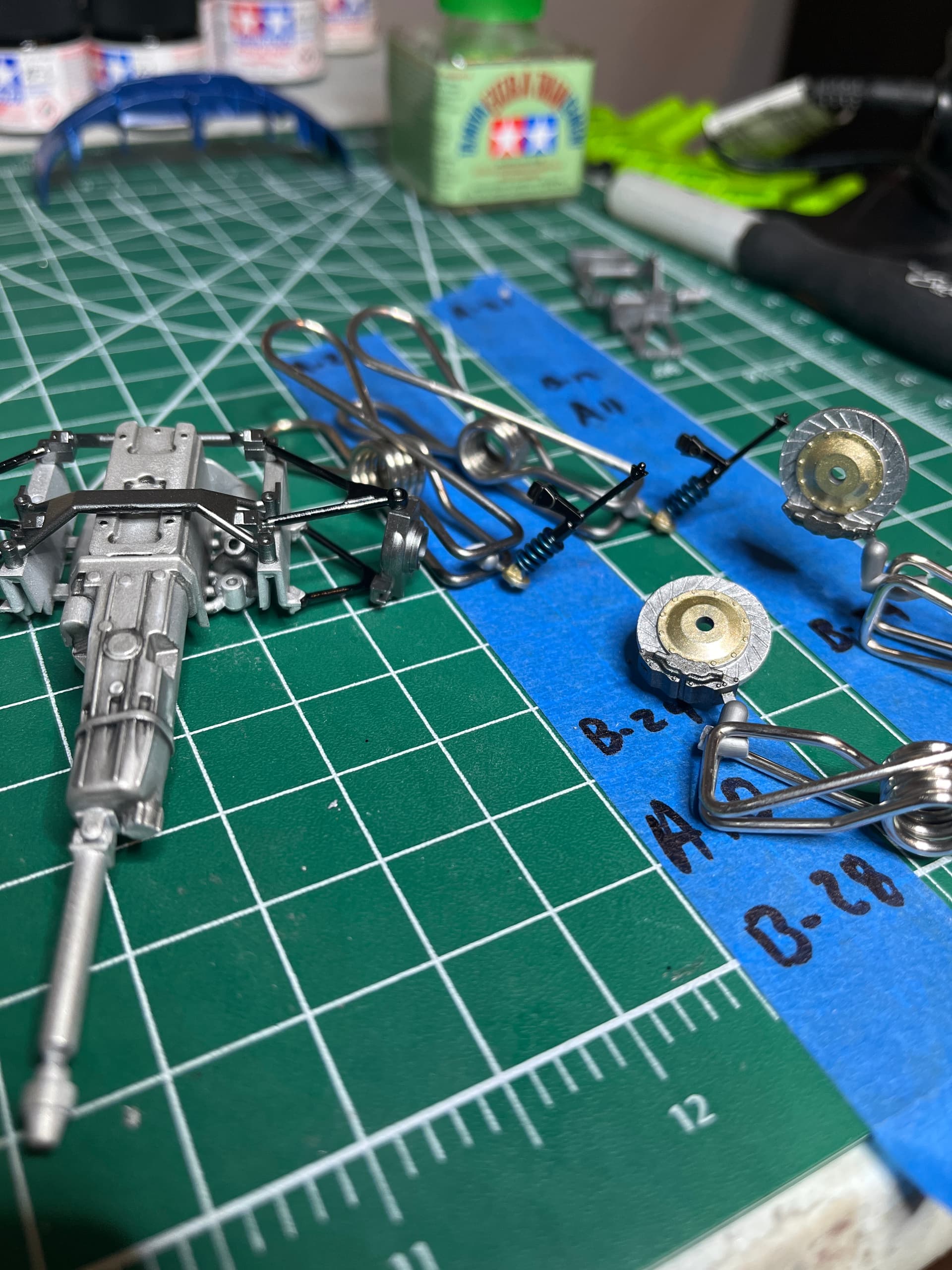 Got some time today, shot the body with Tamiya TS-15 blue, shot the under carriage with Tamiya TS-14 black, got the front suspension and brakes painted up. Just letting things dry a bit.