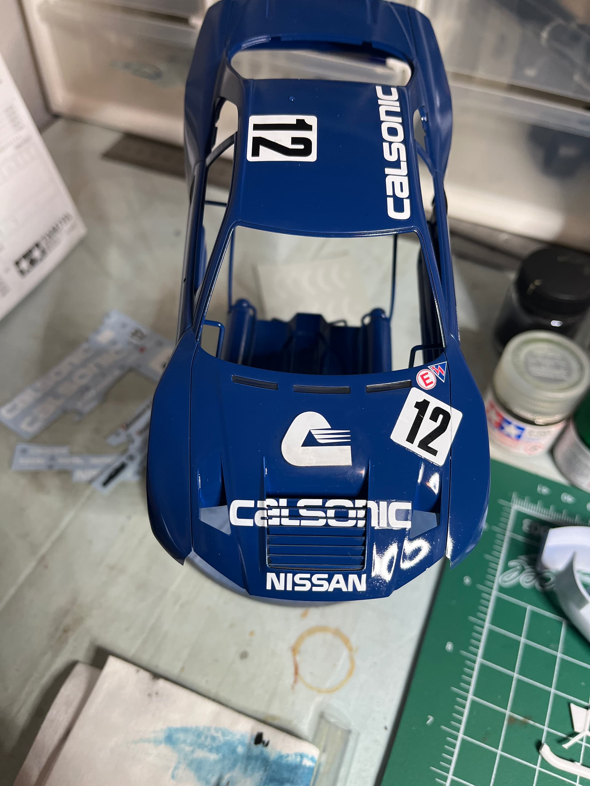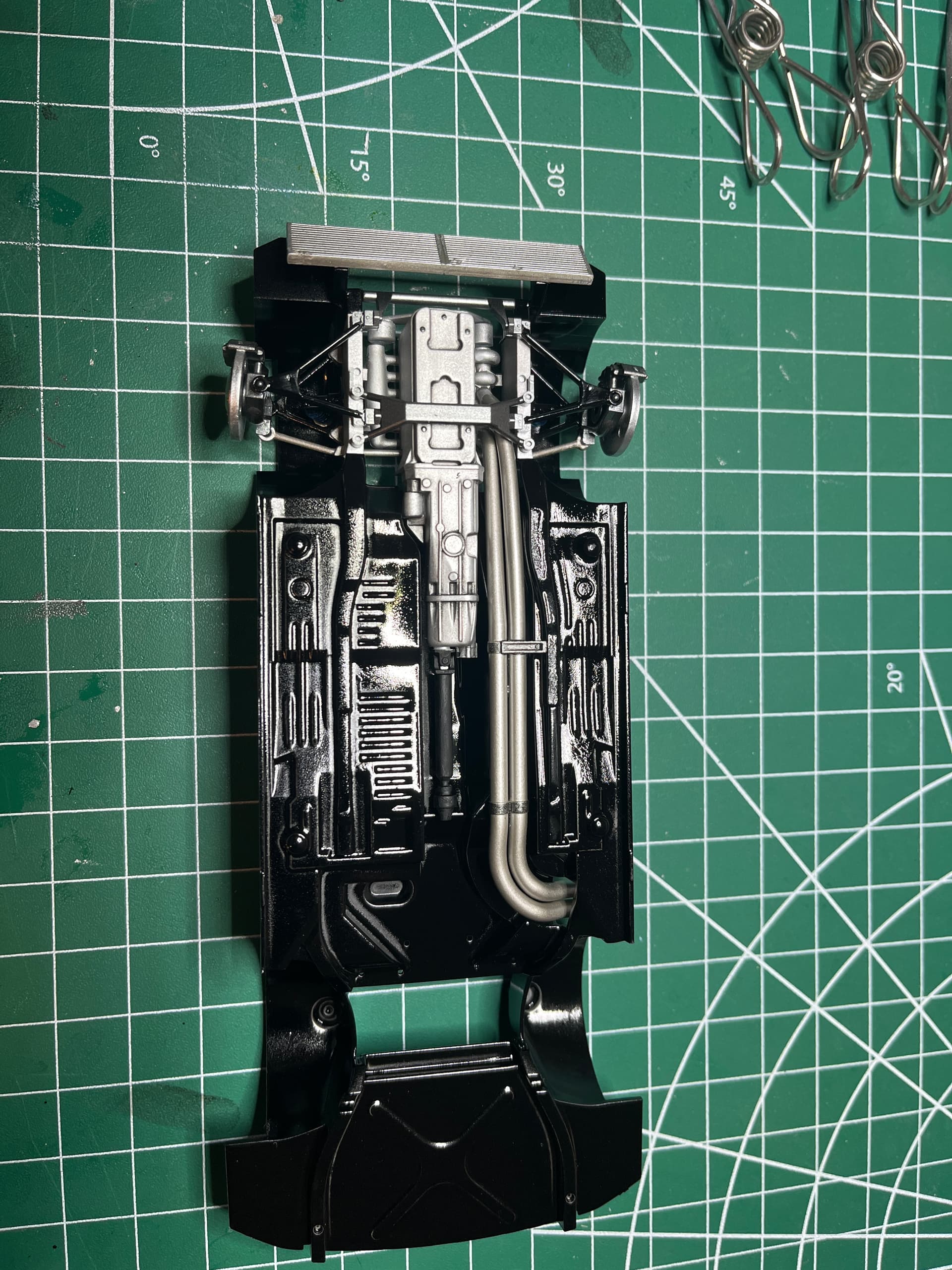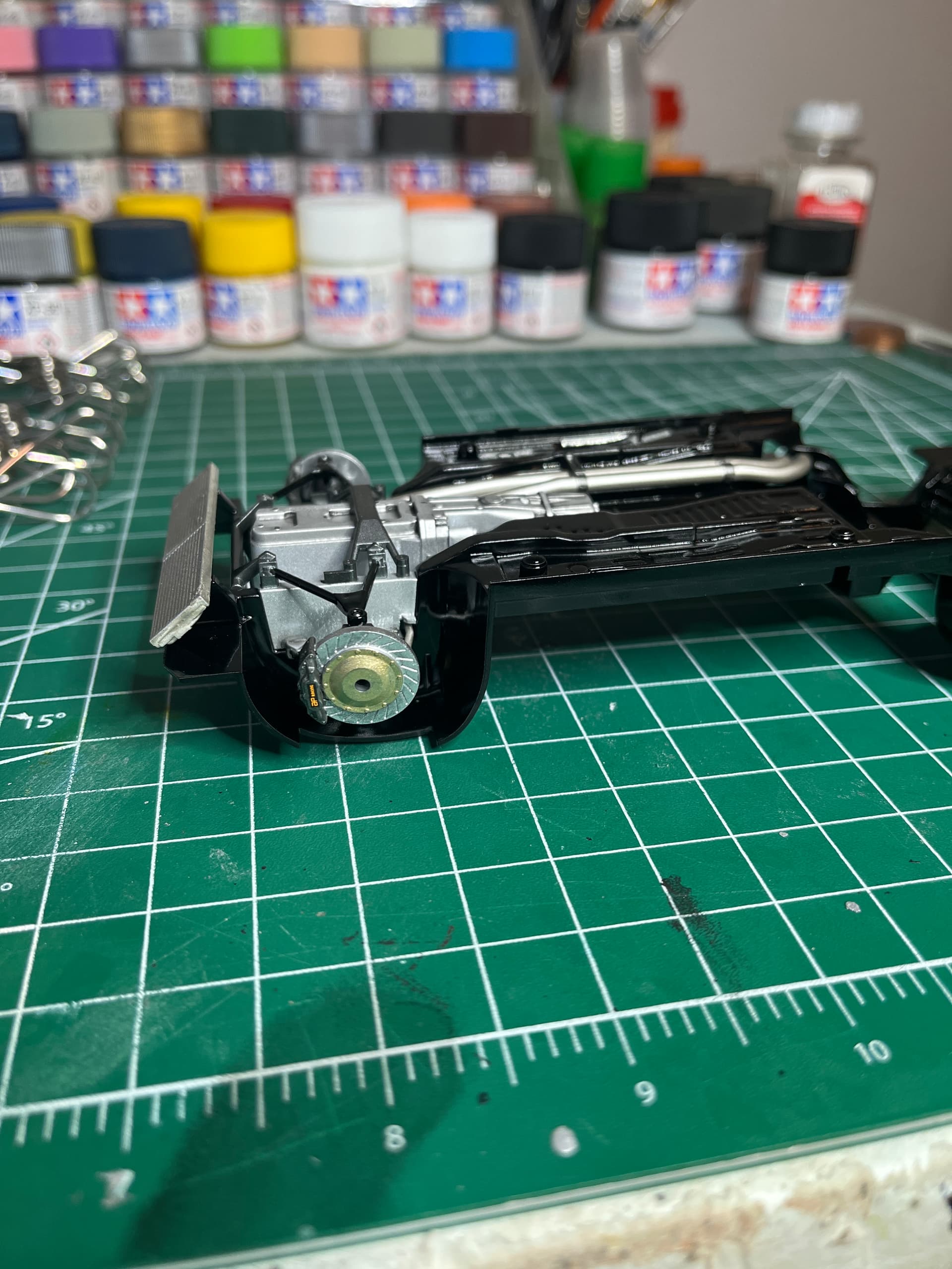 Making progress, almost finished with the body, need to install the spoiler, tail lights and a couple more decals, under chassis is complete minus the wheels and tires. Working on the tire decals now, they are reverse printed decals and they are testing my patients, very fragile and backwards of what I’m used to.