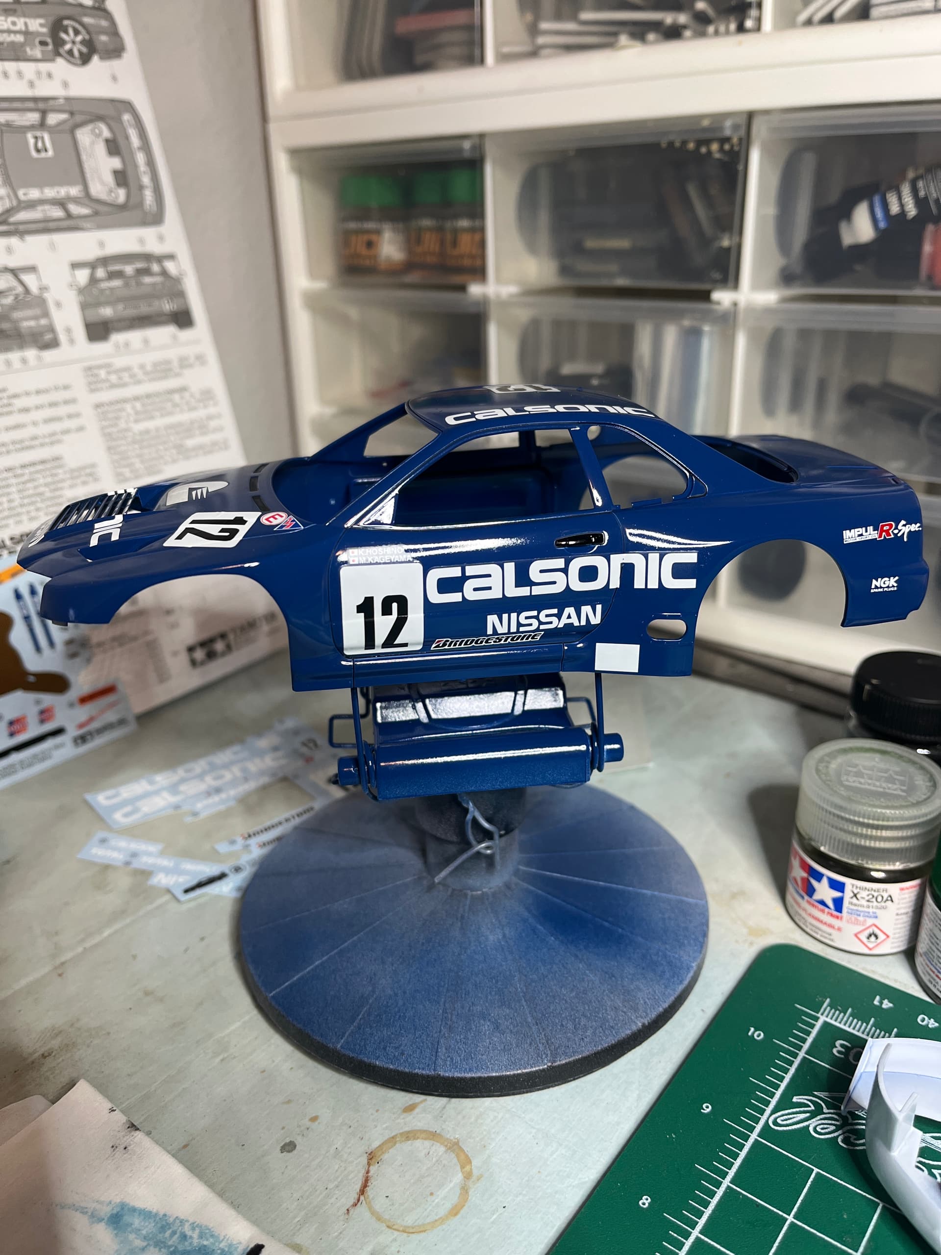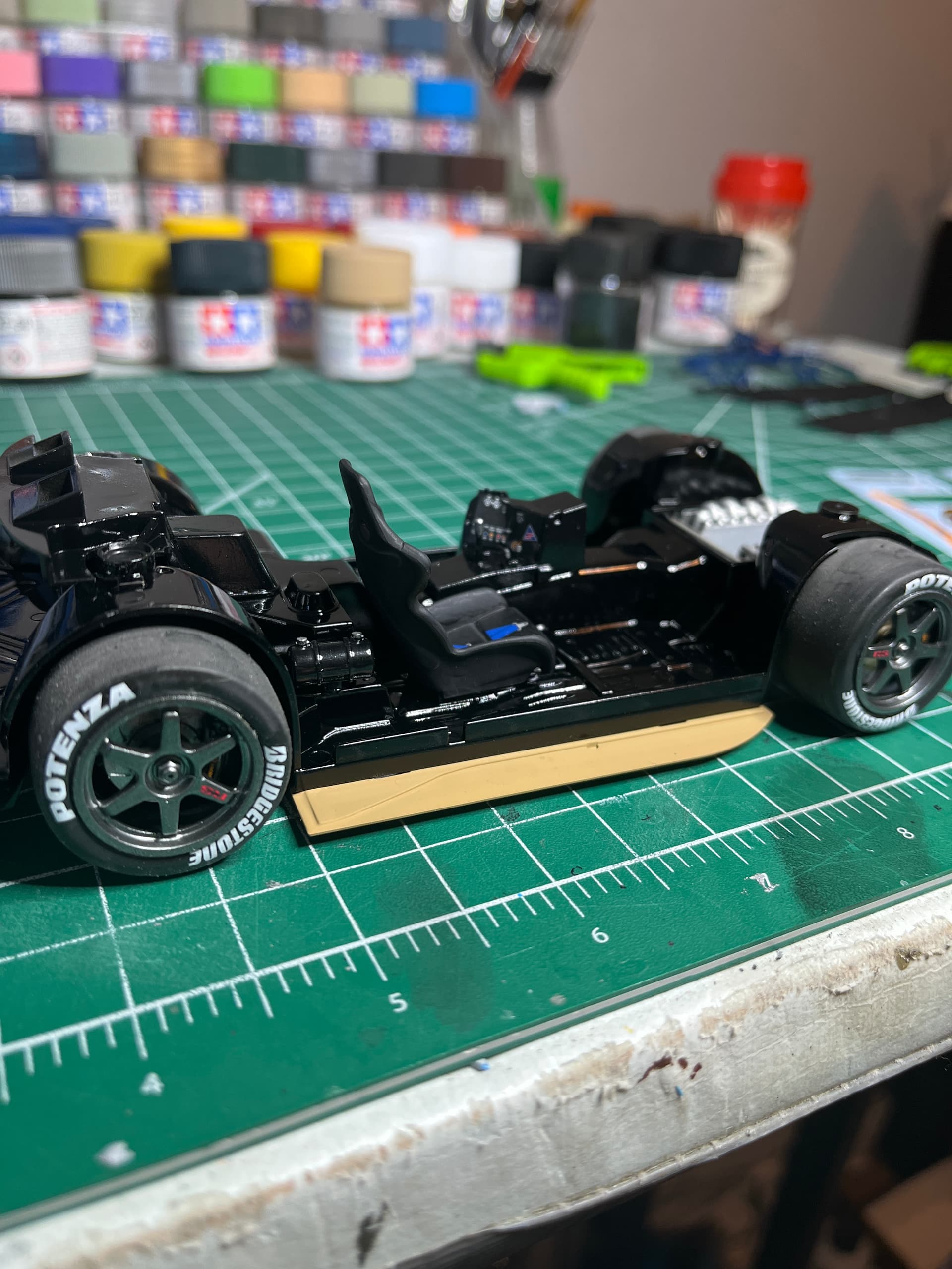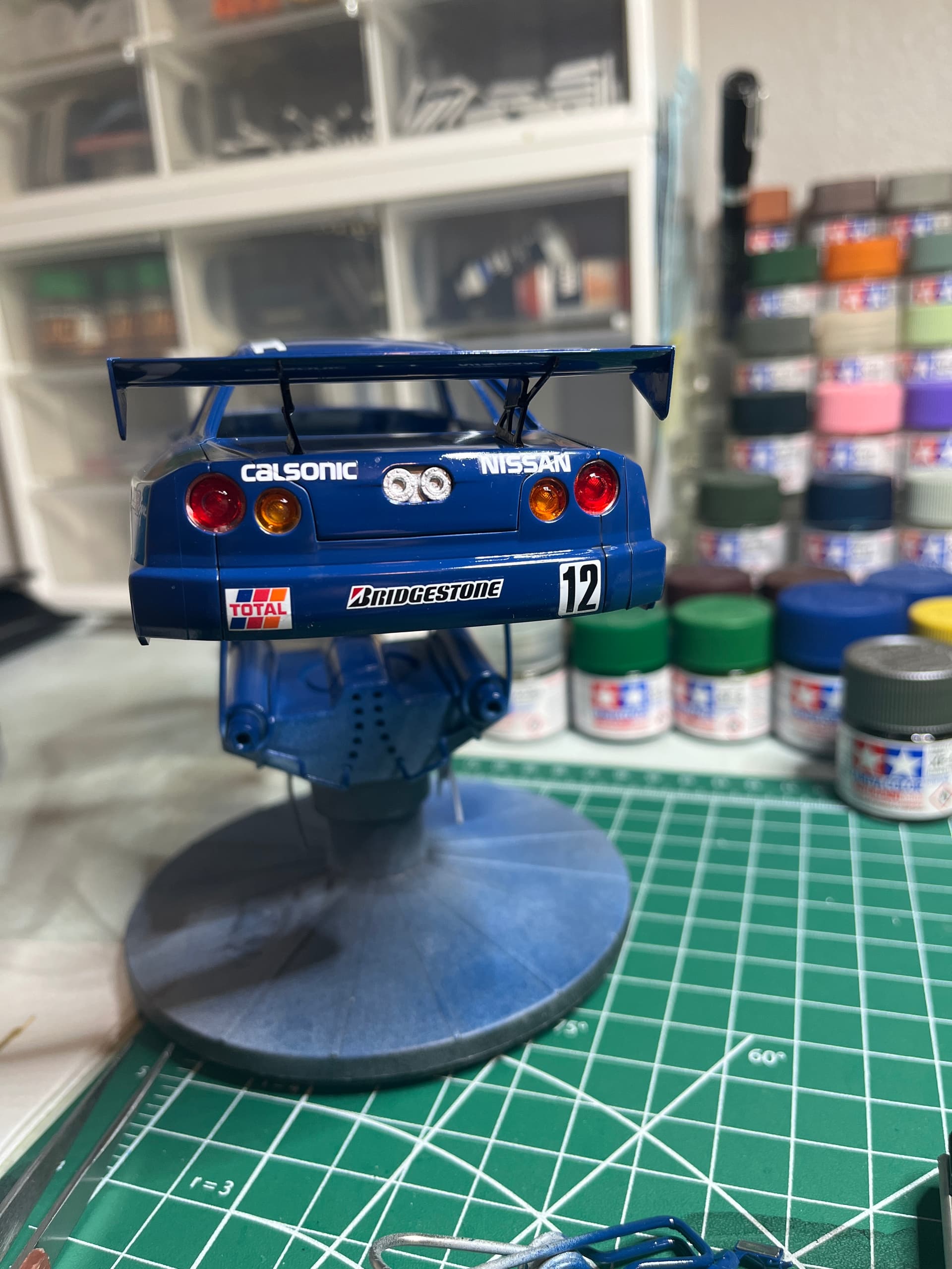 Making progress, almost finished with the body, need to install the spoiler, tail lights and a couple more decals, under chassis is complete minus the wheels and tires. Working on the tire decals now, they are reverse printed decals and they are testing my patients, very fragile and backwards of what I’m used to.