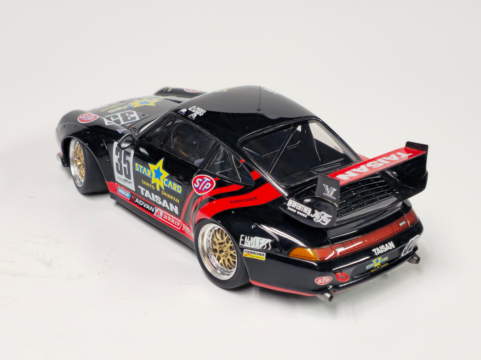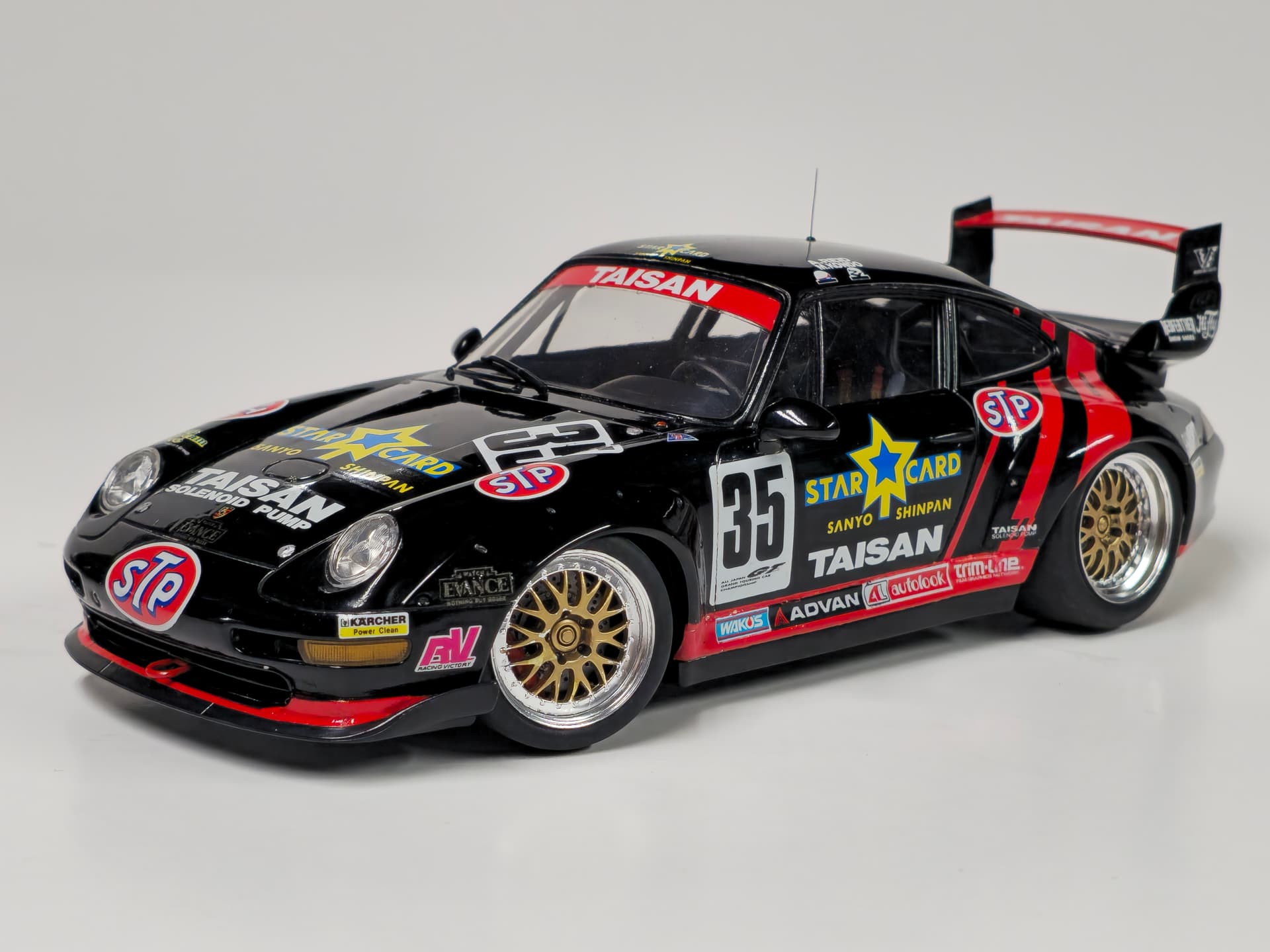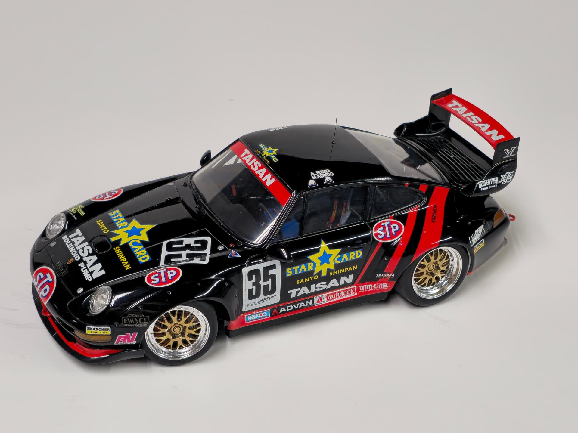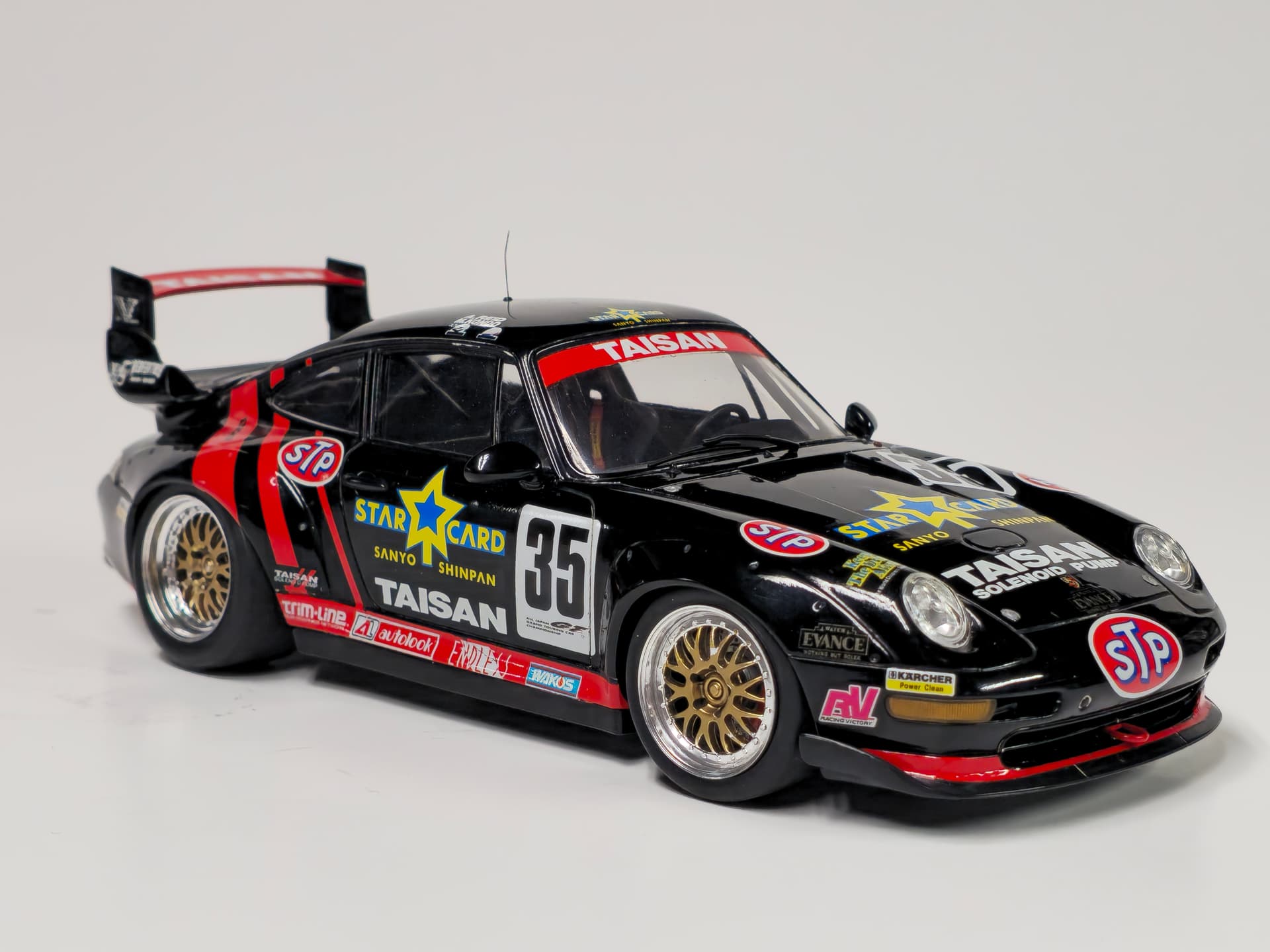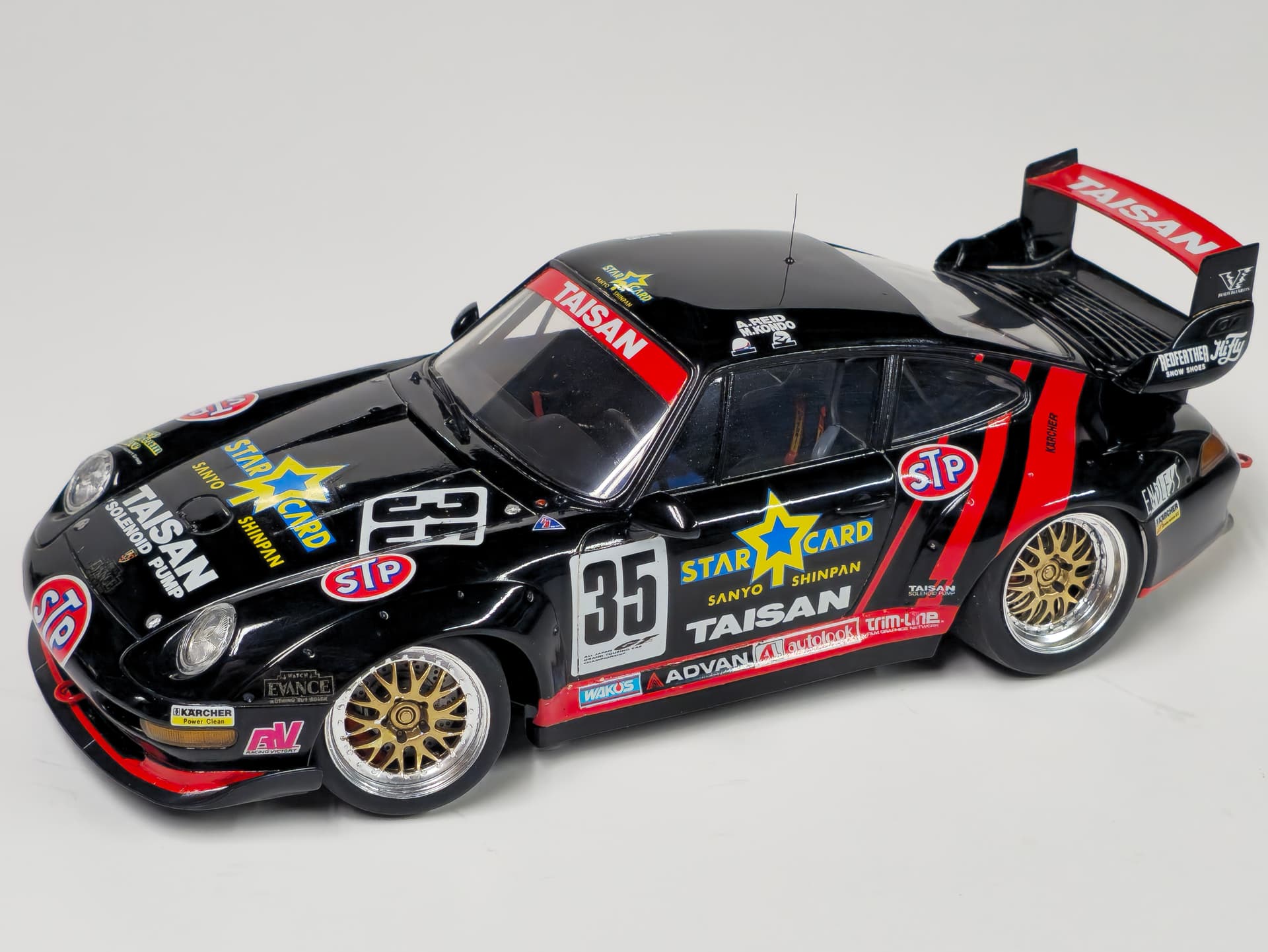 Here is Tamiya’s Porsche 911GT in the colors of Taisan Star Card which was built out of the box.