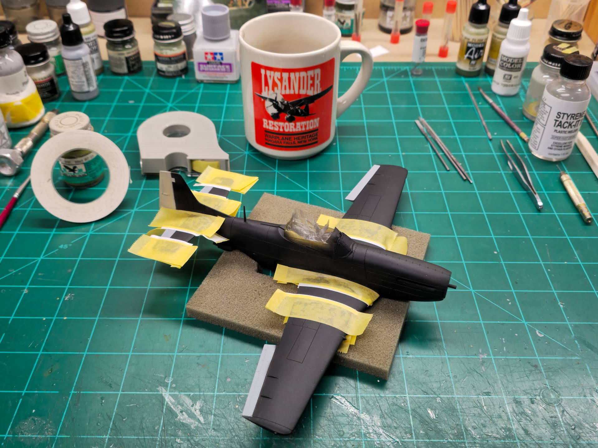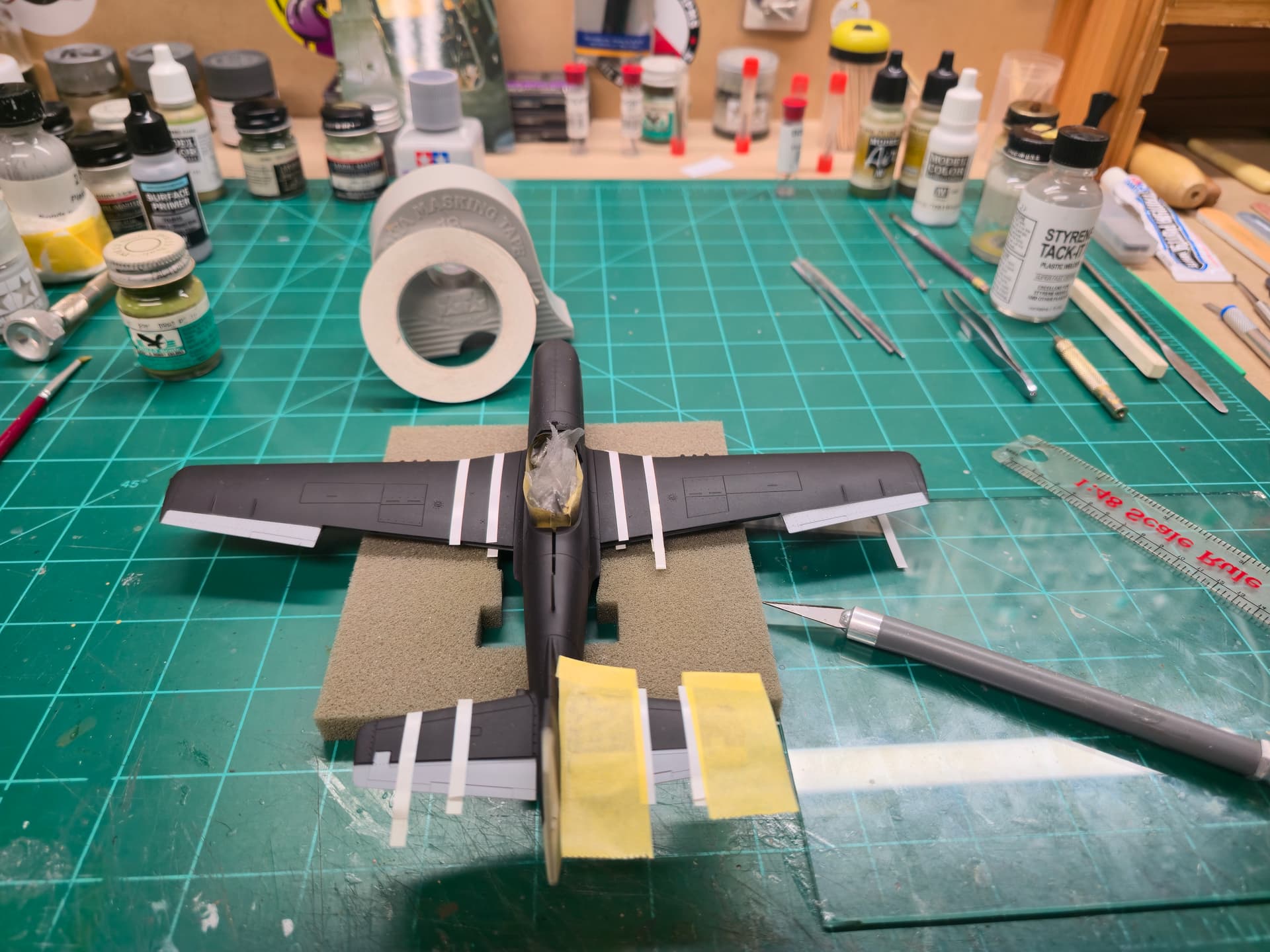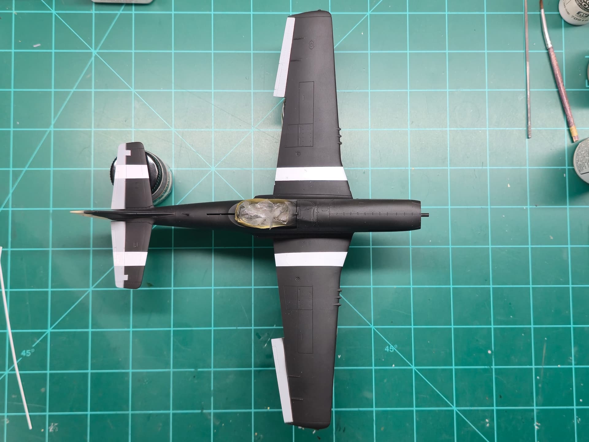 Later on today, I will measure out the side fuselage invasion stripes(18 inches per stripe - 90 inches total) mask off and airbrush the white.