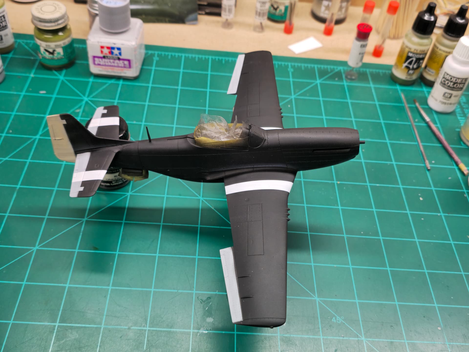 It isn’t much but I was able to lay down a few coats of black basecoat(aka natural shadowing) and hopefully by the weekend, I’ll be able to tackle the invasion stripes along with the theater bands