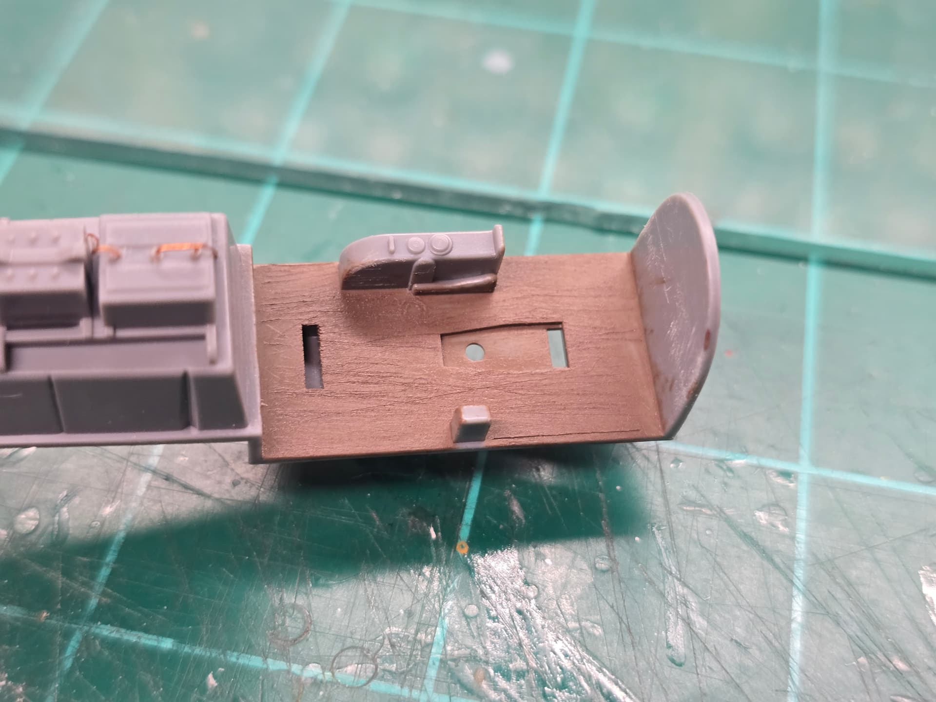 Then sprayed the basecoat using flat black. Once everything was painted, I sanded the floor area lightly removing the black and revealing the "wooden"floor.