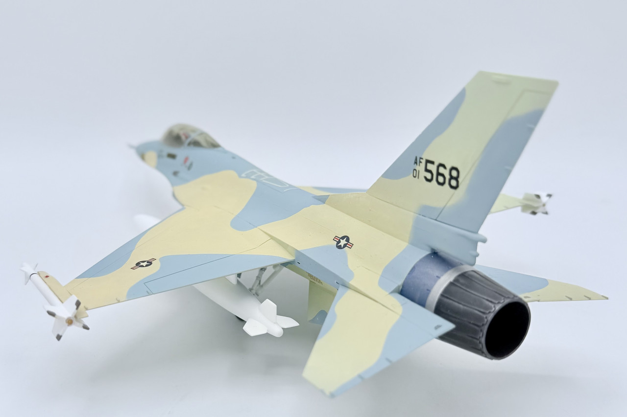 So here it is, in all its’ glory, my completed build of the 1970’s vintage F-16 prototype kit. I painted it in the sky camouflage worn during the fly off competition between the YF-16 and YF-17 in 1974 at Edwards AFB. I built this kit OOB, and even though the kit did not show how to paint this scheme, the decals are for another scheme worn by this aircraft later in the flight test program and usable on this scheme.