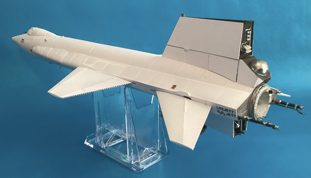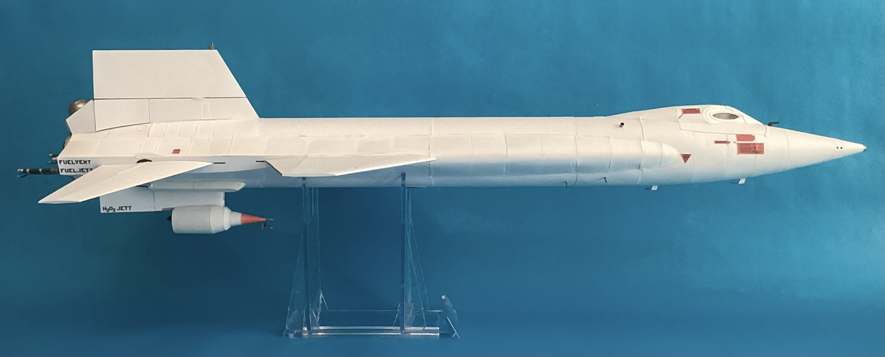 I printed out the model and just reversed the pieces as I built them. The project involved some scratchbuilding and accurizing to depict 66671 as it appeared on the speed-record flight. I had to scratchbuild the “eyelid” used to cover the left pane of the canopy. The shortened ventral and the dummy scramjet were scratchbuilt. On the record flight, the 66671’s canopy had a revised leading edge, so I added that. I also added detail and accurized the XLR-99 motor and jettison tubes. (A lot of modelers depict the jettison tubes as silver, but by 2-53-97, the tubes had weathered to a metallic black color.) There were numerous other bits of added detail throughout, and the markings are correct for the speed-record flight. (Plastic modelers building the Special Hobby kit should be warned that SH got the markings wrong for Flight 2-53-97.)