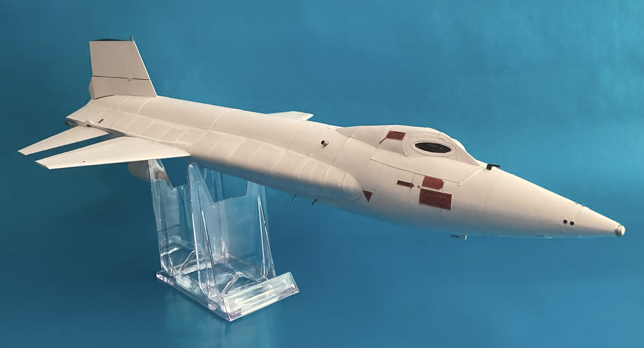 Here is my latest, a 1/32nd-scale cardmodel build of X-15A-2, 66671, as it looked on Flight 2-53-97 on 3 October 1967. Pete Knight set a world speed record of 4,520 mph, Mach 6.7. To reach the record speed, the airframe was covered with a pink ablative, and then the ablative was covered with a white sealant. (The ablative had a habit of exploding if something hit it after being exposed to liquid oxygen, so the sealant was added to prevent that.)