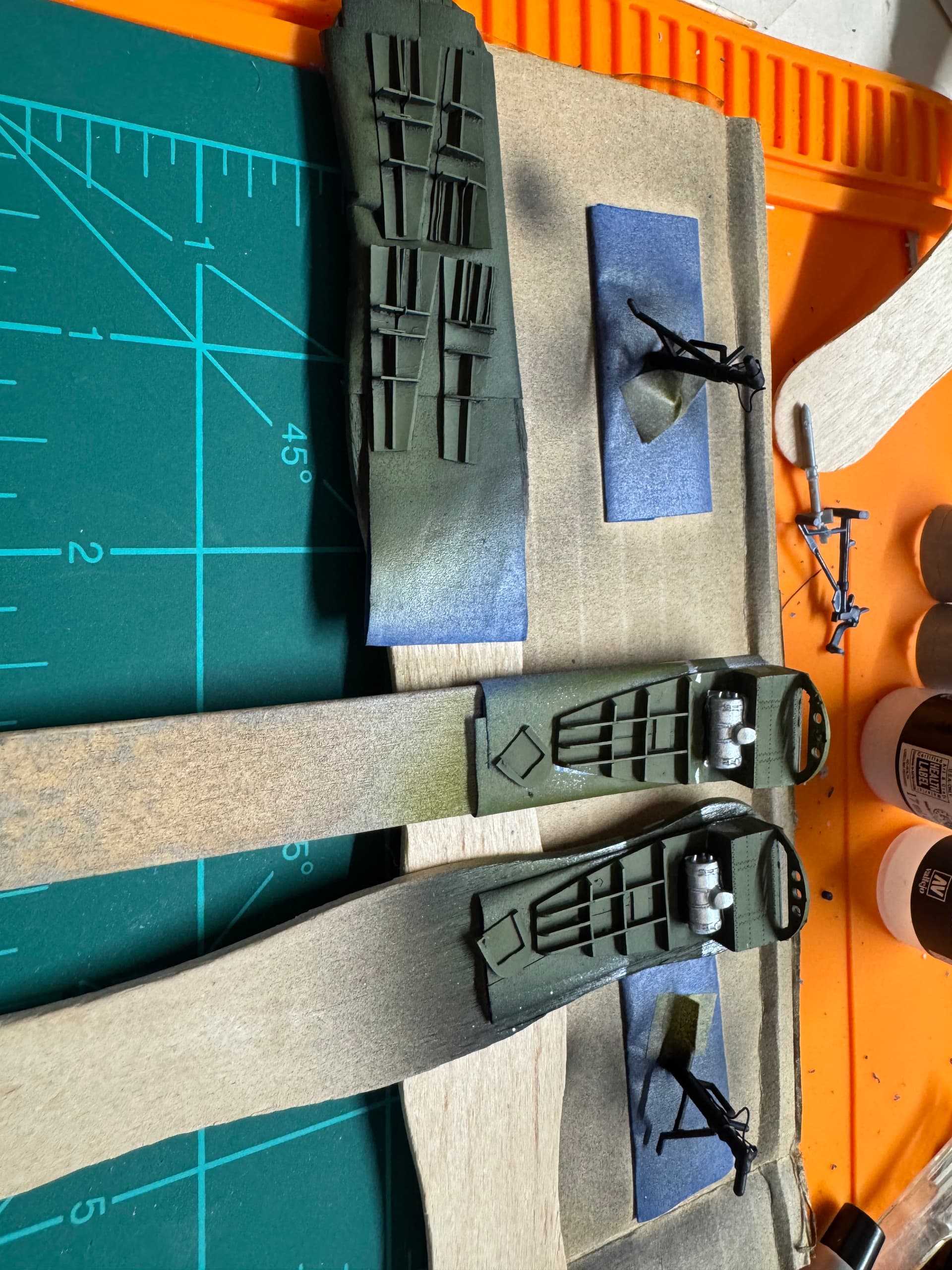 Well,the “Red Devils” went off the rails,the big decals gave me a problem,so I had to paint out the red,and I’ll be going with a less flamboyant scheme,but otherwise its going good,I hand painted all the details and started on the,I think they call them trucks