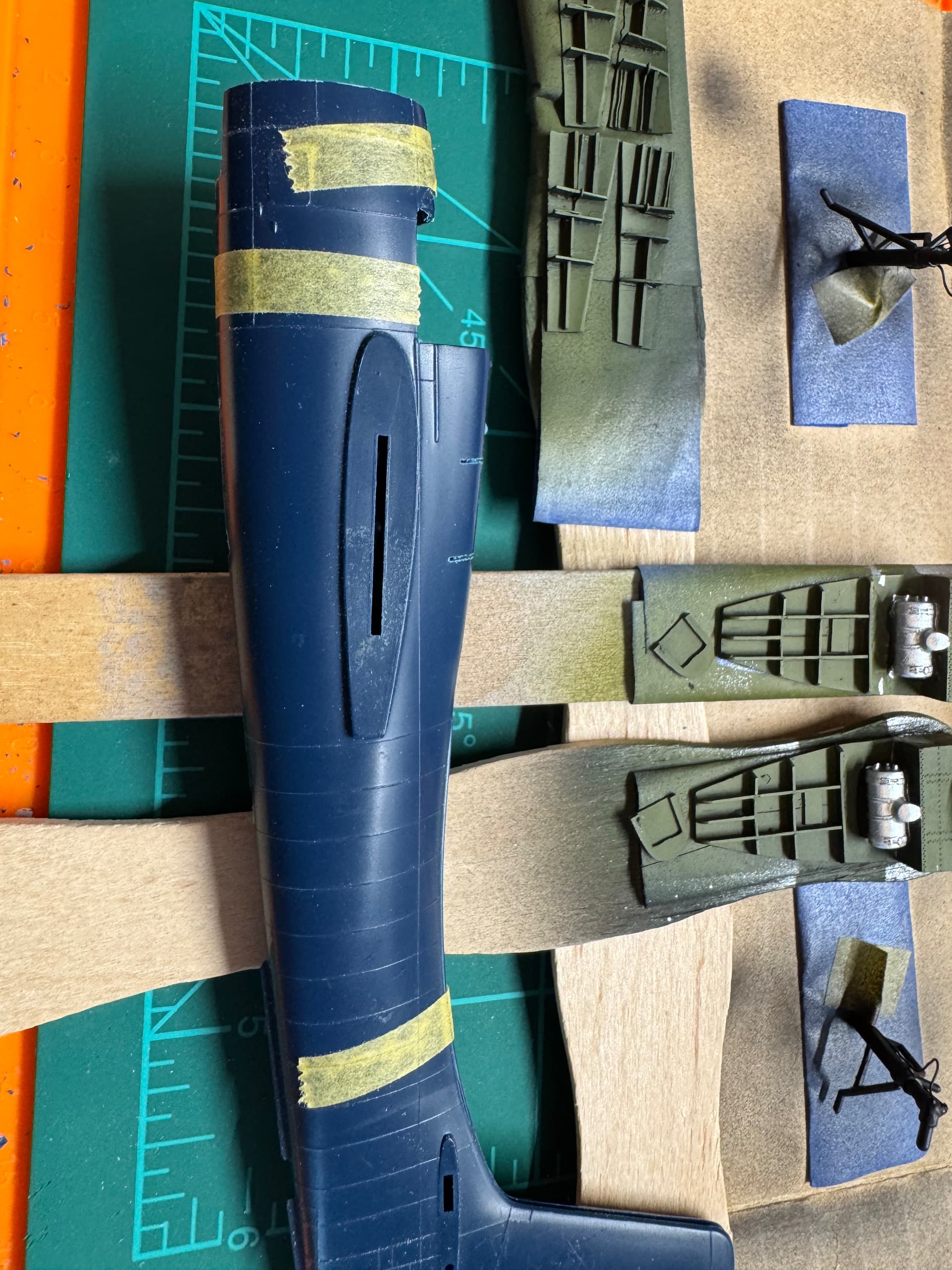I wish I could say the same for the Tigercat. I’m moving at a snails pace. I did get the main gear mostly done. I made lead wire brake lines and add the scissors from photo etch robbed from a set for a different a/c. The gear bays are mostly painted and ready for assembly. Wings are almost ready for some primer. The kit wheels/tires are very plain, so I’m using these resin ones. They are for the P-38, but I think they look the part in this scale.