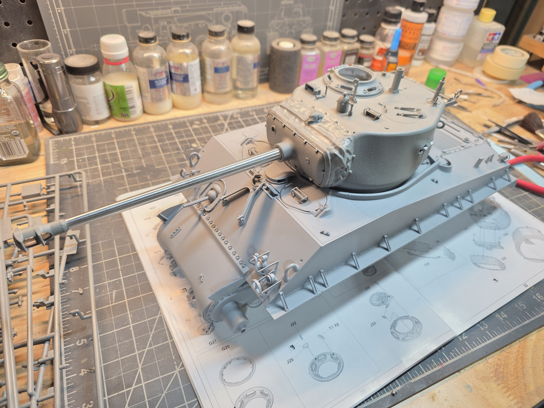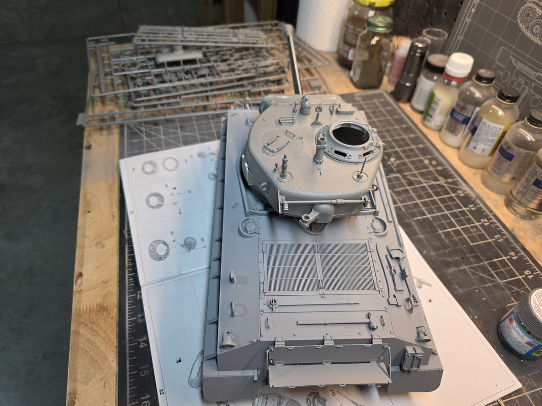 She’s beginning to look like a Sherman! Good work. Road wheel assemblies, while the iron is hot? Or paint? Don’t know.