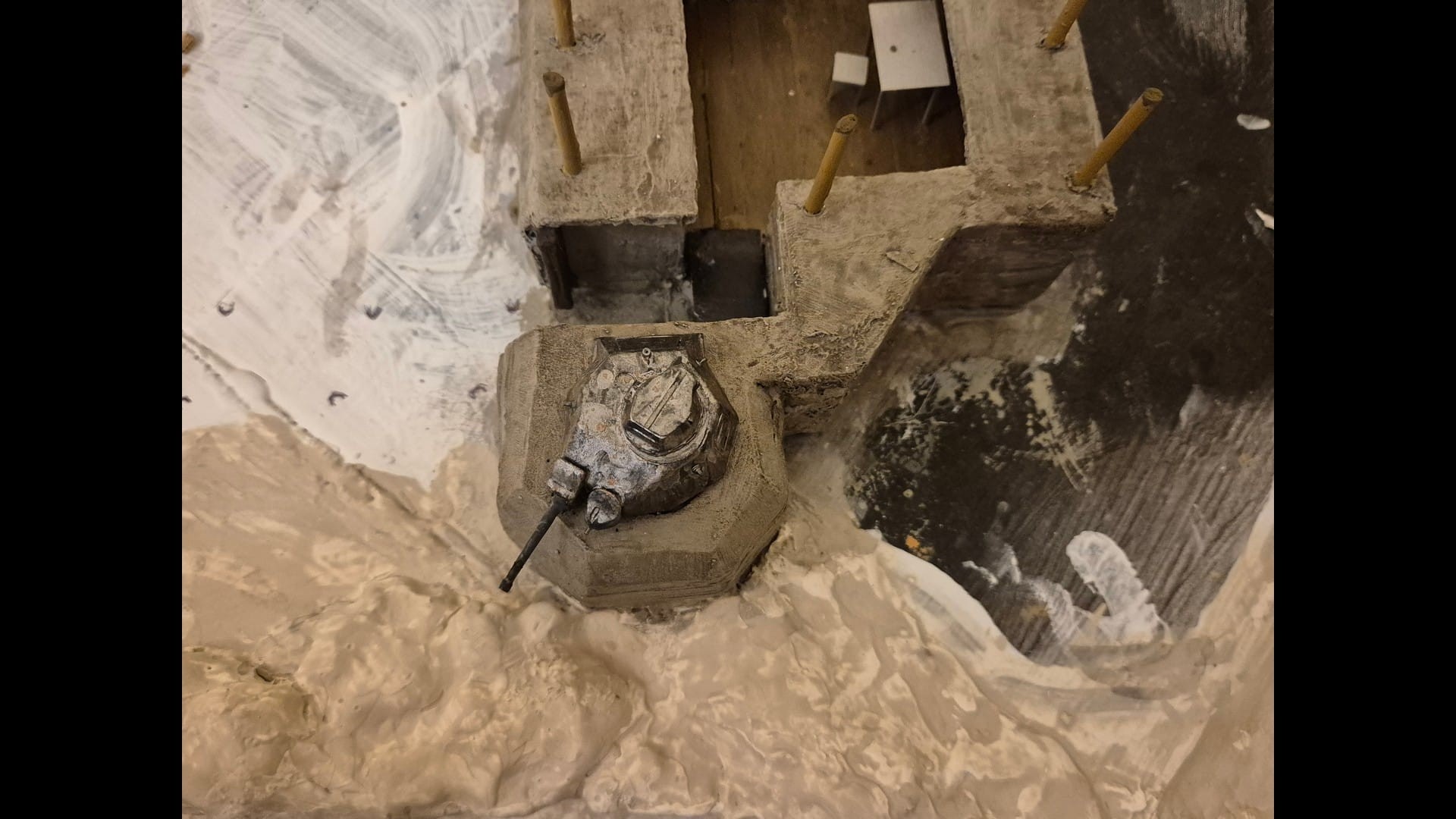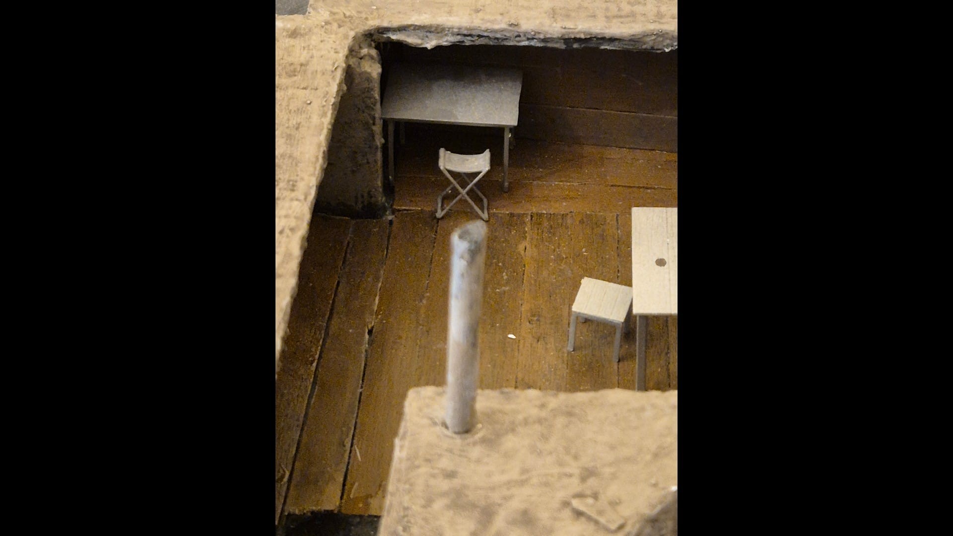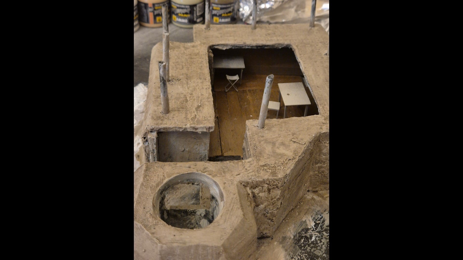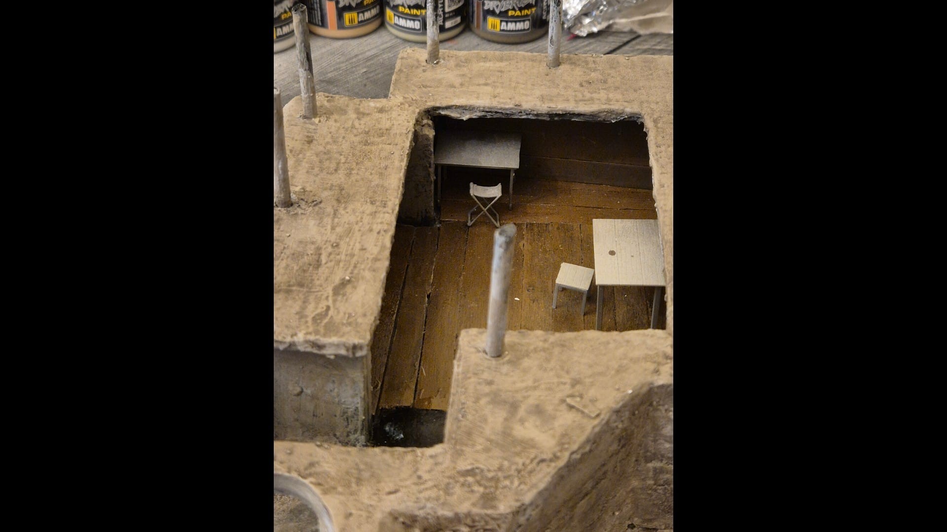 Having finished the cliffs basic build and still waiting for some of the Celluclay to dry thoroughly I dedicated my attention to the bunker once more. I added some washes on the entire exterior surfaces mixing various shades of Gray, Earth and Green acrylic colors together and thinning them considerably with water and then applying the mixture over it at random starting from the bottom to the surfaces with a “0” brush and then passing over it with a sponge. While it dried I did build a wooden floor with the same system I had used for the fences but first I had to measure all the sticks to make them all the same size and then, always using a Dremel tool I did saw then all at the very same length. Following that I fixed them on thin plastic sheet with white glue and let them dry. I then painted then with Vallejo New Wood #311 and while still wet adding a slight touch of Old Wood #310 only to finish them with a wash of Burnt Umber #70941. Once fully dried up I brushed a thin amount of Satin Lucky Varnish (A.MIG-2052) by AMMO MiG all over them, I also applied the same panels to the walls and glued some tiny regional maps unto them. Then I cut into shape a small rectangle of plastic sheet and painted it with dark rubber to simulate an insulating ramp entering the communication area and glued it upon a set of steps.