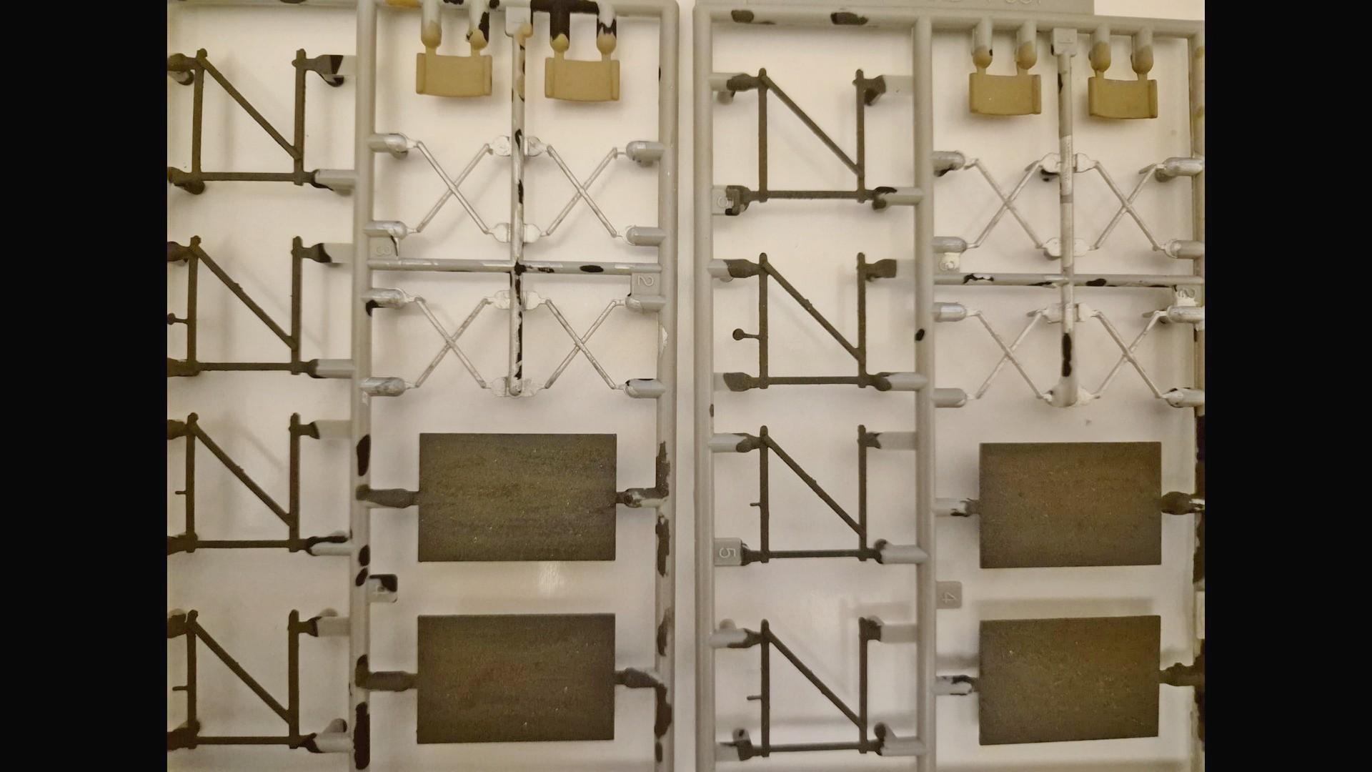 Furthermore, I started painting what I had conceived as an iron gate in its open position with some Hull Red mixed with Dark Rust and the Somua turret with AK Interactive Extreme Metal “Base Black” and then covered with “Steel” in an irregular dabbing with a dry brush. The camouflage net poles were then primed with Flat Wood.