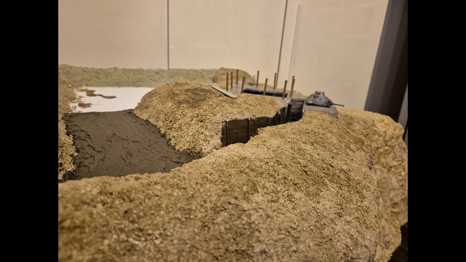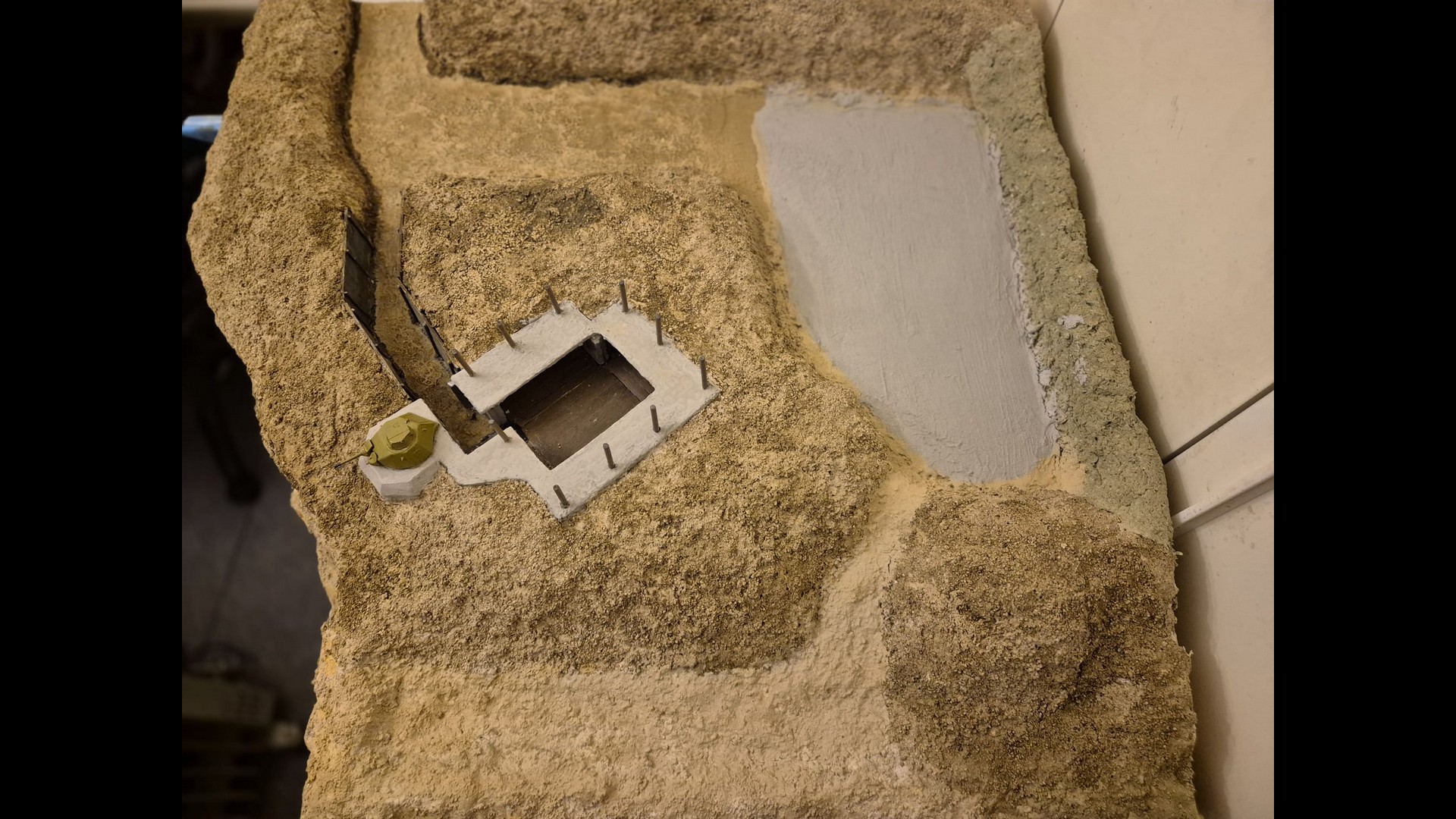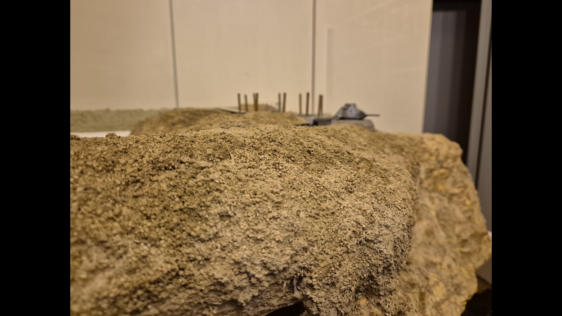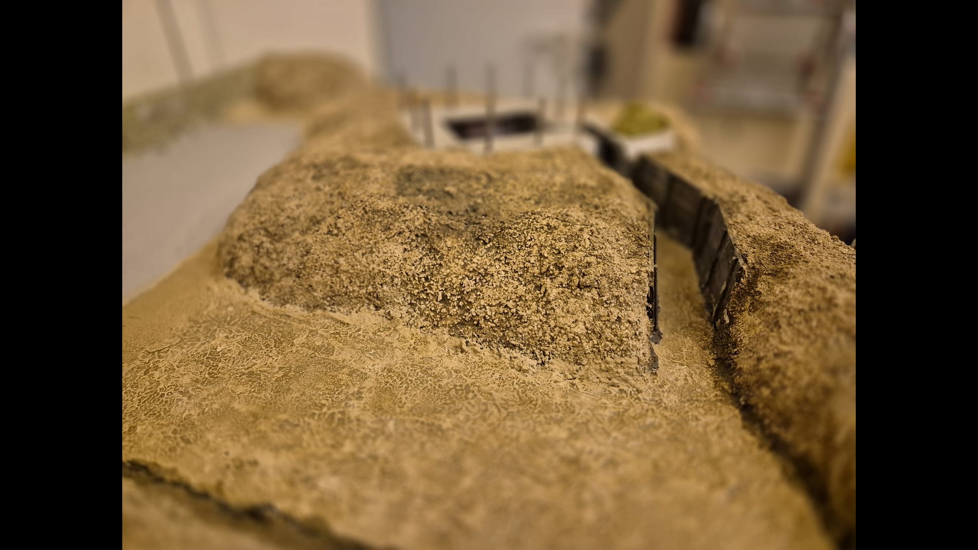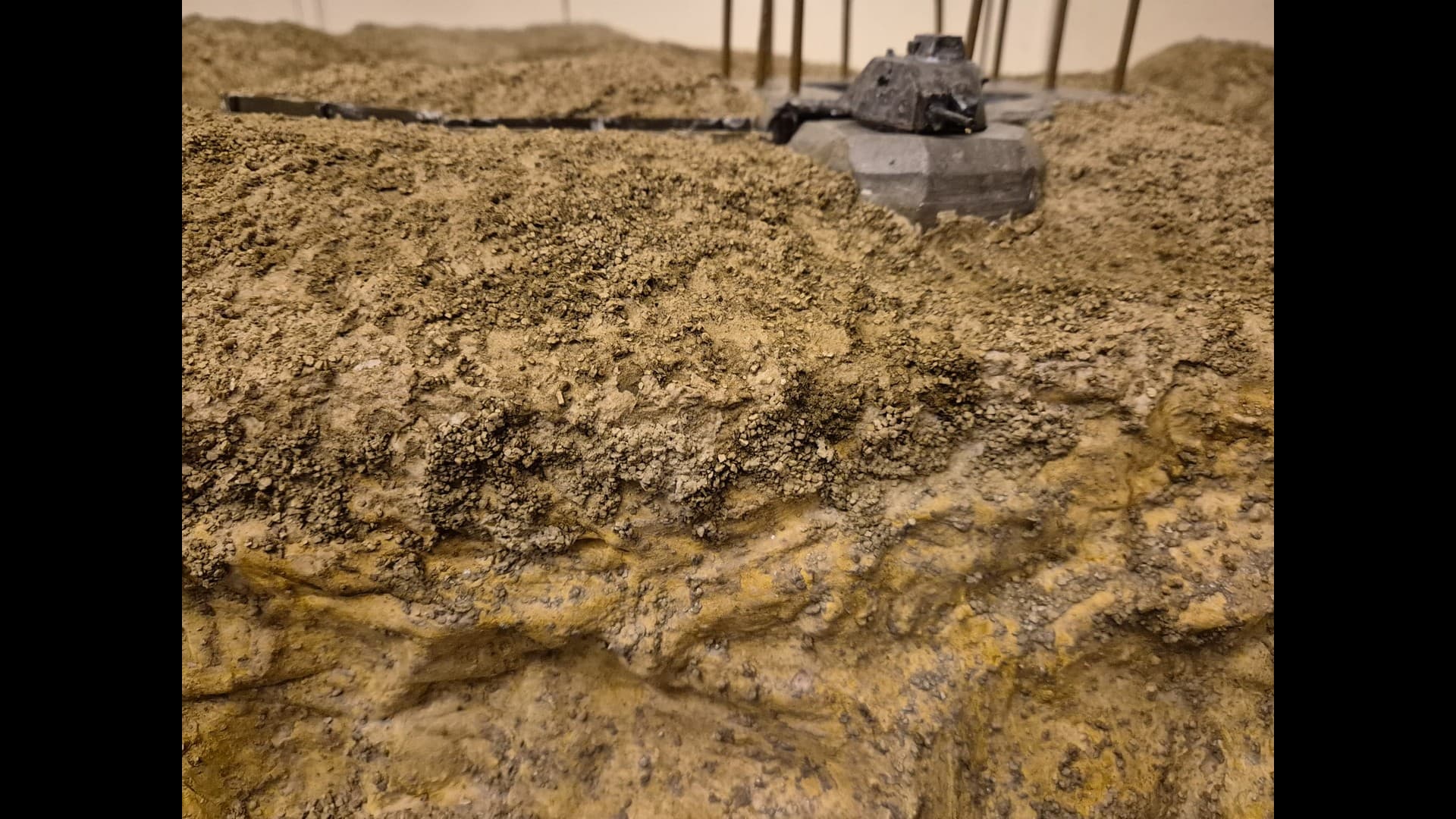 In this picture you can see a rougher version of the terrain. I discovered that Woodland Scenics produced a product called “Mold-A-Scene” which as the word implies, usually serves for molding shapes and items required for a diorama. It’s a special granular plaster which I immediately recognized as being the ideal product to give the terrain the necessary roughness and show a kind of wilderness to it. Its granular nature suits well to depict tiny pebbles. Also note the Tank turret which has by now received an irregular metallic wash with AK Interactive Extreme Metal Steel…