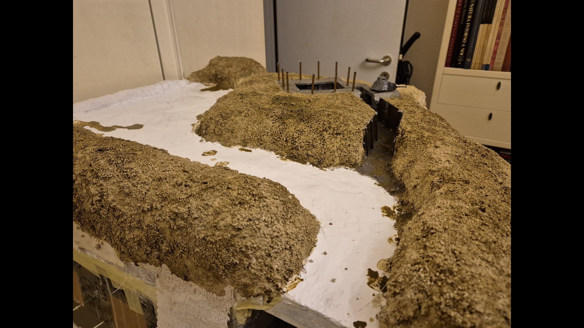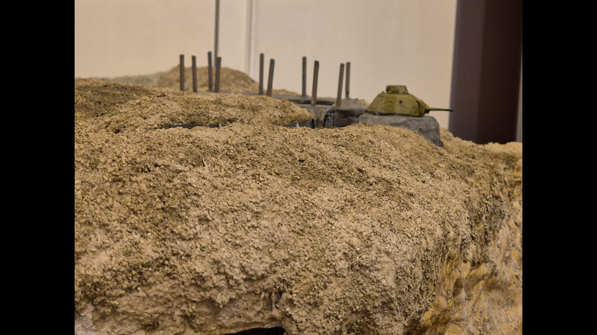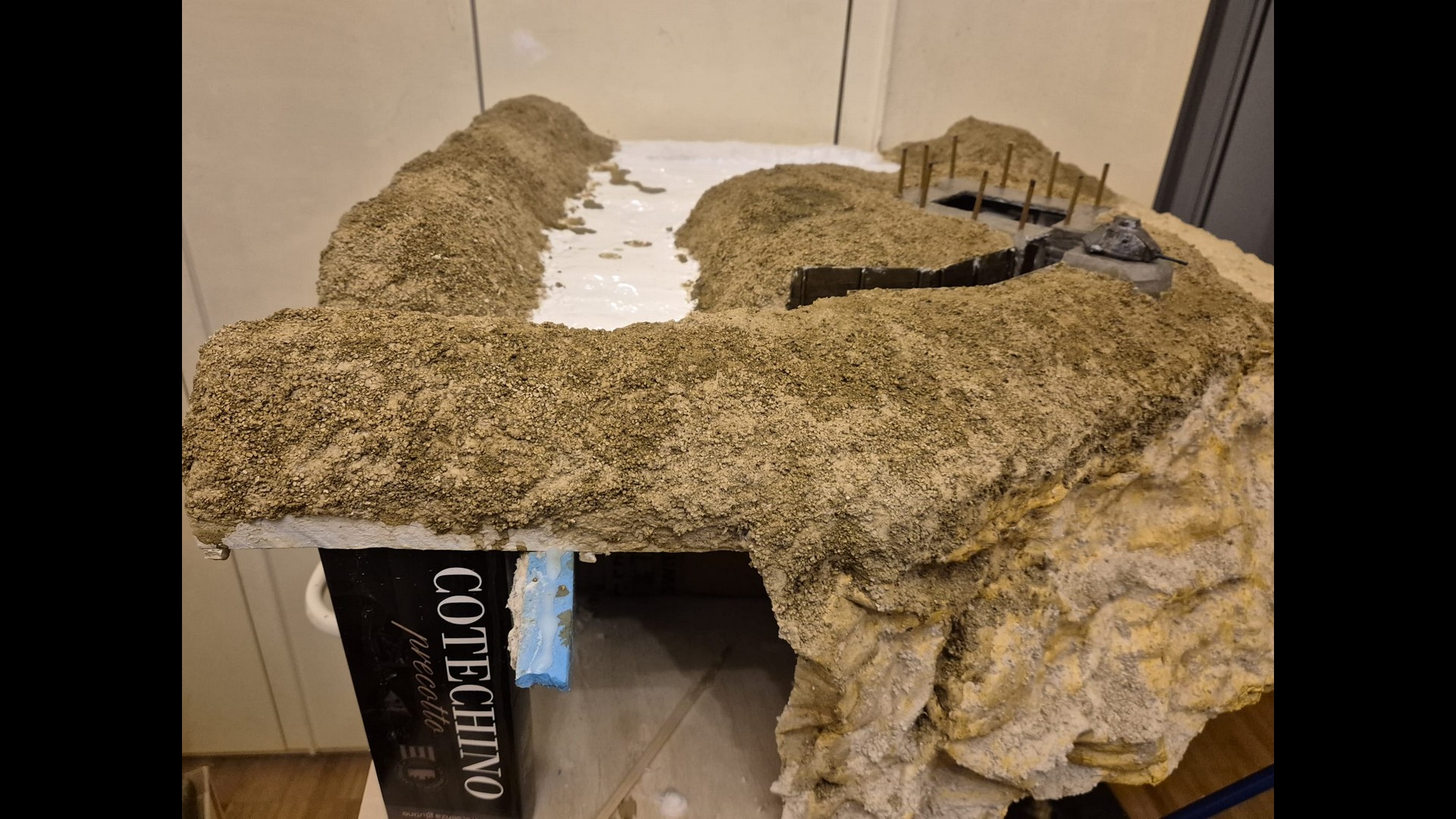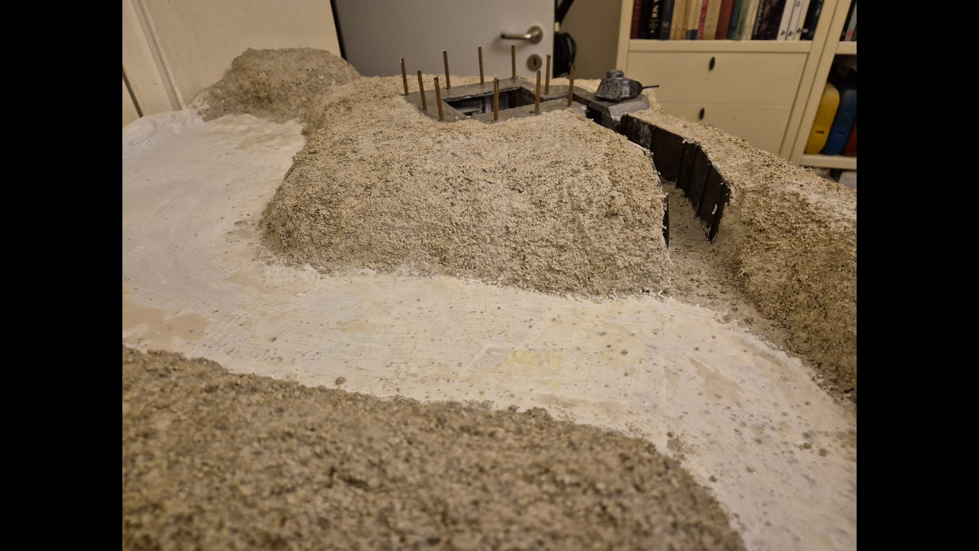In this picture you can see a rougher version of the terrain. I discovered that Woodland Scenics produced a product called “Mold-A-Scene” which as the word implies, usually serves for molding shapes and items required for a diorama. It’s a special granular plaster which I immediately recognized as being the ideal product to give the terrain the necessary roughness and show a kind of wilderness to it. Its granular nature suits well to depict tiny pebbles. Also note the Tank turret which has by now received an irregular metallic wash with AK Interactive Extreme Metal Steel…