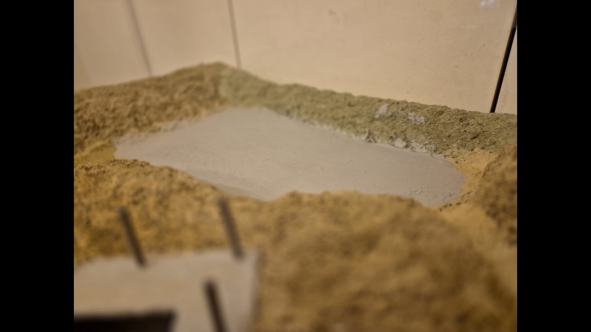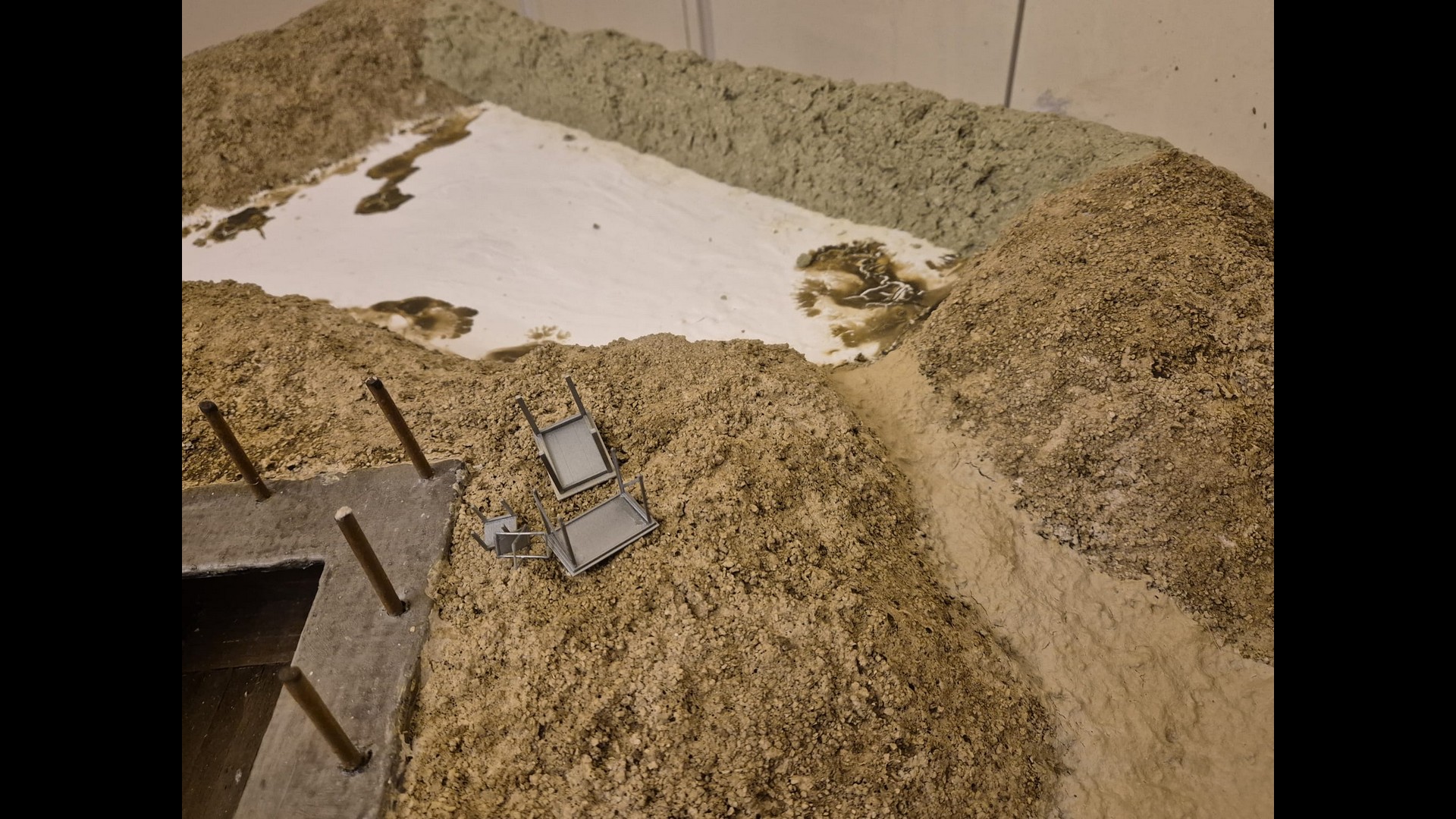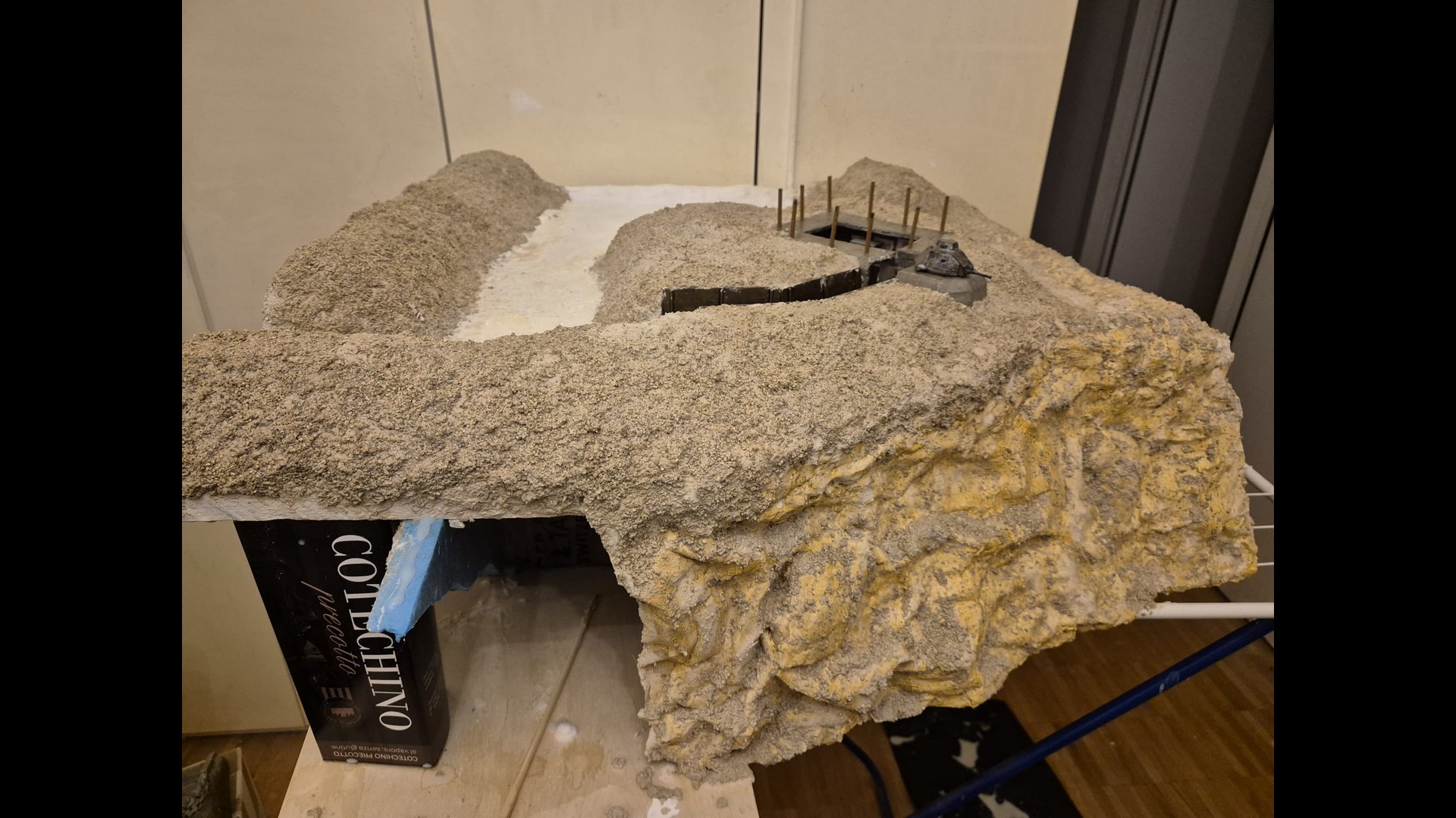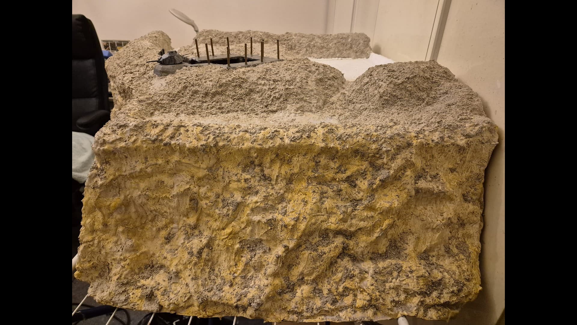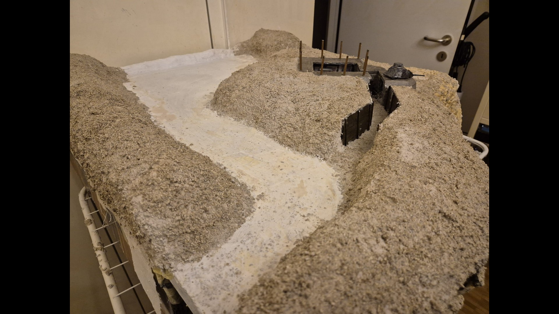 In this picture you can see a rougher version of the terrain. I discovered that Woodland Scenics produced a product called “Mold-A-Scene” which as the word implies, usually serves for molding shapes and items required for a diorama. It’s a special granular plaster which I immediately recognized as being the ideal product to give the terrain the necessary roughness and show a kind of wilderness to it. Its granular nature suits well to depict tiny pebbles. Also note the Tank turret which has by now received an irregular metallic wash with AK Interactive Extreme Metal Steel…