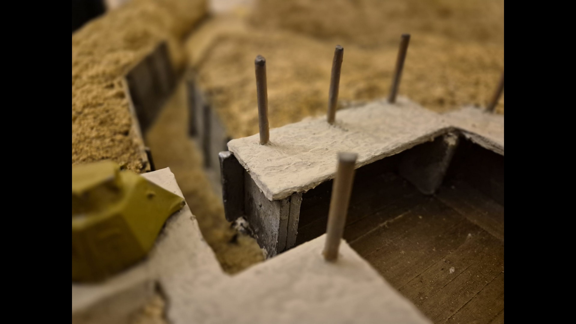 The fences surrounding the trench leading to the Bunker were found to be a bit to dark for my liking, but for the time being I left them like this. As said , they were fixed with Power Glue and inserted into previously drilled holes holding them in place with masking tape. They are crooked on purpose, since such protections were rarely regular constructions and usually made in a hurry with whatever kind of wood one could find.