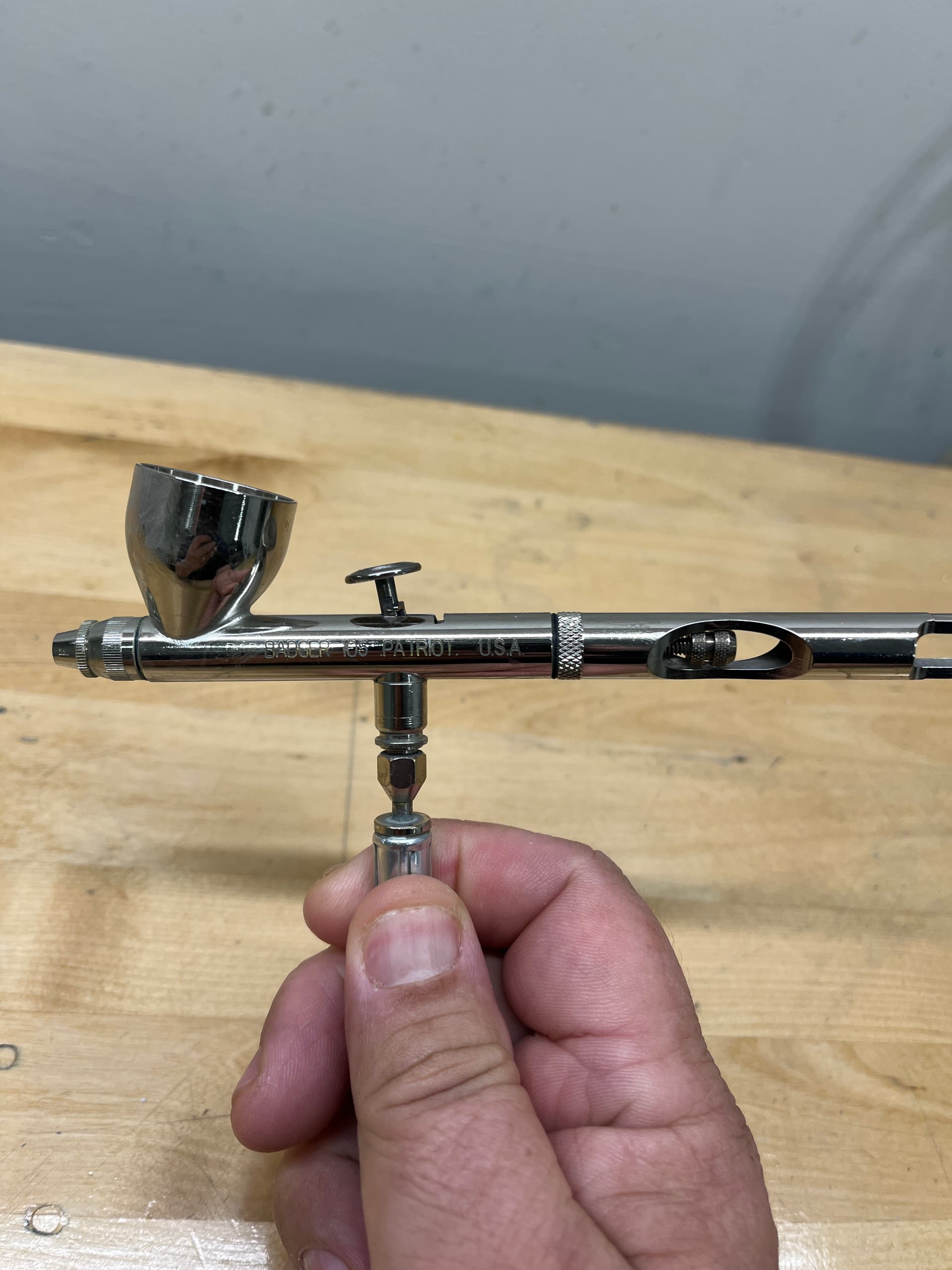 This is what I’ve been using from the beginning. Dual-action. I practiced a lot on plastic first. You can find out what pressures works best for you, and how you need to mix your paint to thinner ratios.