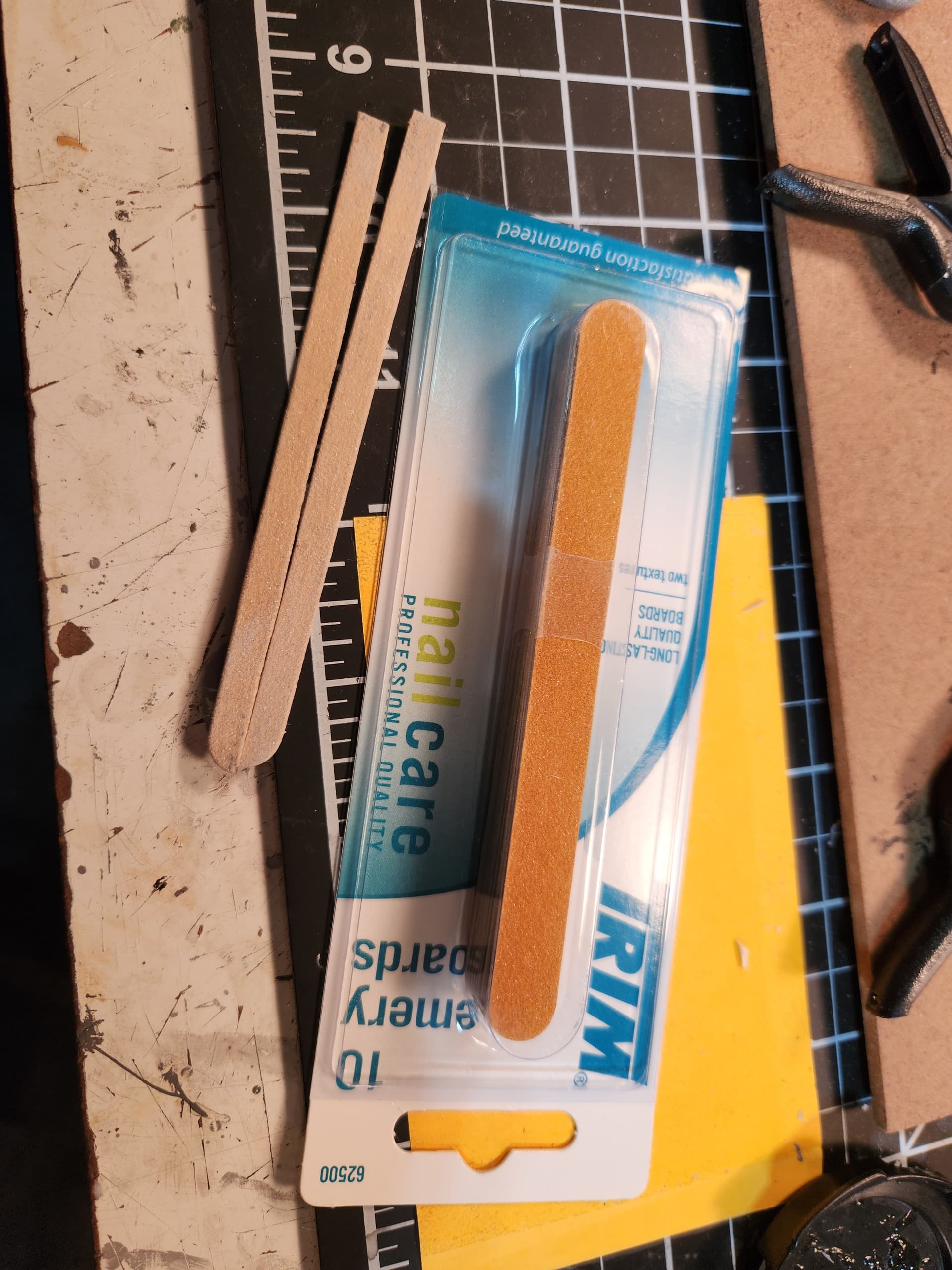 Back in the day, you raided your Dad’s workshop for sandpaper. Get a selection of different grits. Cheap ones can be found in the women’s nail care section of just about any Walmart. I get these emery boards and cut them in half.