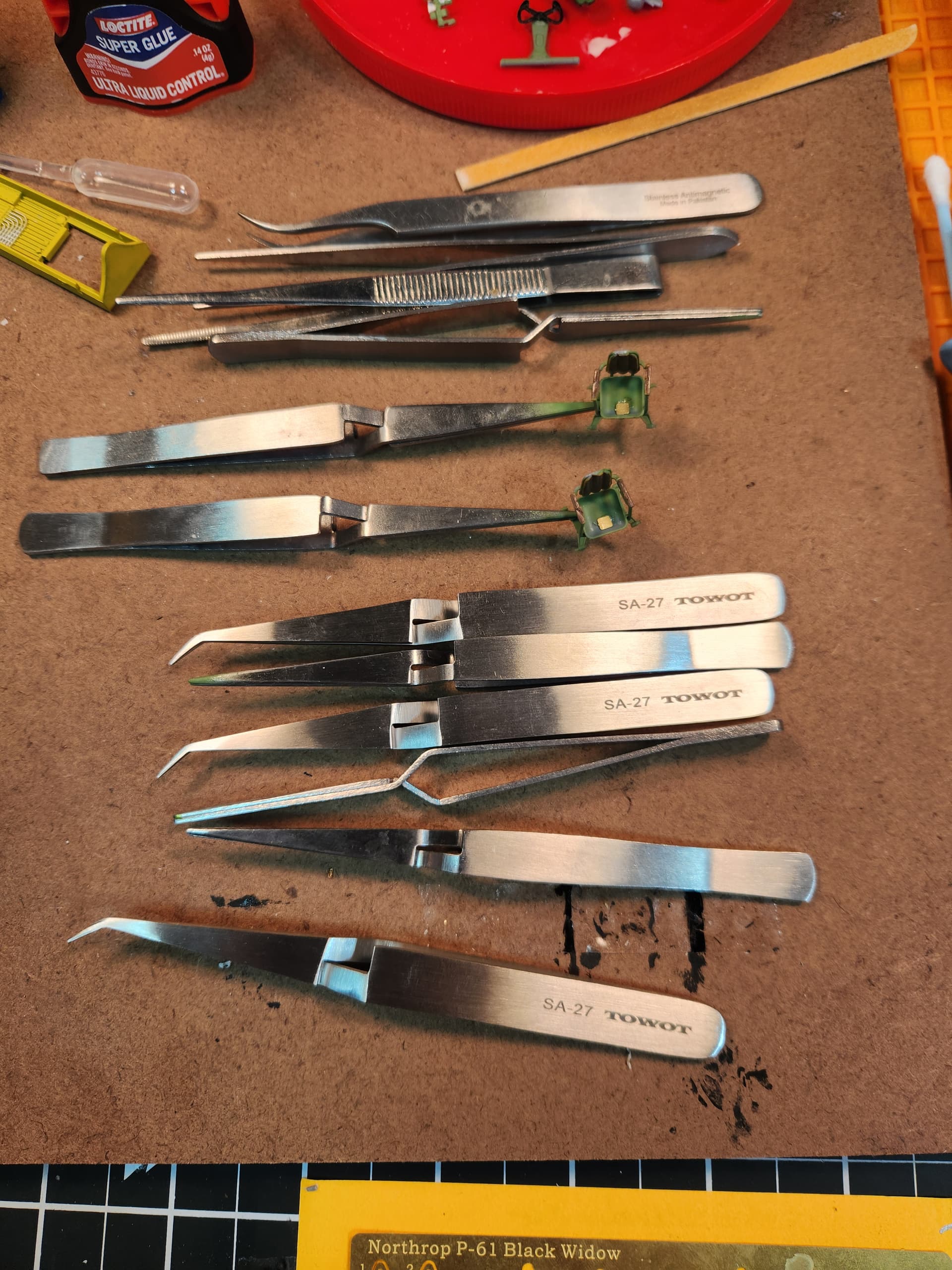 Get yourself a bunch of tweezers. Get the normal kind for installing tiny parts but remember, sometimes tiny parts shoot out of the tweezers and disappear into the aether so be ready for that. Get the reverse kind of tweezers that holds the parts until you squeeze the tweezers. You can use these to clamp wings while glue dries as well as holding parts while painting. Here’s some of those!