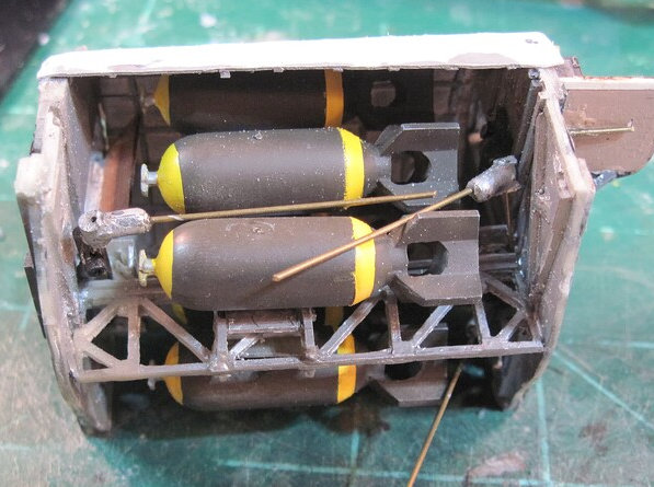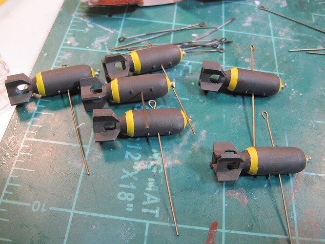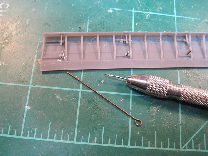 Addendum: I originally put this next one in my B-17G to F conversion post but I keep finding more uses for them so I thought I would bring that over here. At HobbyLobby, in the Jewelry making area, you can get these things called “Tiepins.” I have no idea what they are really for but each is a little loop on a bendable wire, 100 for about 5$. In the hobby department I found some K &S brass tubes, #5125, 4 foot long tubes for about 5$. The Tiepins, which have about a million uses exactly slides into the brass tube. Here is a picture of the brass tubes and Tiepins, a Tiepin in a brass tube and some uses I found for them: