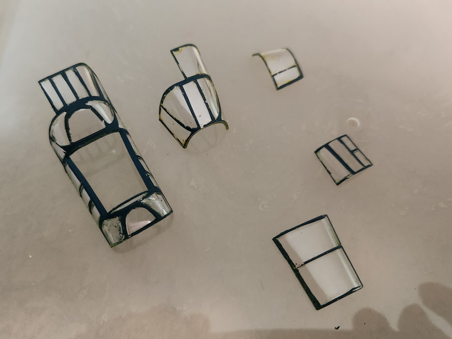 You put it on, it is yellowish but you can see through it like scotch tape. Put it in place, burnish it down with a toothpick, run a sharp xacto blade along the canopy lines, pull off the excess and you’re ready to paint. I still can’t believe how easy it was. Here is the tape on the canopies and the result after I took the tape off.