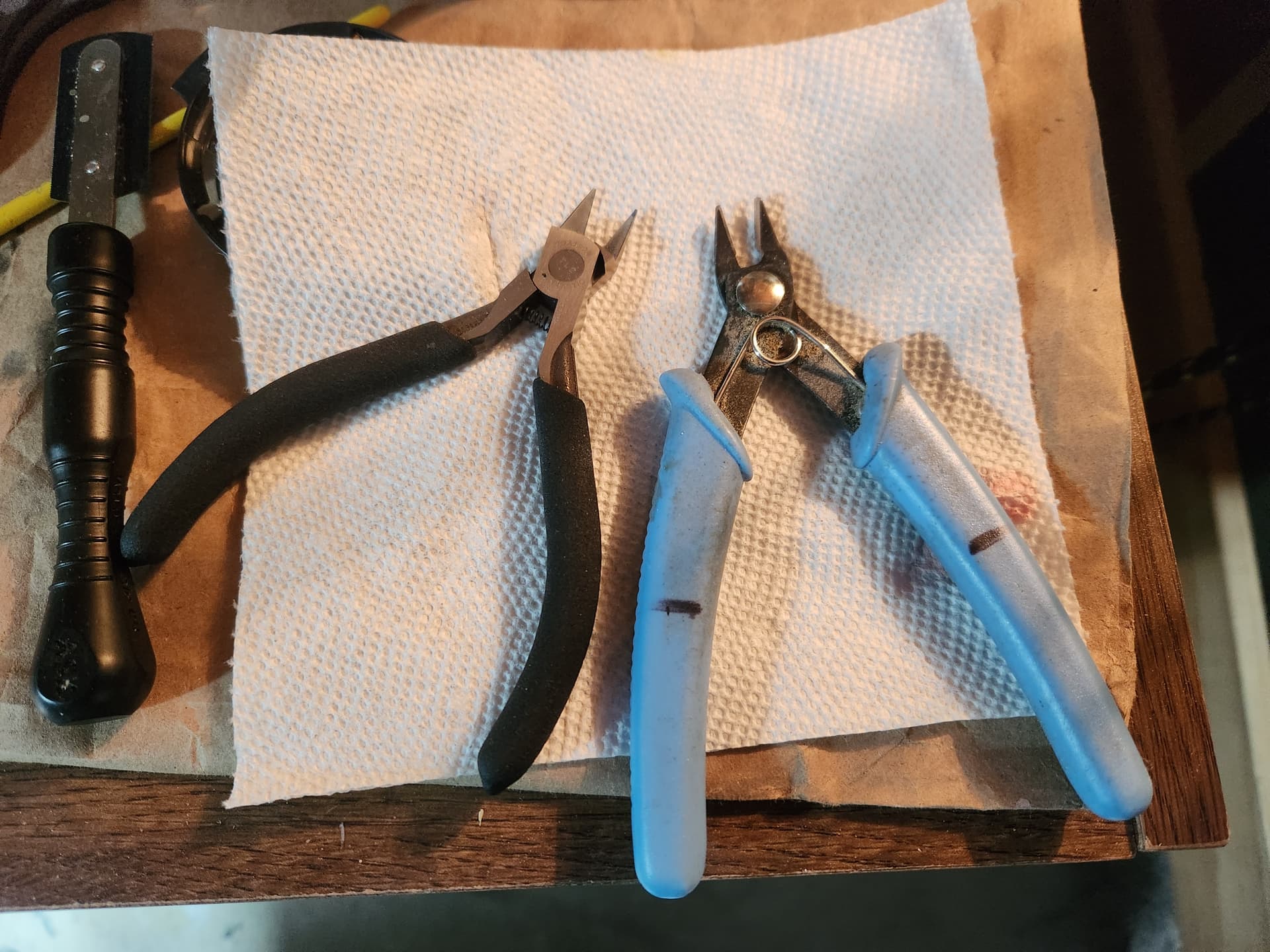 So, you need to start with a really really thin bladed sprue cutter. So far, the thinnest bladed one I’ve found is from Tamiya. Here is the Tamiya on the left and a regular one on the right.