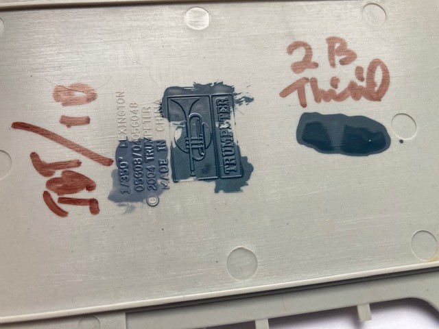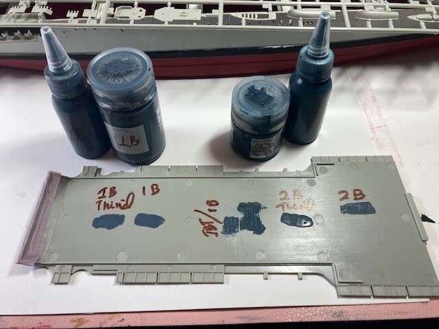 All my previous Aircraft Carriers, I either paint the Flight Deck in Wood or Grey with a brush. This time I want to take a stab at Deck Blue. From what I’ve seen it’s a Blue Deck Stain, and she looks more like a giant Blueberry. I’m just going ‘stain’ the deck and leave everything grey. So I’ve mixed up two types of Blue Deck paint. 1B approximately 30/30/30 is Revell Dark Grey and Dark Blue and Light Blue. 2B is Testors with 50/50 Dark Grey and Dark Blue with a little white added in.