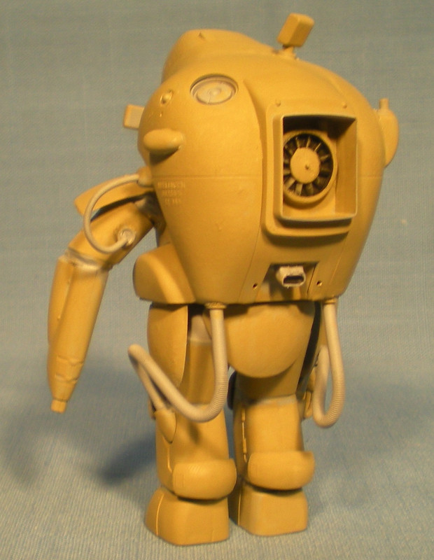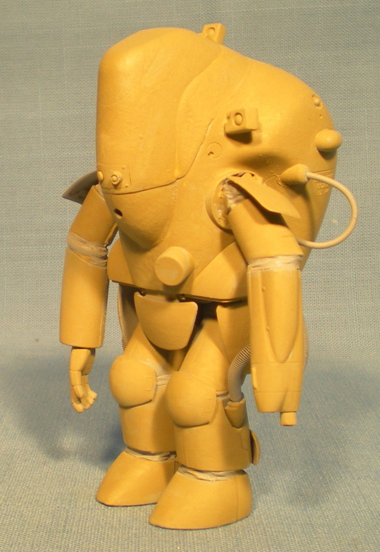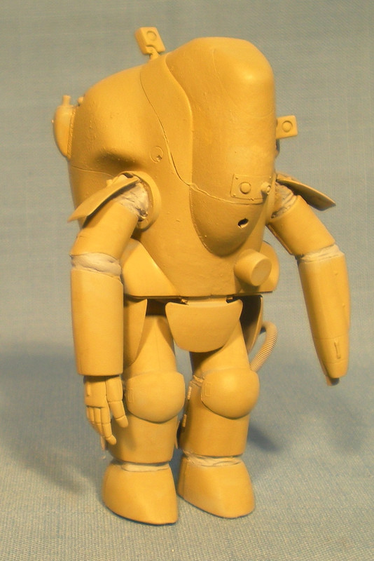 Here’s an example of a model with relatively large areas, with a color coat laid down by hand (over Mr Surfacer, stippled for a cast metal texture). Tamiya’s Dark Yellow on a Wave Maschinen Krieger Melusine: