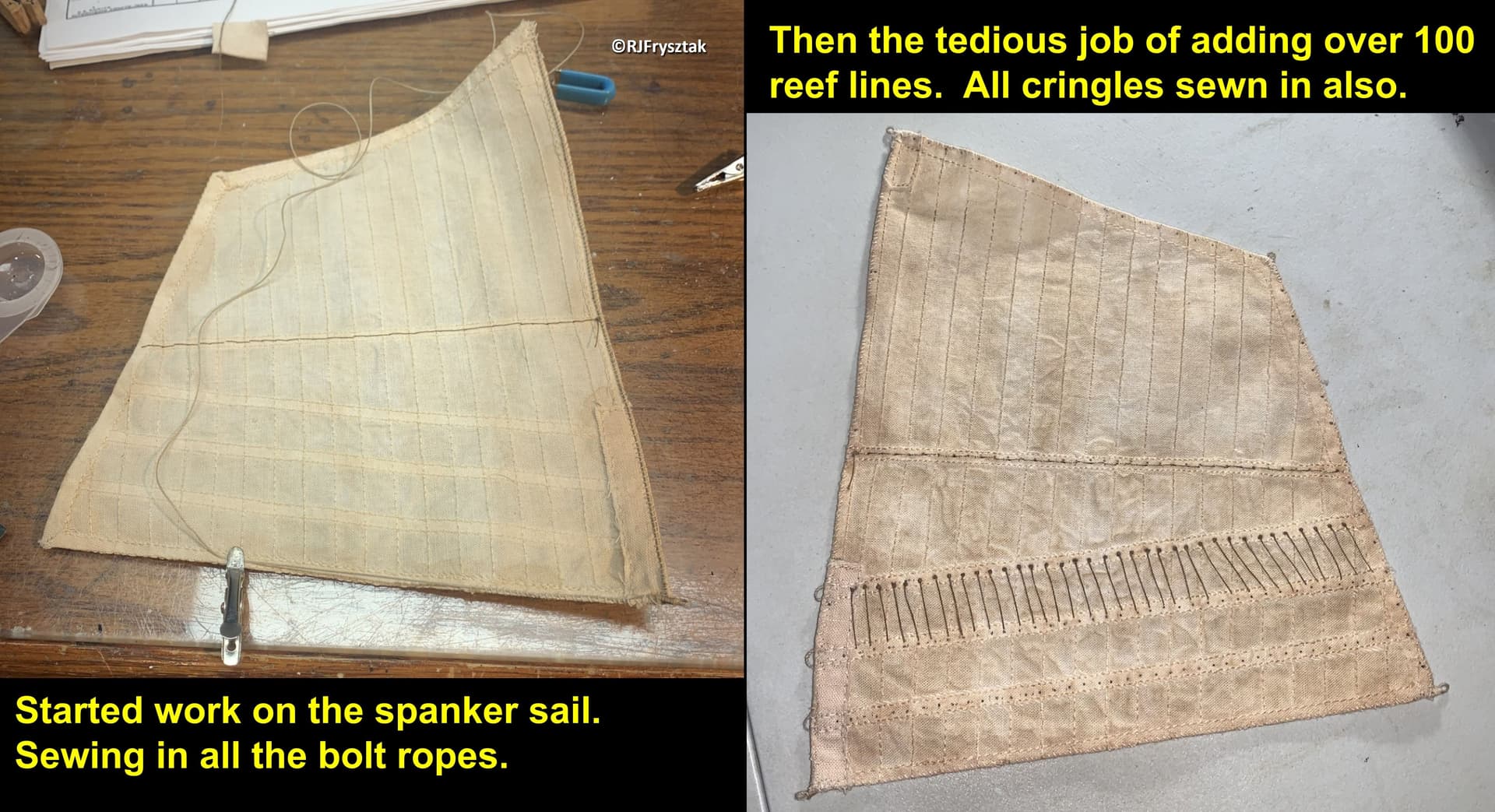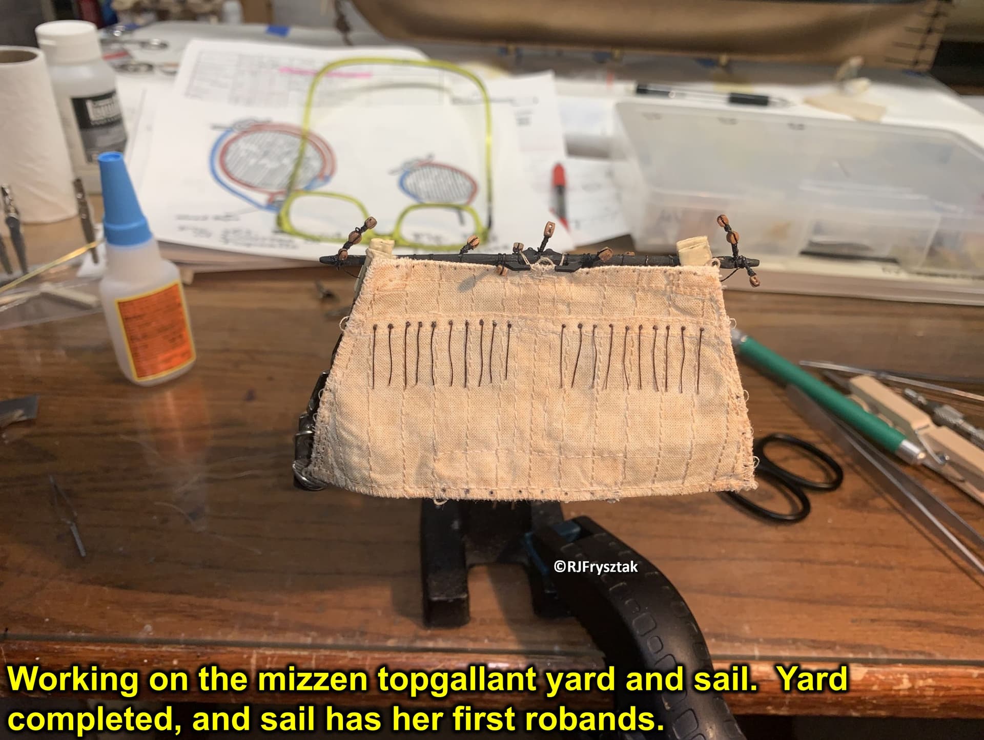 So finally back to the bench working on MY Constitution. Fabricated the mizzen topgallant yard, added all the blocks, stitched up and finished the sail, and bent it to the yard using robands.
