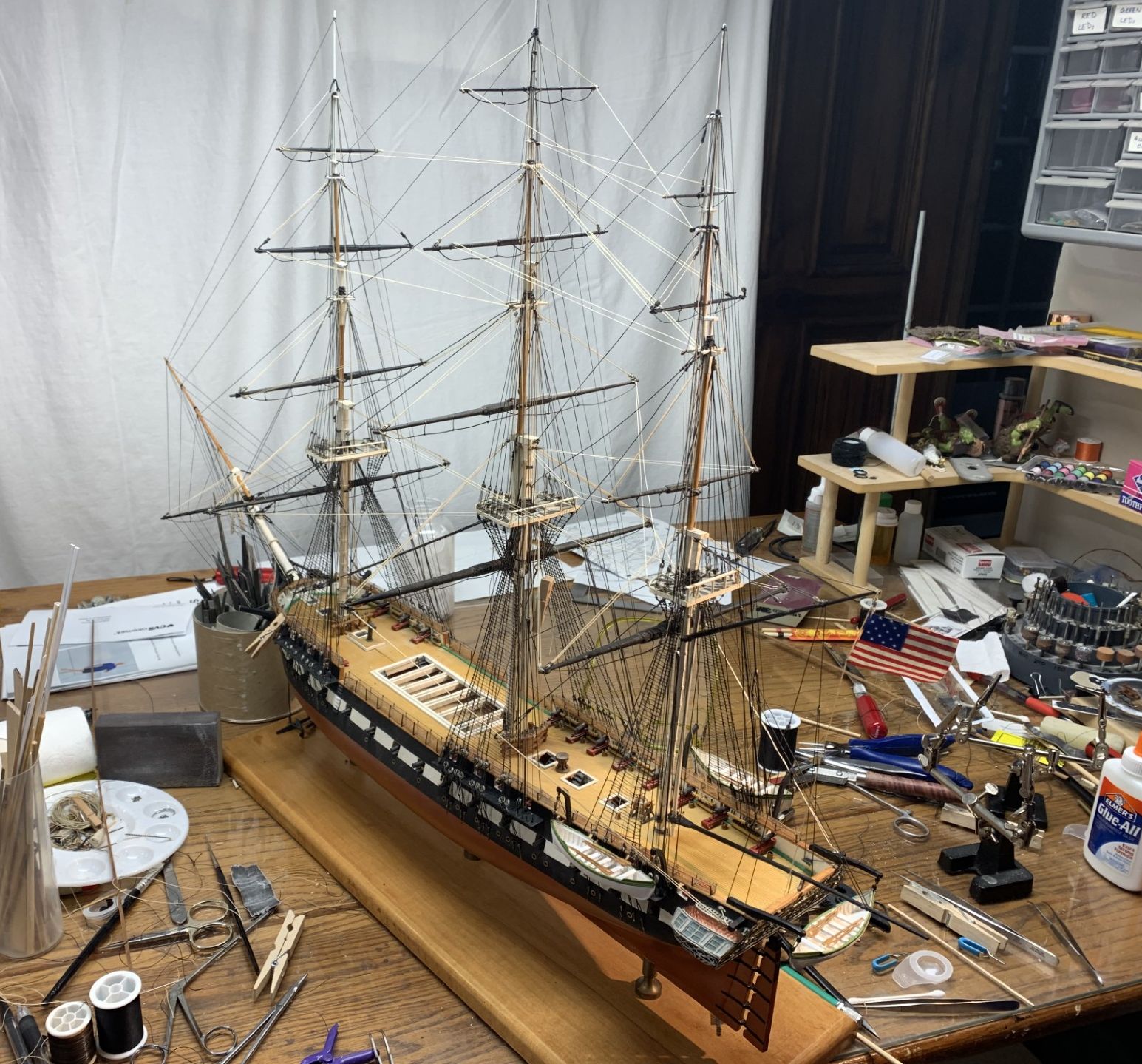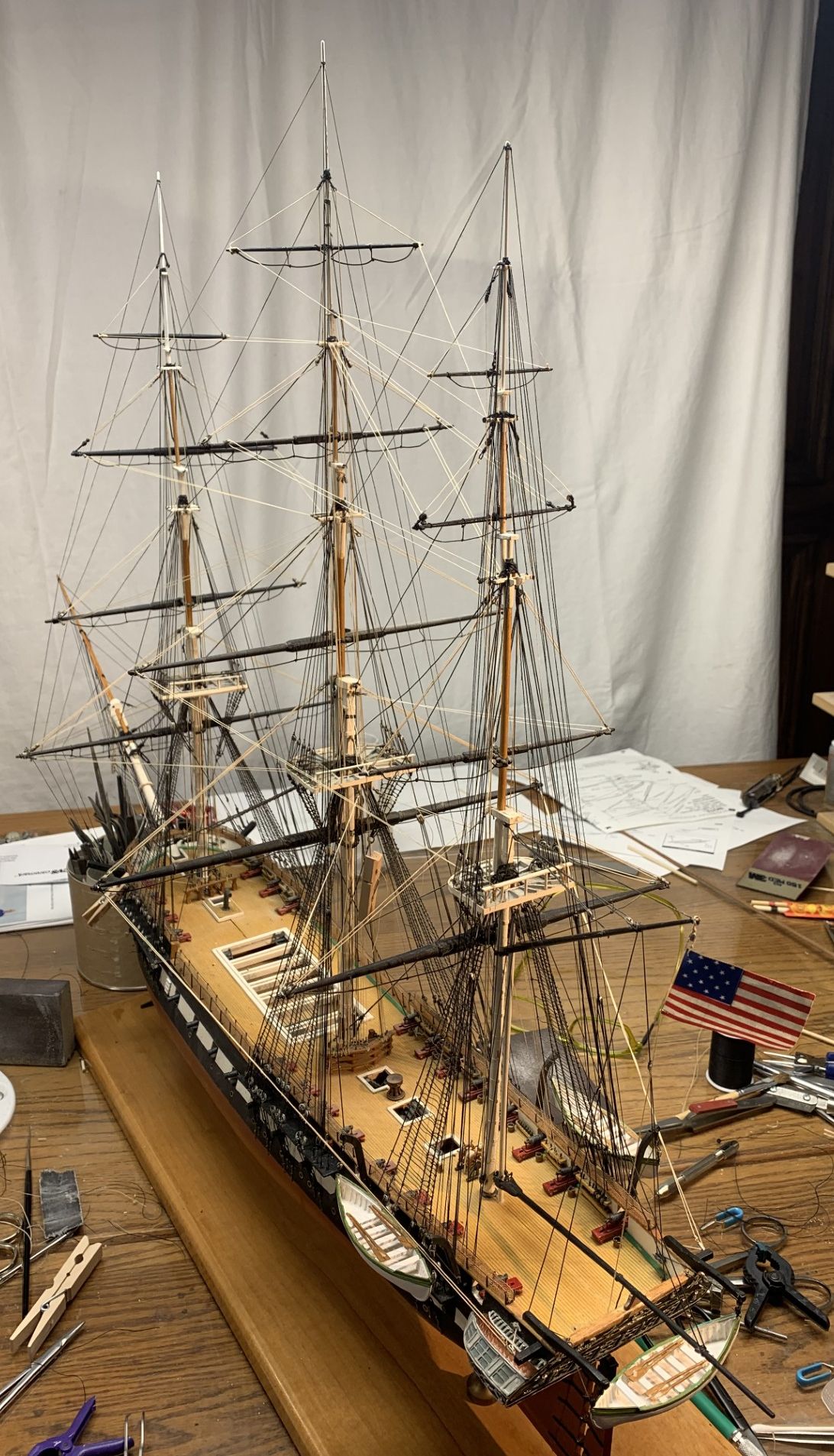 I’m about a year behind you in my own Constitution build and I’m committed to building her as she looked at the height of her engagement with the Guerriere including the crew and marines. I won’t have as many sails as you to deal with (fighting sail only) but have to make them look realistically furled. I plan to embed the ship in “ocean water” too- we’ll see if I can manage that. Your careful and well documented rigging photos and notes are a big help to me. Thanks!