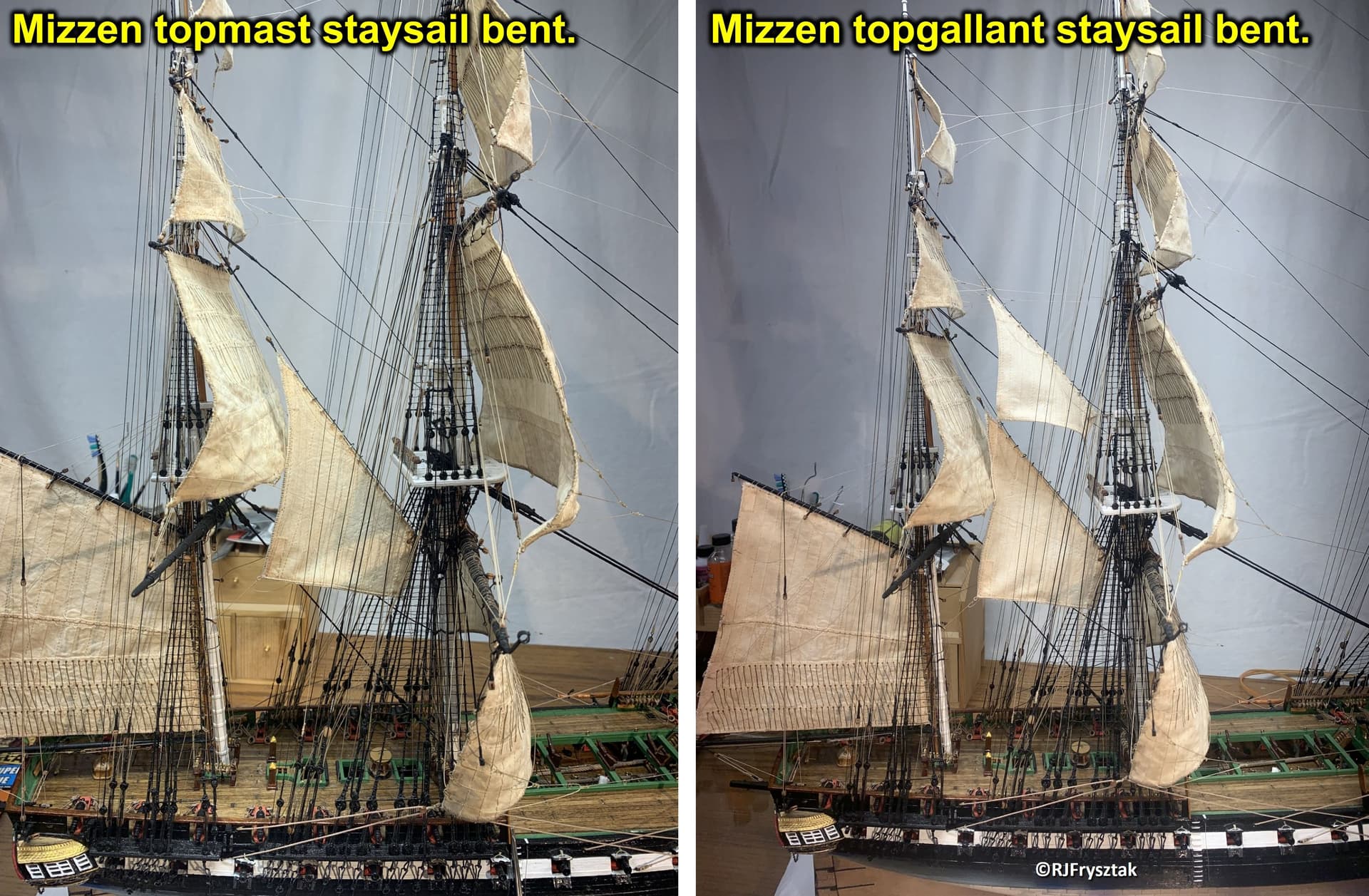 Have the mizzen topmast and topgallant staysails bent to the stays with hanks. All halyards, tacks and sheets are done and tied off at the rails. One more to go.