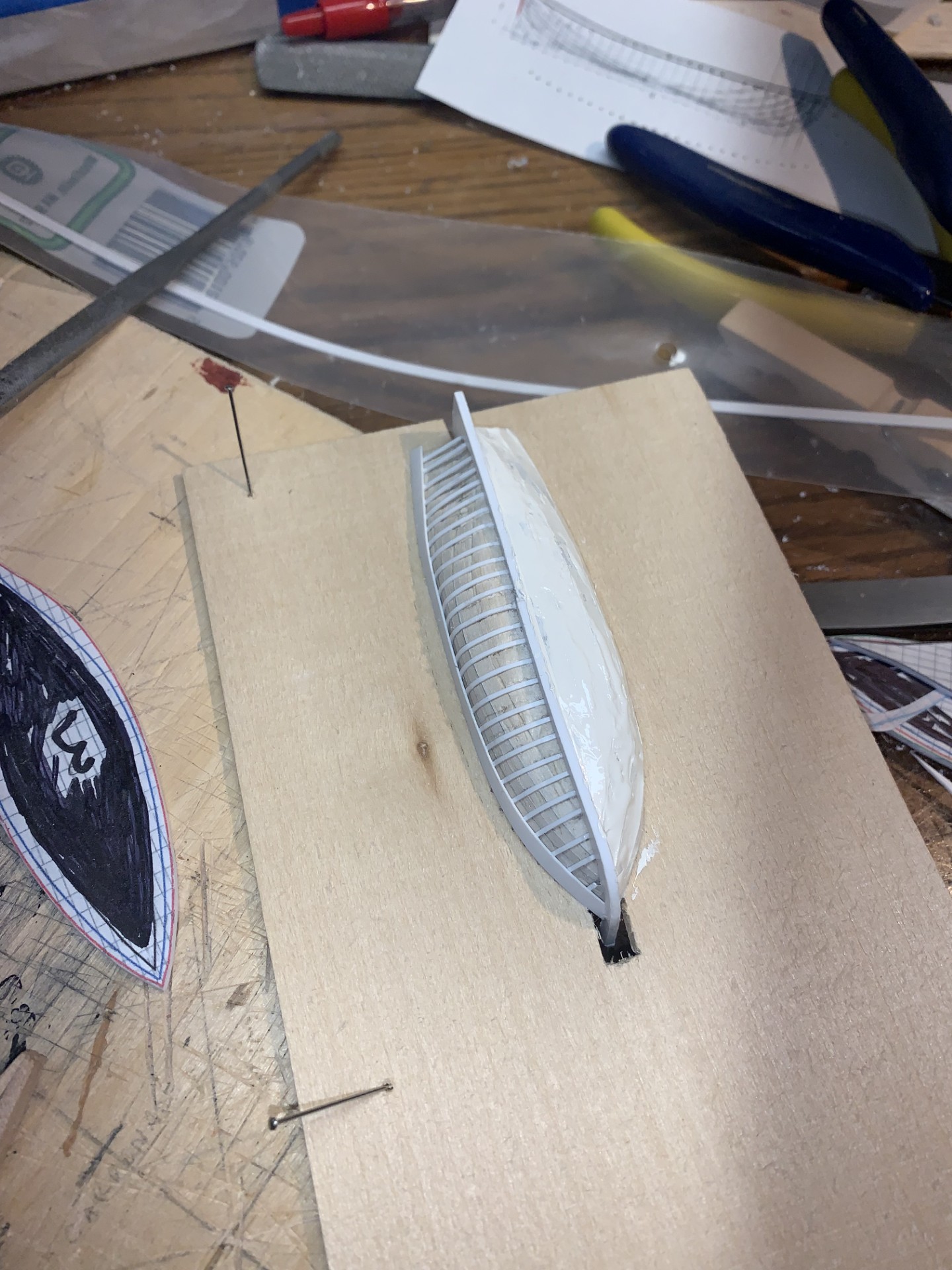 So finished up the mizzen staysails. Then went back and put in both the mizzen and the main braces. Also added all the blocks for the main staysails and foremast braces. Also started fabricating the 28’ cutters for the port & starboard davits. Since whaleboats weren’t delivered until very late in 1812, I decided to go with the cutters. Will also build a 25’ captains gig for the aft davits. Created a solid boat using the line & mold lines (old “bread & butter” method) out of balsa so I could easily shape it. Then glued it lightly to a board and drilled holes for the 27 frames. Used very fine styrene for the frames and then added the keel. Planking over with .015 styrene strips and used a bit of putty to cover the small gaps. Will probably put a second planking over that using thinner styrene strips and sand it down. More as I get further along.