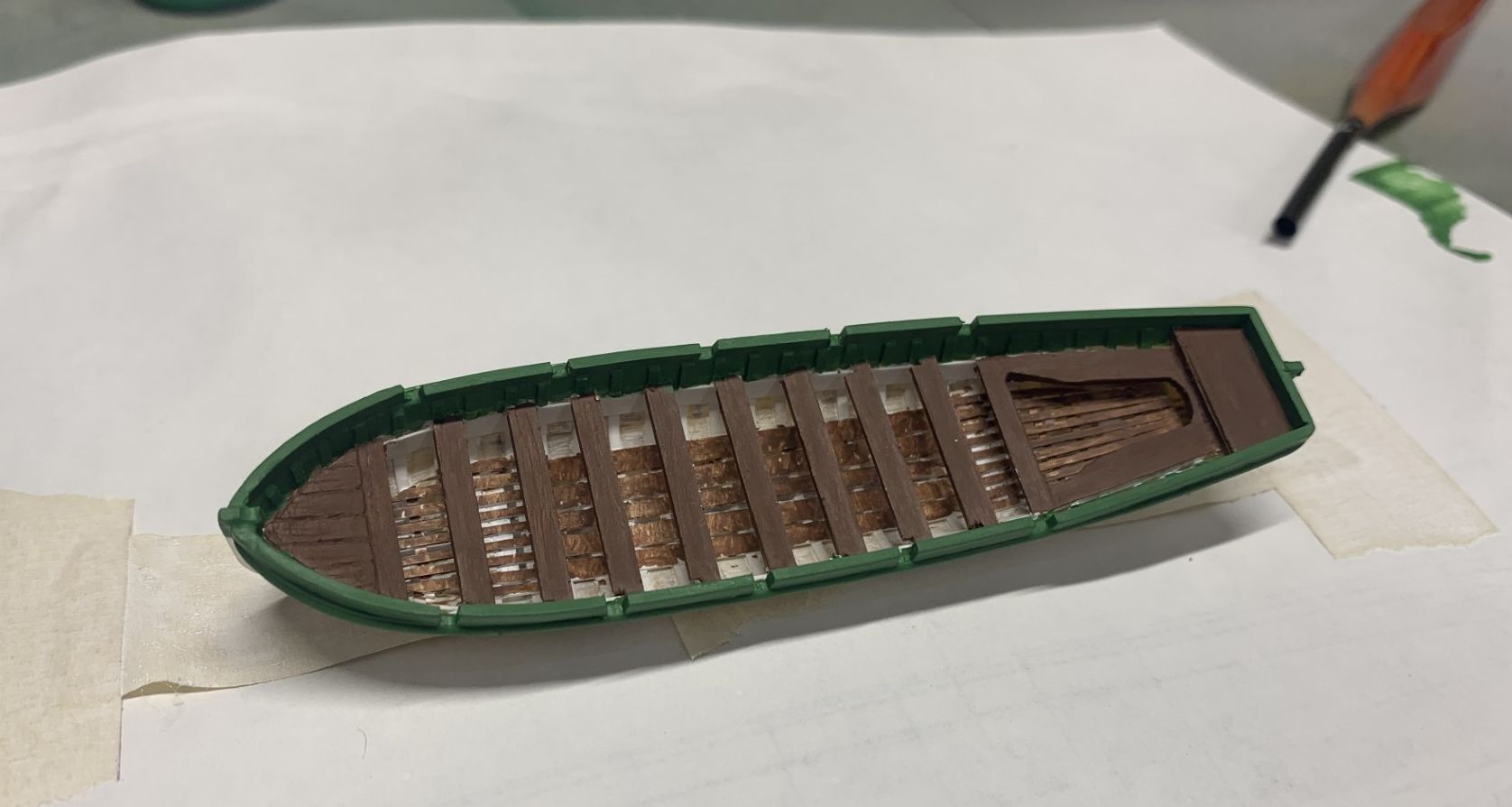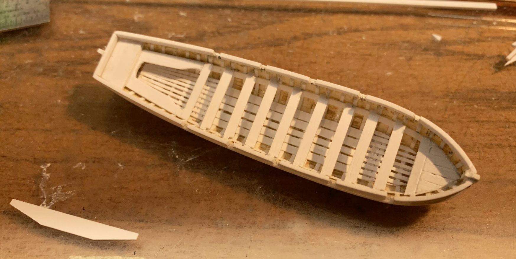 Here is the barge modified and painted. She now has the correct number of ribs and thwarts, and also a rudder (not shown). Used styrene to do the mods, as she will be hung from the masts simulating recovery/stowage onto the 34’ launch.