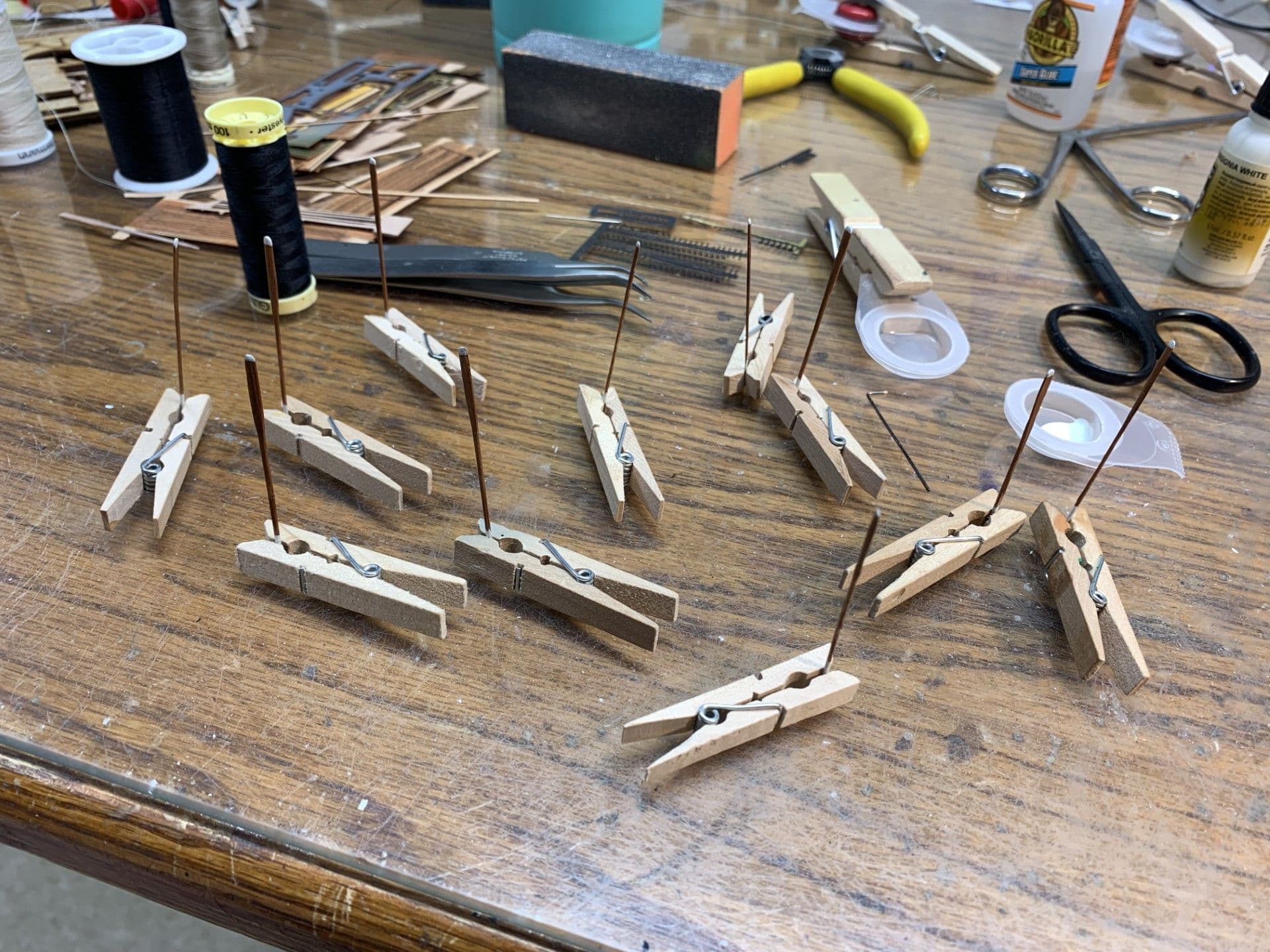 Boats for the davits have all been completed. Now on to the fun task of making wooden oars. Got a dozen or so completed, stained, painted and varnished.