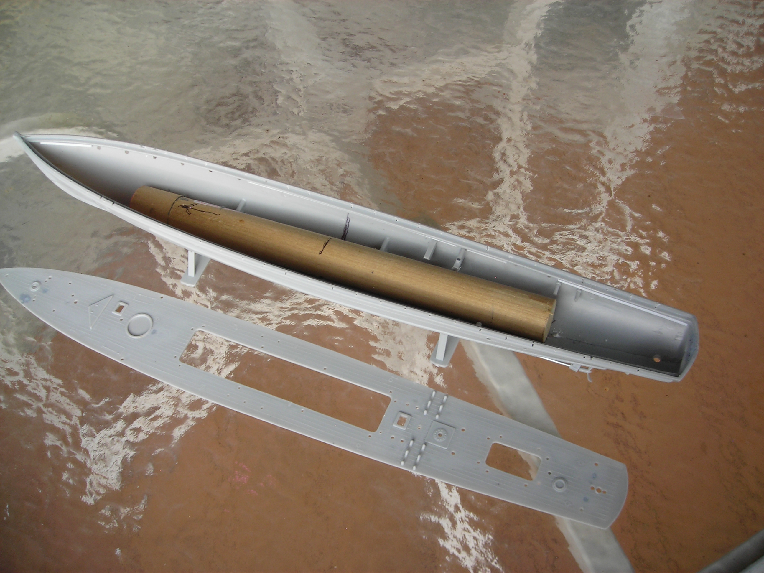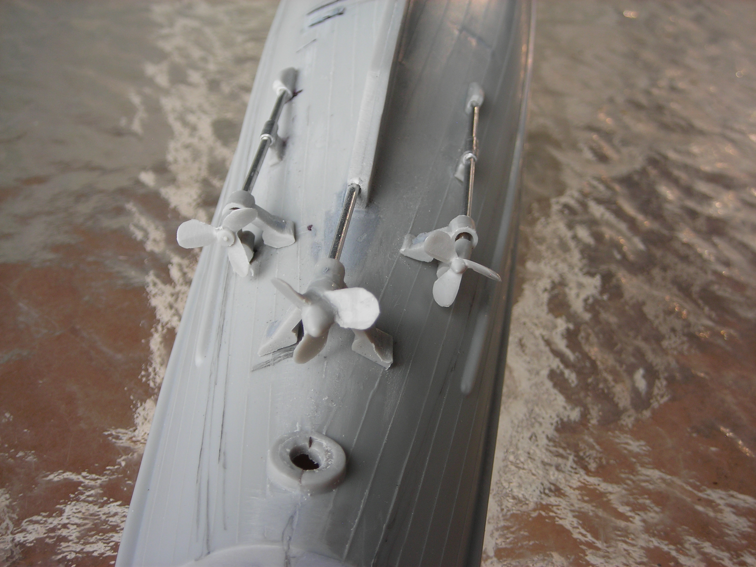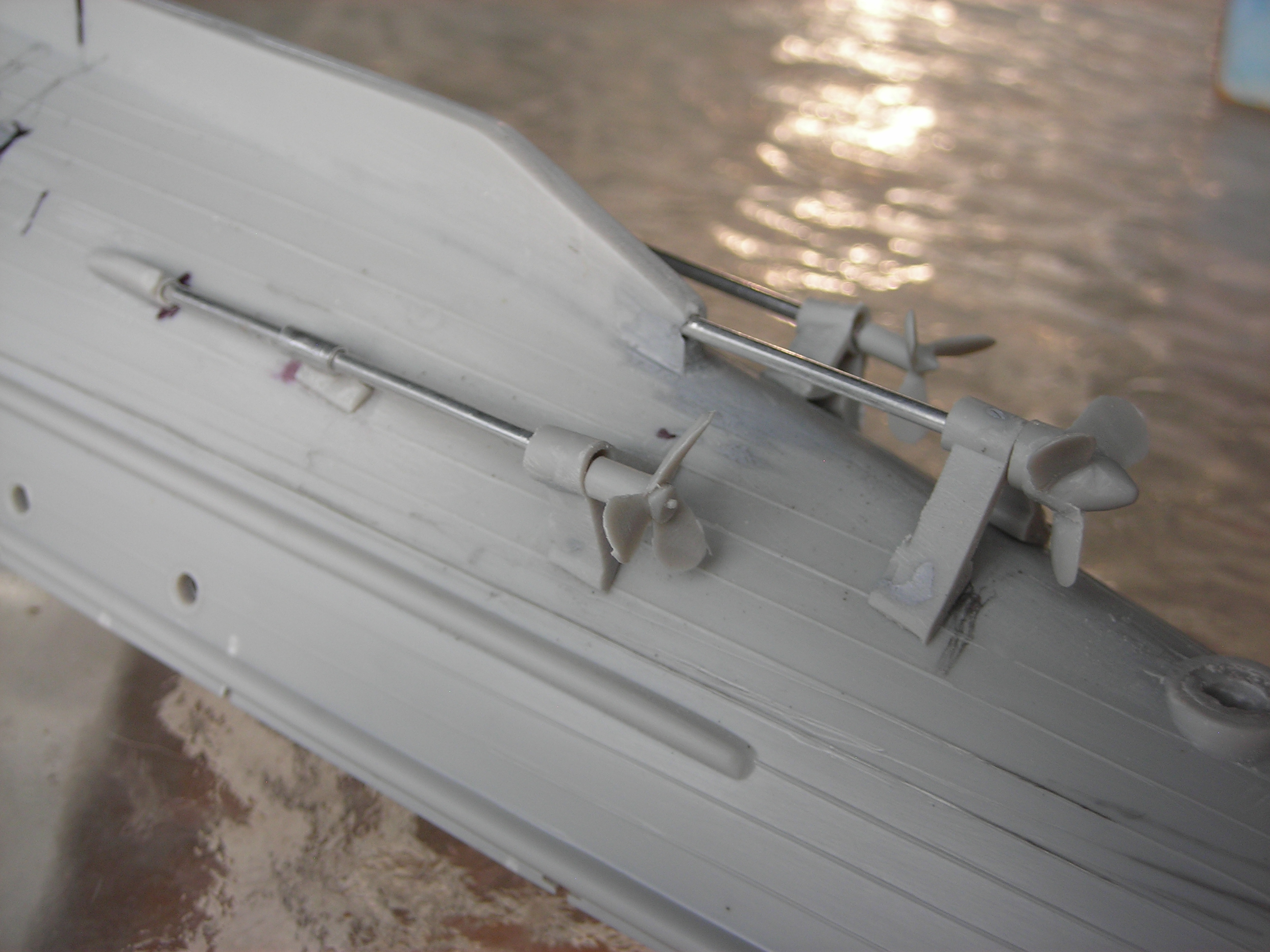 Some of the things I did were The 1’ dowell in the hull, the Scaledeck wood deck , the railing done with .032 brass rail posts & .020 pvc top rail & .o15 lower rails. I wasn’t happy with the plastic rails this time. Pilot house rail. Lifeboat extra detail, I ground the kit boat sides out to thin them & sande the seats down to fit lower & added oars & rope rings. The masts & flag poles ,I made from 3/32 & 1/16 aluminum tubes. That is all I want to use for this size masts. I added the lit mast tops . I ground the searchlite out & used my Chrome paint pen in it. I cut the plastic prop shafts off & used 1/16" alum tube for shafts. I reworked the gun & added some brass wire & extended the gun barrel with some fine plastic tube & a brass whell from a 1/32 Spitfire PE kit. I added an extra depth charge rack at the rear. It is not on the model yet, but it’s done. I made life rings from WW1 plastic kit fighter tires.