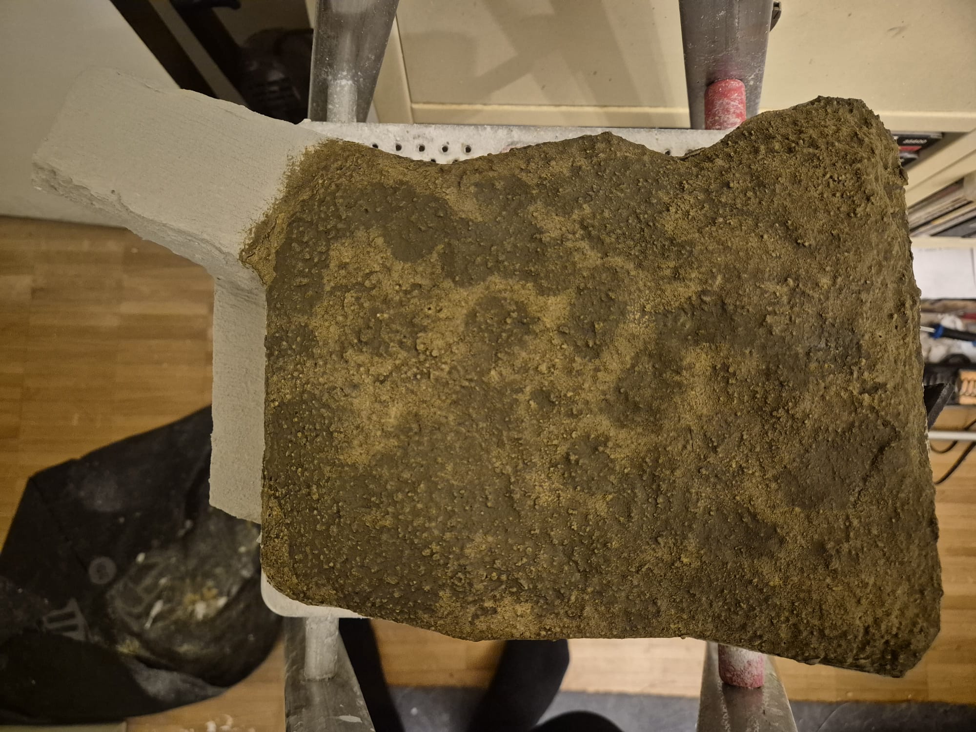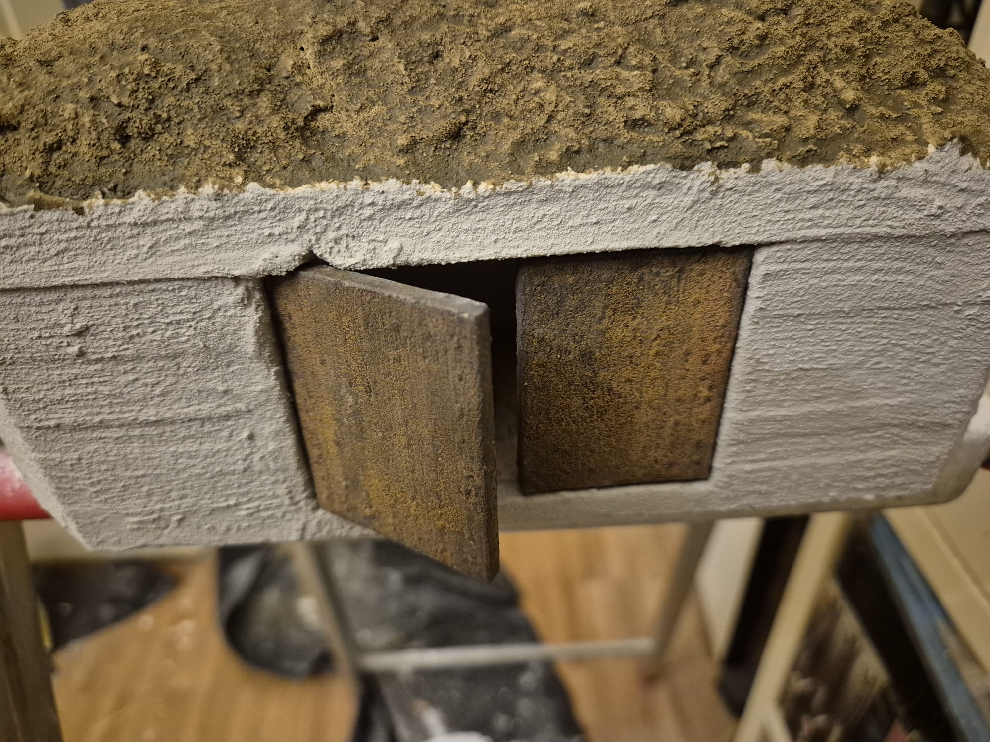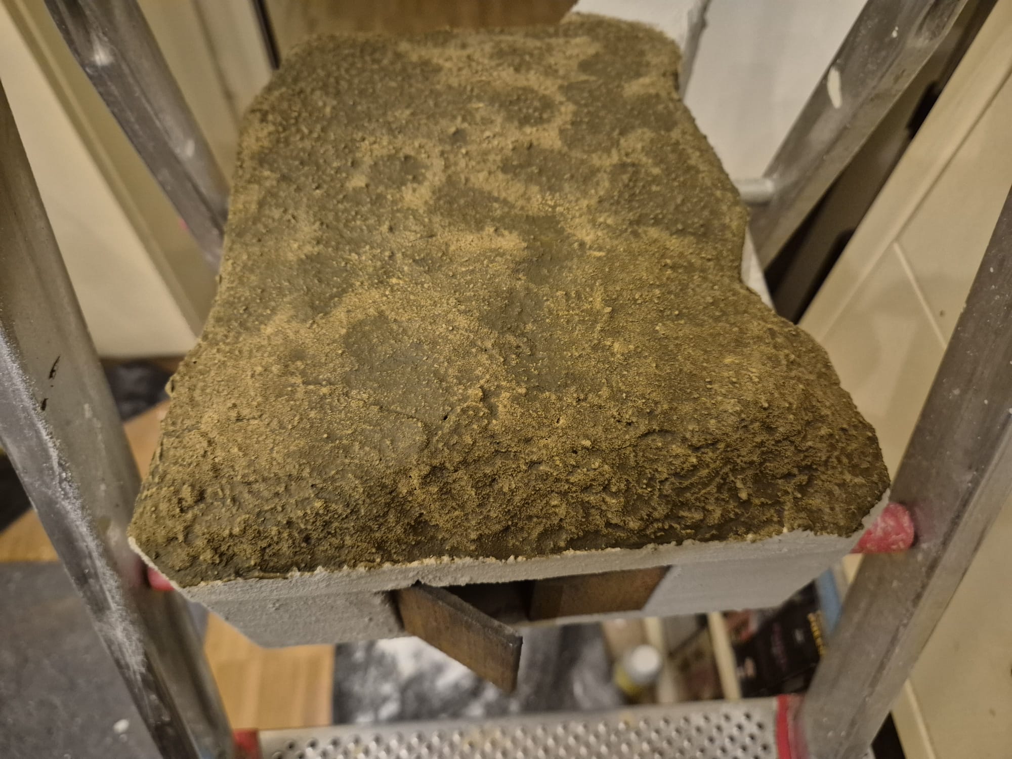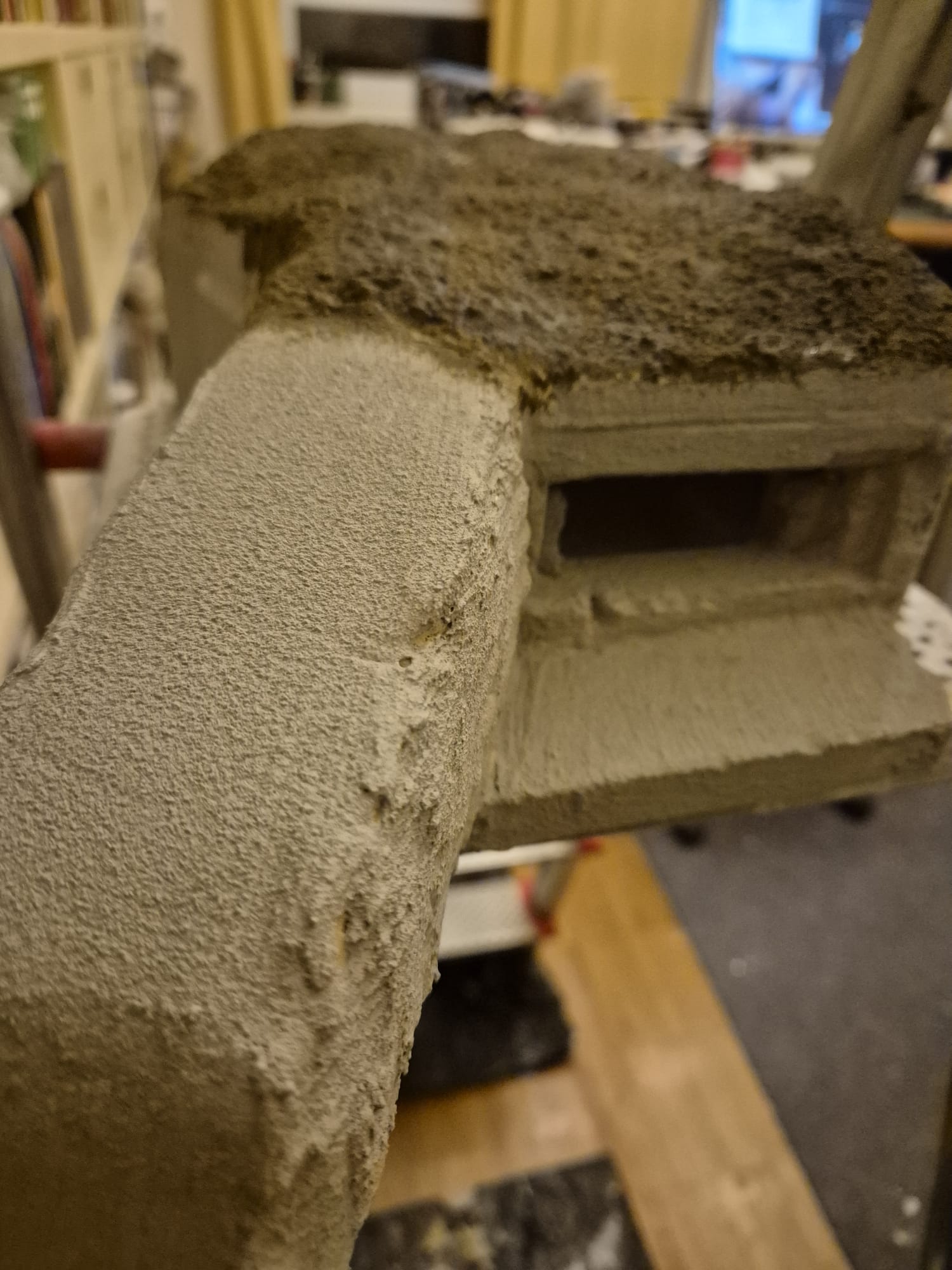 The protection wall, although already built in hard plaster, lacked the necessary details which I could not add on that material. So, in order to finish it and define it a bit better, I added a very thin layer of air drying clay mixed with water and despite being thin, it tended to stick to everything requiring additional lukewarm water and a spatula to be evenly spread along the side and upper surfaces of the wall. I also used a water filled paint roller sponge to make it smoother. Once this was finally achieved I pressed a medium sized wooden stick into the clay to simulate the horizontal shapes of the concrete stones, then, with a smaller stick to which I cut its rounded ends, proceeded to do the same for the vertical imprints. Tomorrow i will proceed with the outer facade of the wall and do the same. The upper one seemed to be smooth, so I just passed over it with a large spatula applying rotating movements and then a full downward pass to completely flatten it.