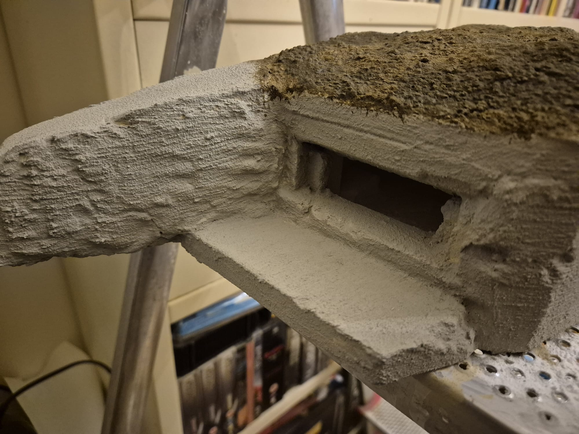 Here are a few preliminary pictures of what I am doing. Since the rooftop of the R677 had a funny shape, by no means realistic enough I covered it all with Light Weight Plaster by Woodland Scenics by pouring it summarily over on its top simulating the terrain which actually covered the roof. I fixed it by spraying it with a mix of Craft glue mixed to Aliphatic glue and water. I sprayed the mixture from above with a sprayer. Due to its nature, once wetted the material starts to show tiny bumps like on a natural terrain surface. This will later be further refined with actual terrain surfacers and vegetation.