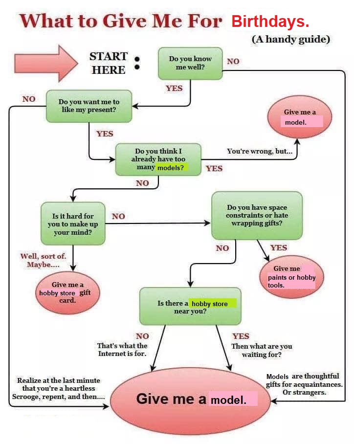 Ohhh, we need a gift registry thread! “What to get your modeling nerd”. It could be in categories like Aircraft, tanks, tools etc. I bet my wife would love that as right now, she would have no idea without straight out asking me, which is exactly the same as my going down and buying it myself.