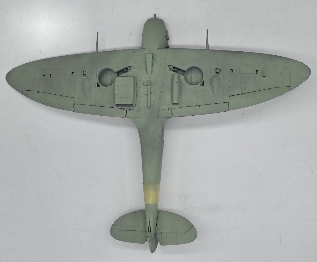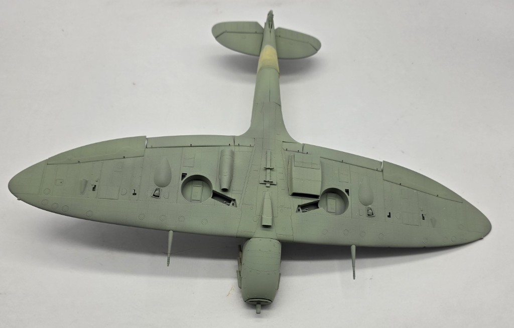 Also got back to work on the Border Spitfire Vb…underside Sky is on…have some putty work to do topside before the top gets sprayed.
