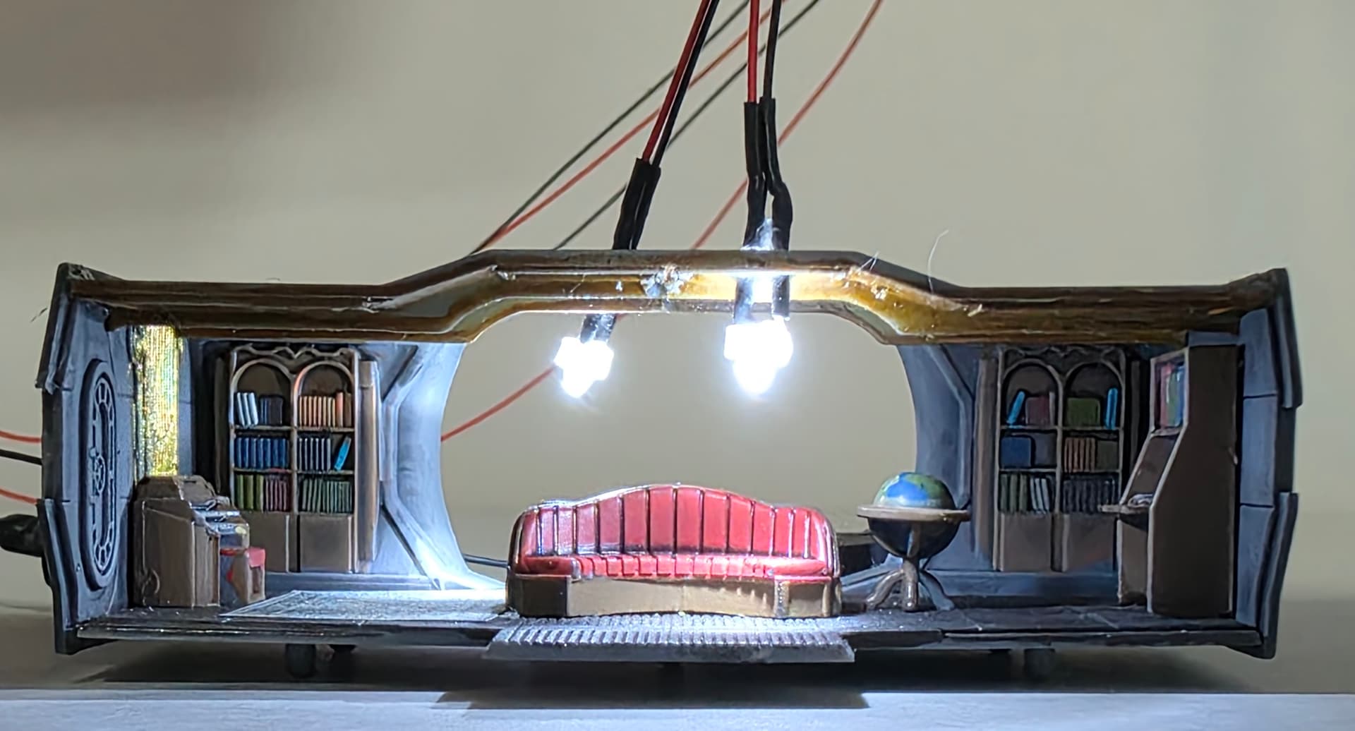 The lights and accessories from Evans Designs came in and I was able to set up Nemo’s lounge on the Nautilus. Gotta figure out how to feed all this through the sub and into the base.
