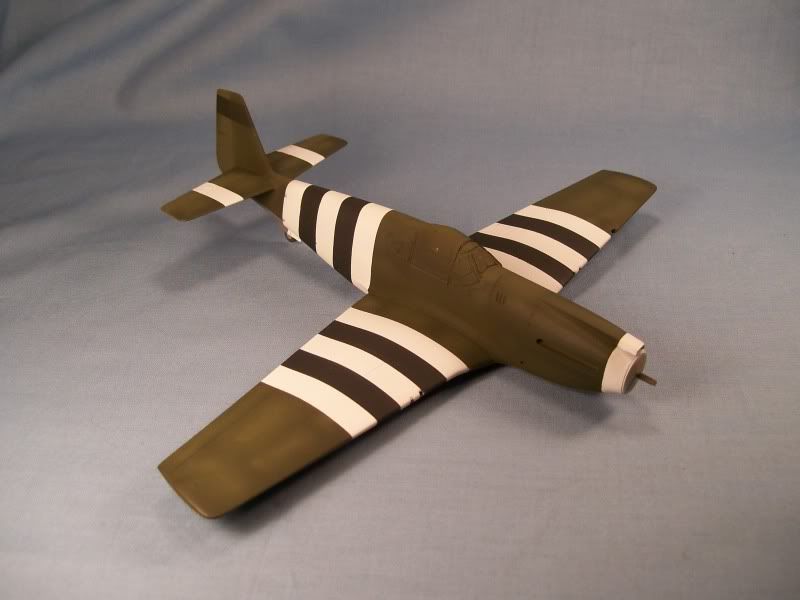 Max your 51 looks great. The A models are my favorite. The invasion stripes look great. I also wonder how to correctly apply the stripes. I have seen some pic of some planes that the stripes look like they were painted on with a broom and probally were. Like previously stated it probally depended on the crew and how much of a perfectionist the guy doing the painting was or how many planes he had to get done in that short period of time. Without reference pics of the exact plane its tough. I did my F-5 with upper stripes painted out and the lower ones done a bit on the rough side. When it was done it just looked right to me. Not to sloppy but not razor sharp either. Either way that is one nice P-51 you have there. Can’t wait to see her with some decals.