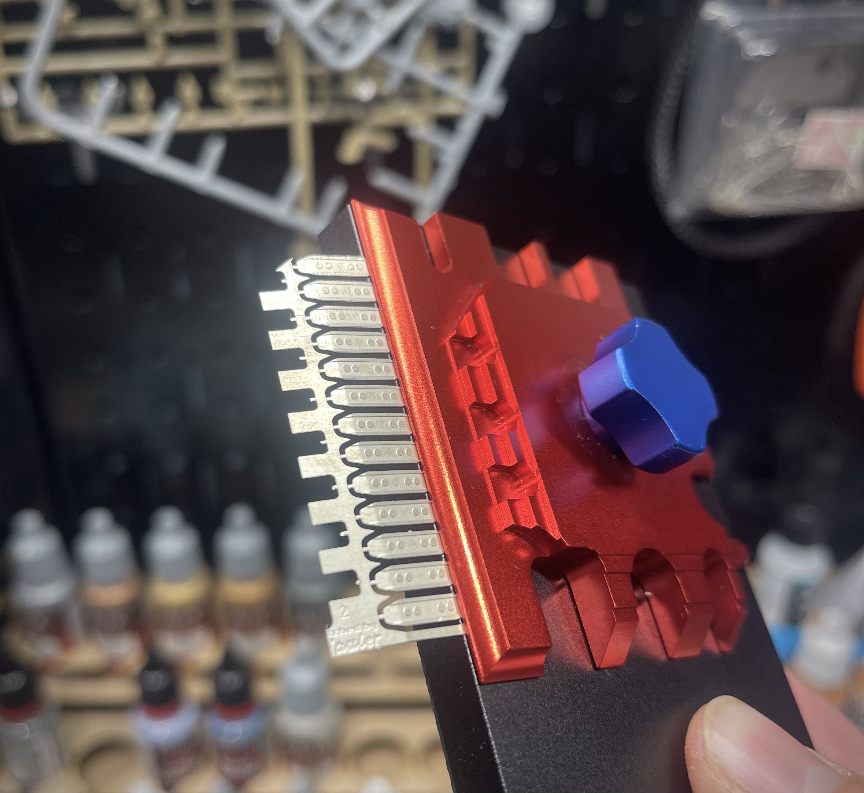 I used this cheap PE bending tool to get the track treads bent properly. I can see why it’s cheap: it’s very hard to align perfectly. Despite its precision-machined feel, it’s actually quite sloppy, and that little knob always sticks once you get it tight enough to hold the metal securely. Still, bending this PE set would have been nearly impossible, or at least would have taken a week, without it.