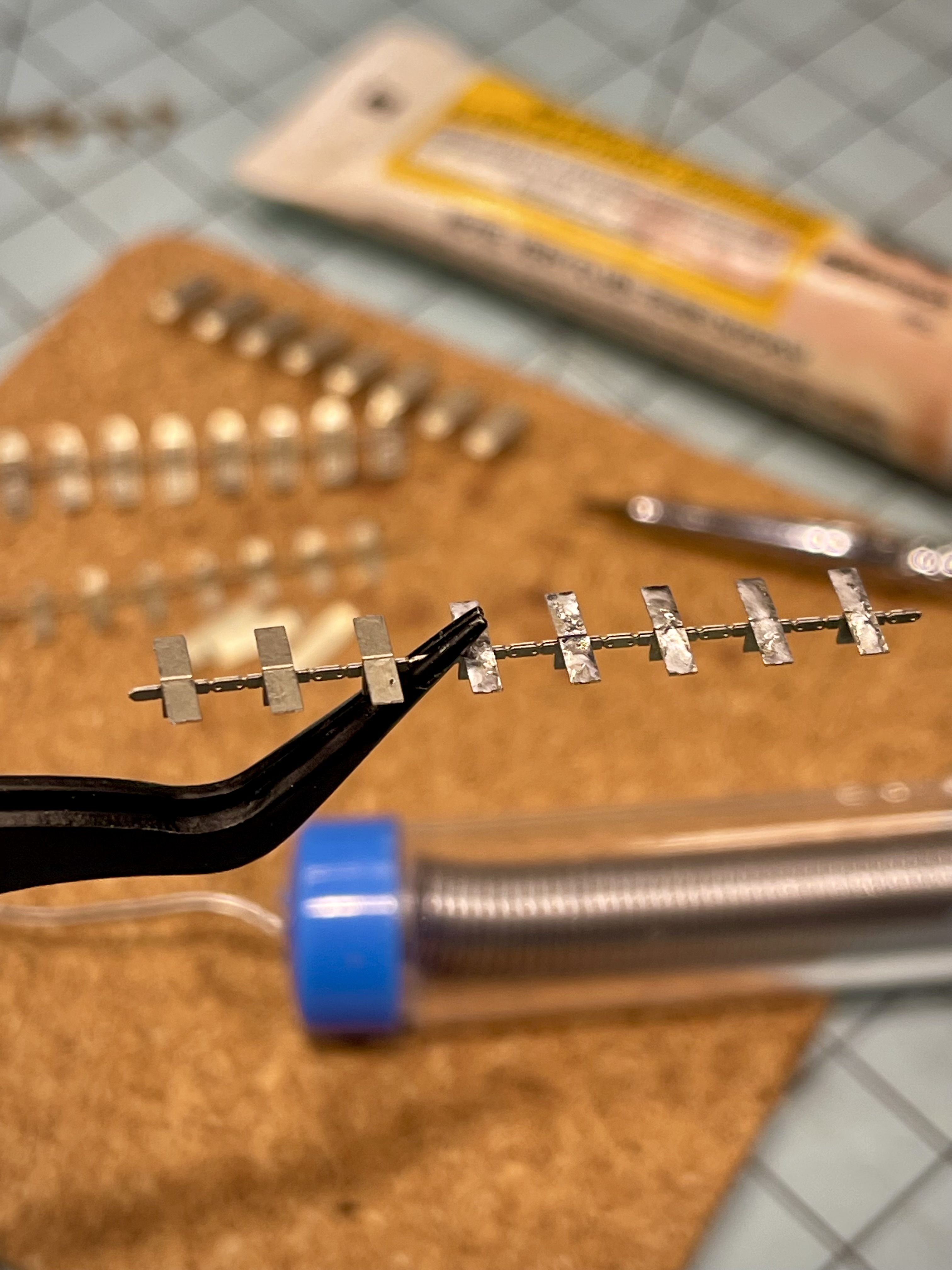 Then after watching this handy FSM video I got brave enough to bust out the soldering kit. I’ve had enough of superglue failing and losing PE parts at critical moments, and I knew I’d be manipulating these a lot, so I needed the extra strength.