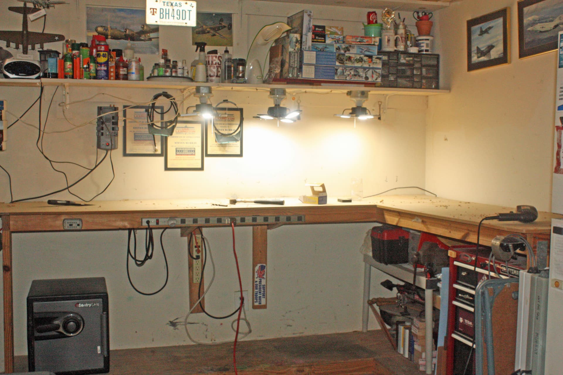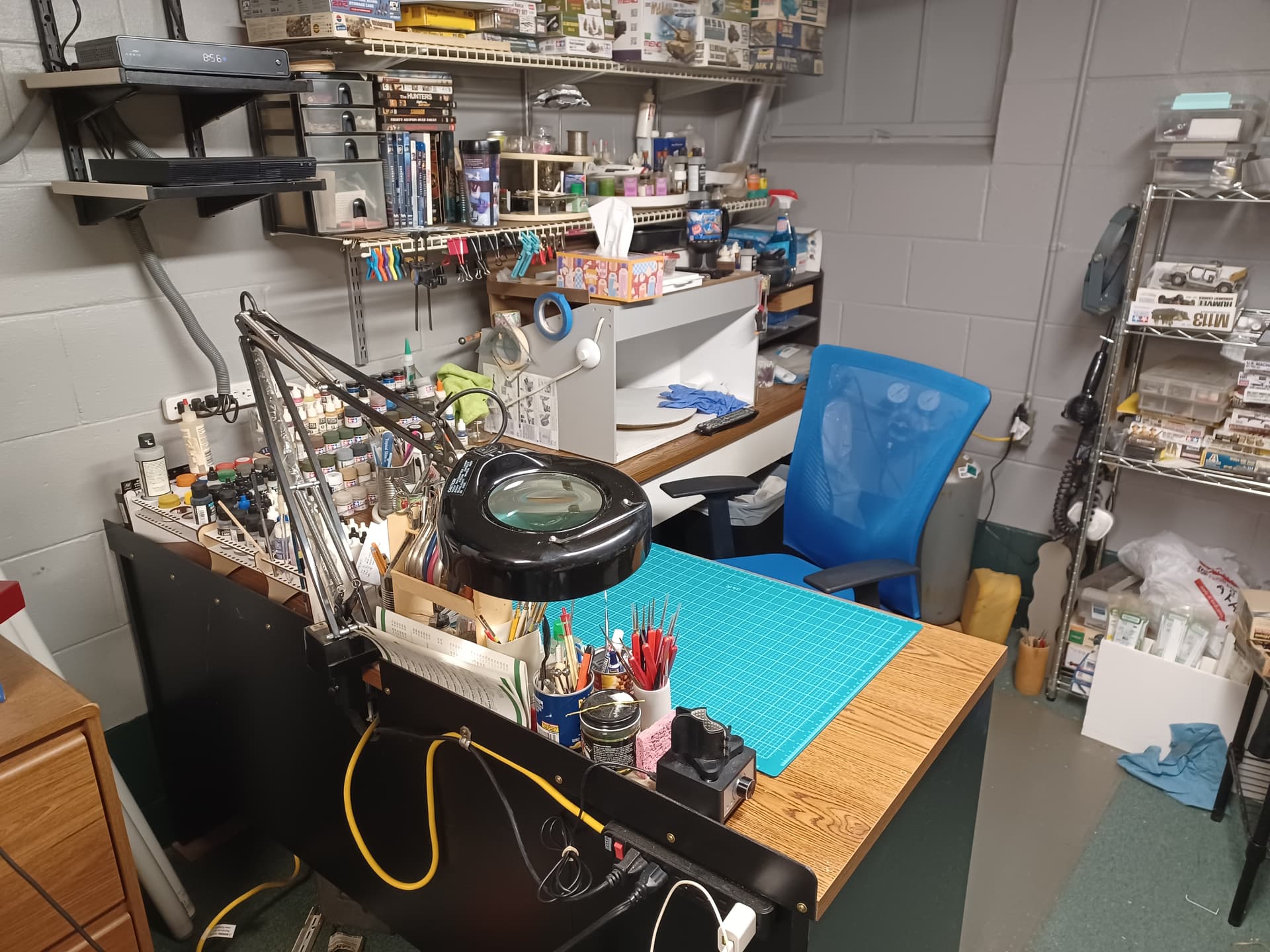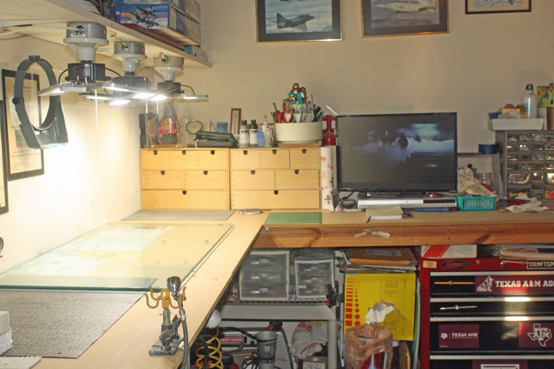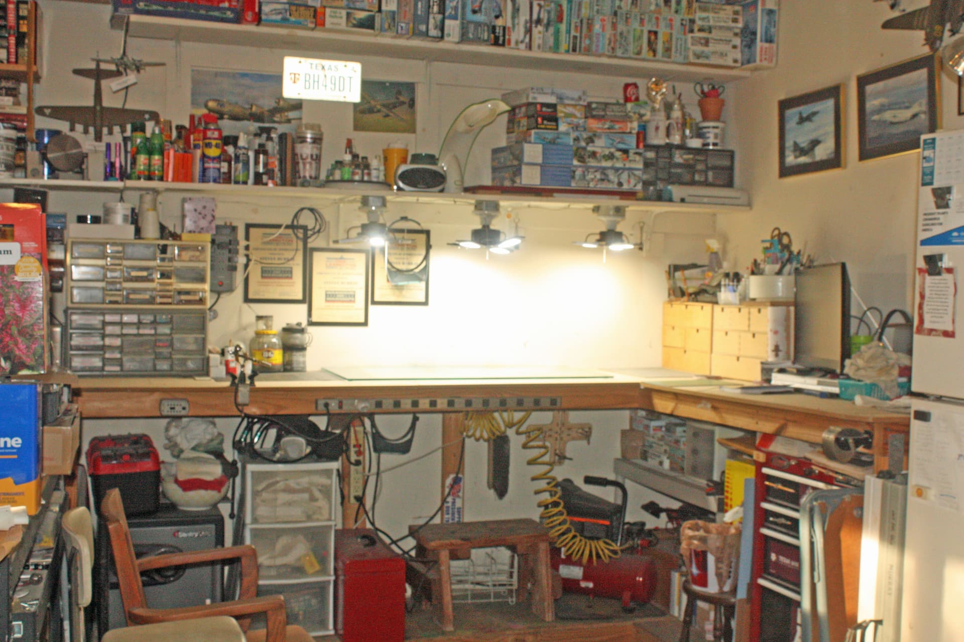 I have a third bay in my garage that has no garage door, so it is my work area. I built a custom workbench in an L shape along one huge corner. I augmented it with a Craftsman tool box which I built into one end of the bench. This is where I store all of my paints and other modeling supplies.
