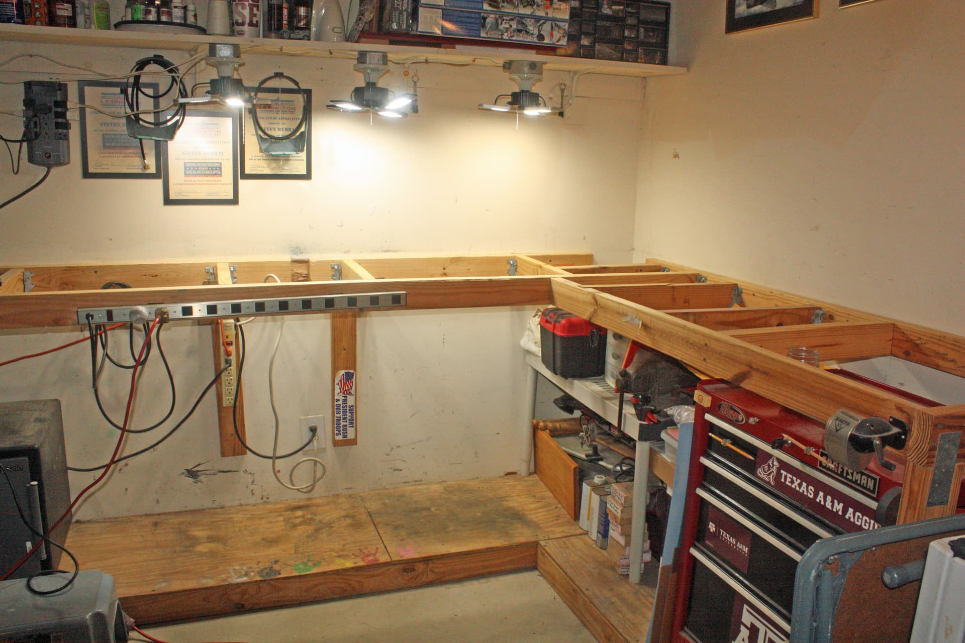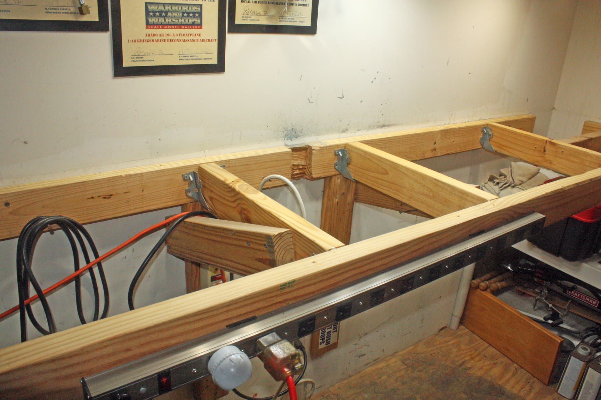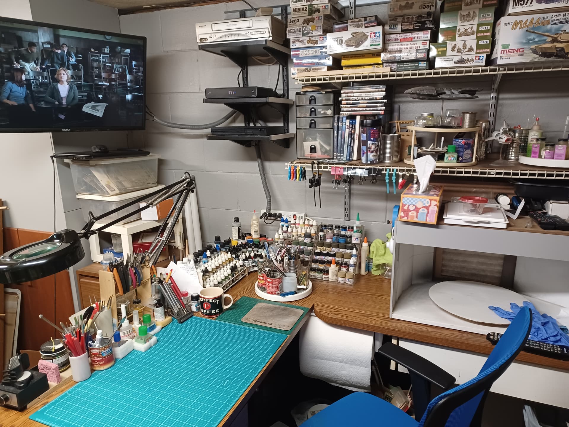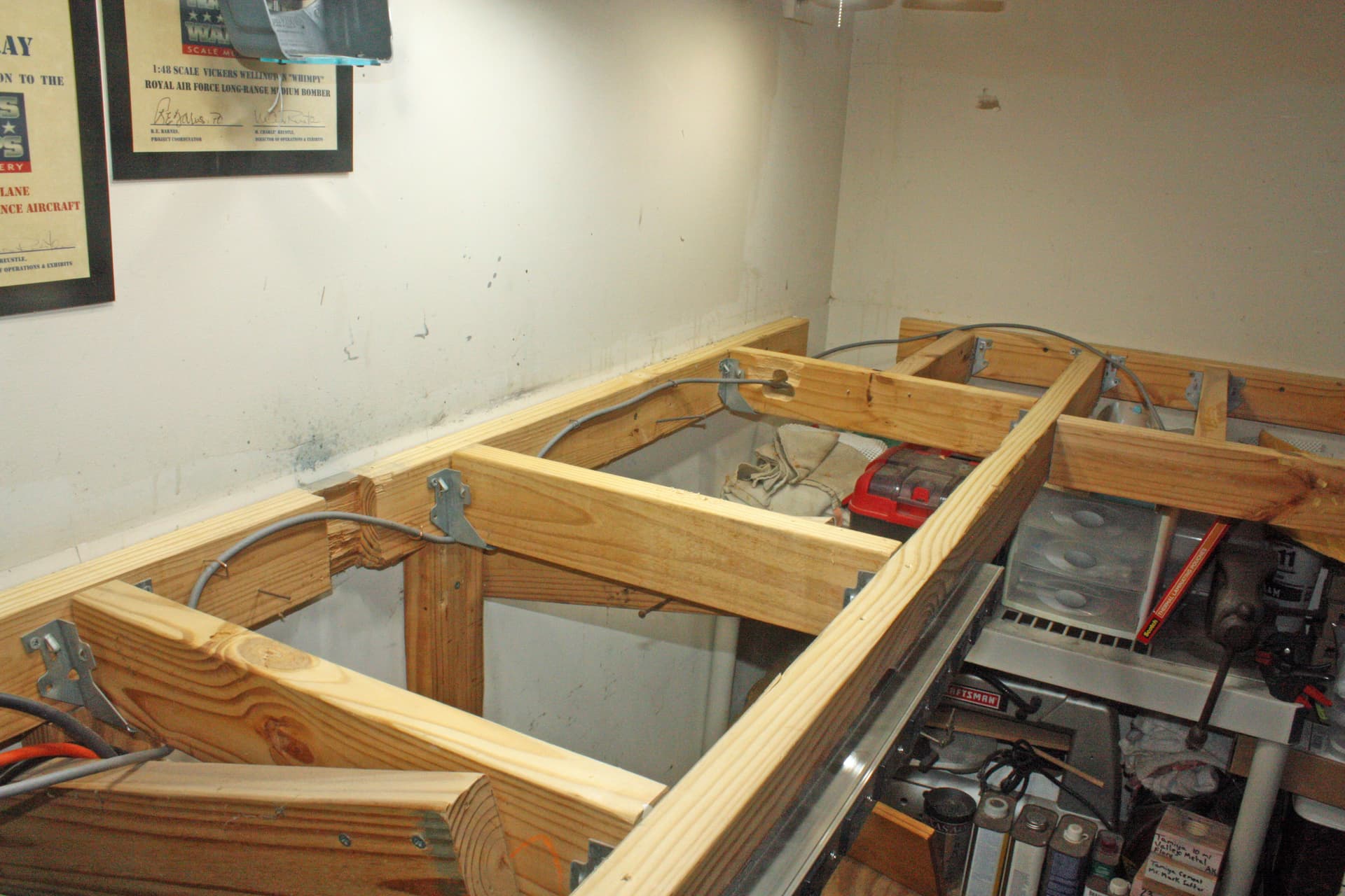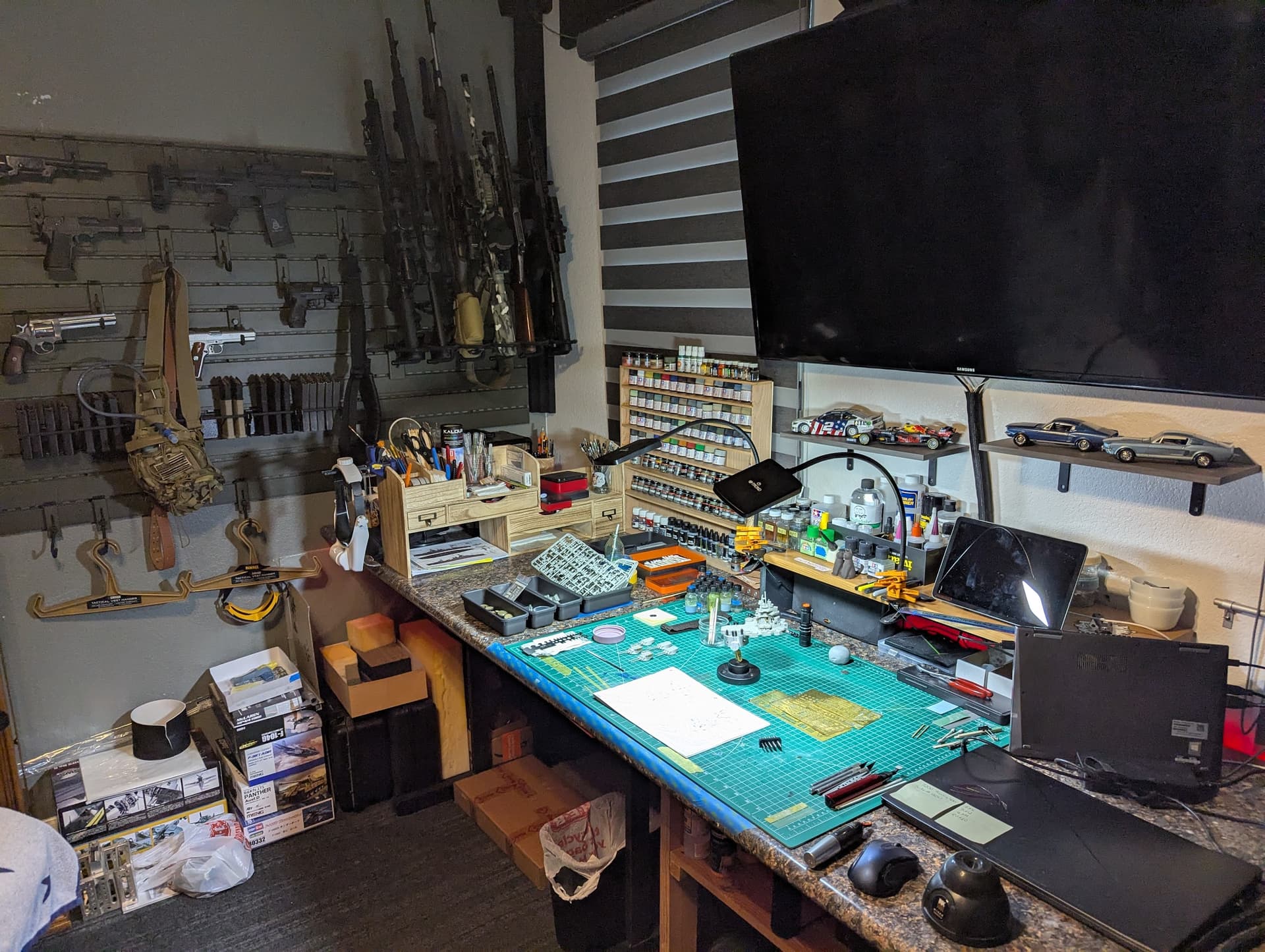 I have a third bay in my garage that has no garage door, so it is my work area. I built a custom workbench in an L shape along one huge corner. I augmented it with a Craftsman tool box which I built into one end of the bench. This is where I store all of my paints and other modeling supplies.